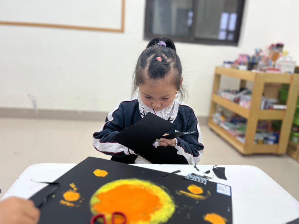材料:高光笔、黑色卡纸、黄色与橙色颜料、剪刀、海绵印章