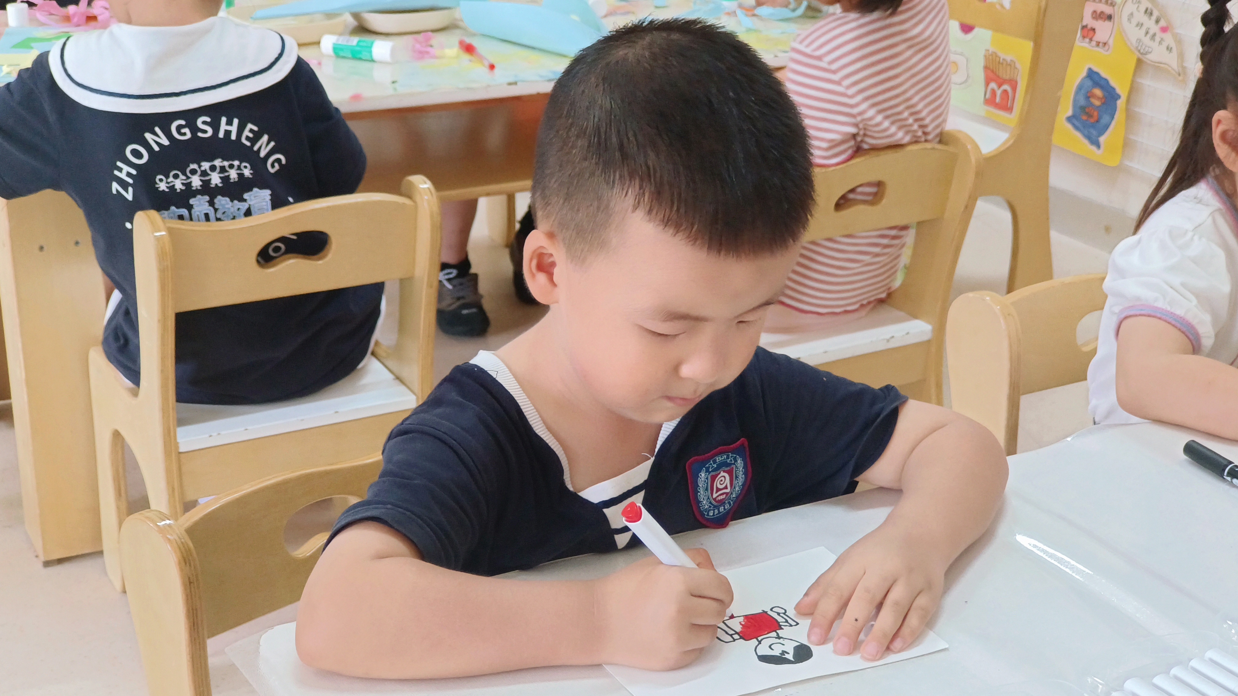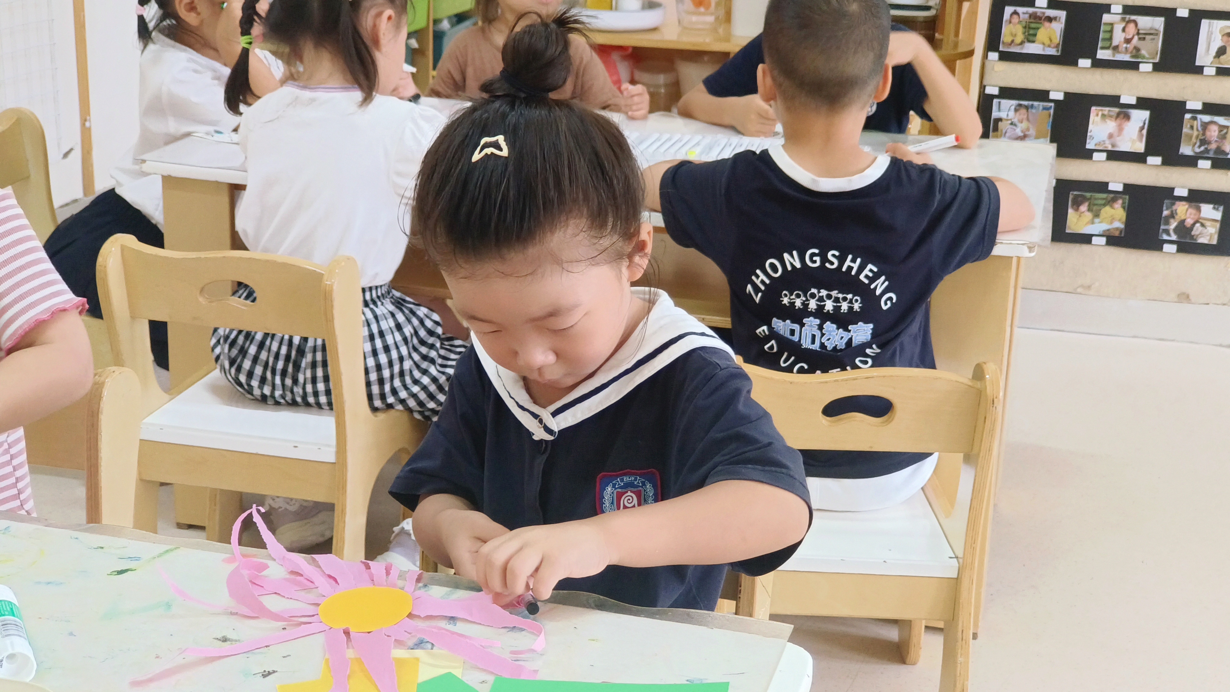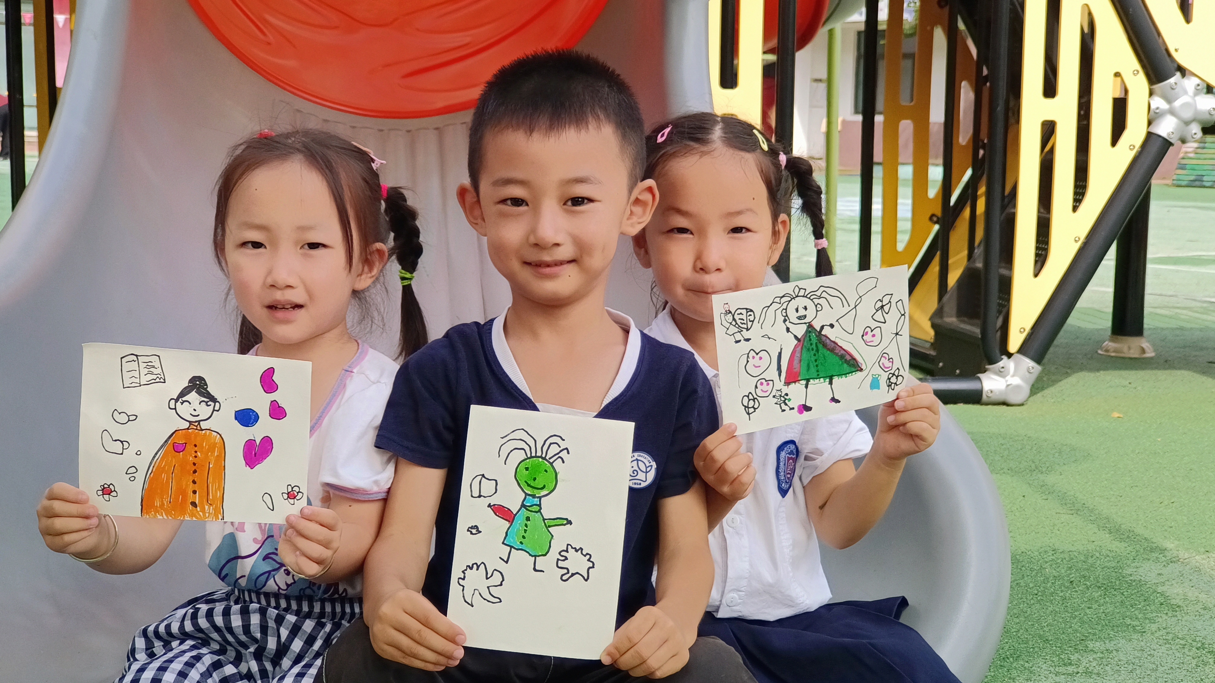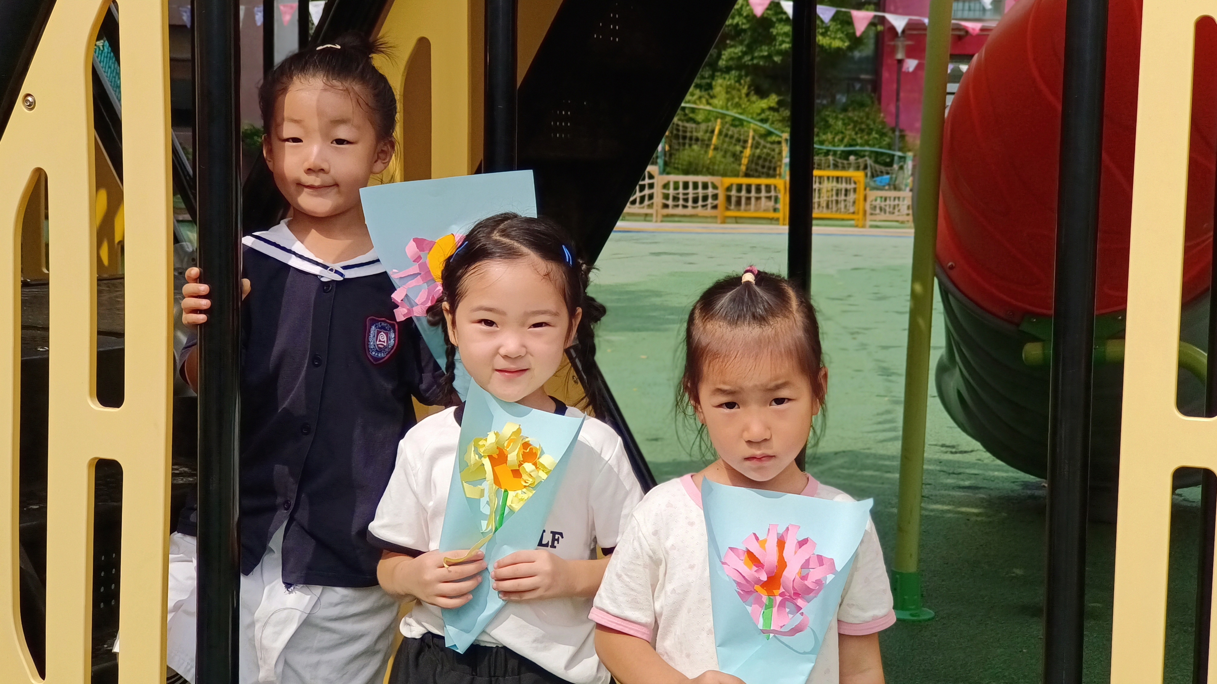 小朋友们用稚嫩的小手,描绘老师的模样,制作精美的剪纸花送给最爱的老师们!新生班的宝贝们,也在开学短短两周内适应了幼儿园生活,愉快的和老师们玩游戏,安静的听老师讲故事!