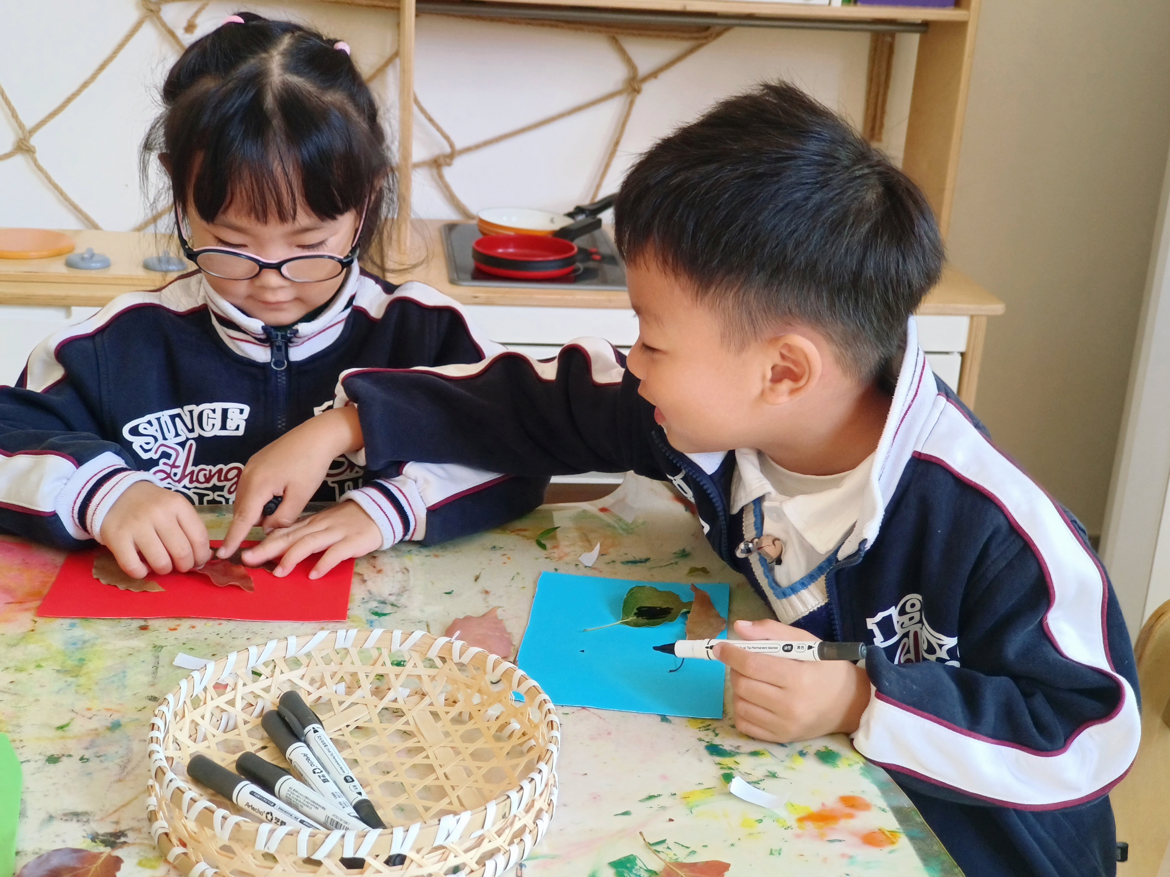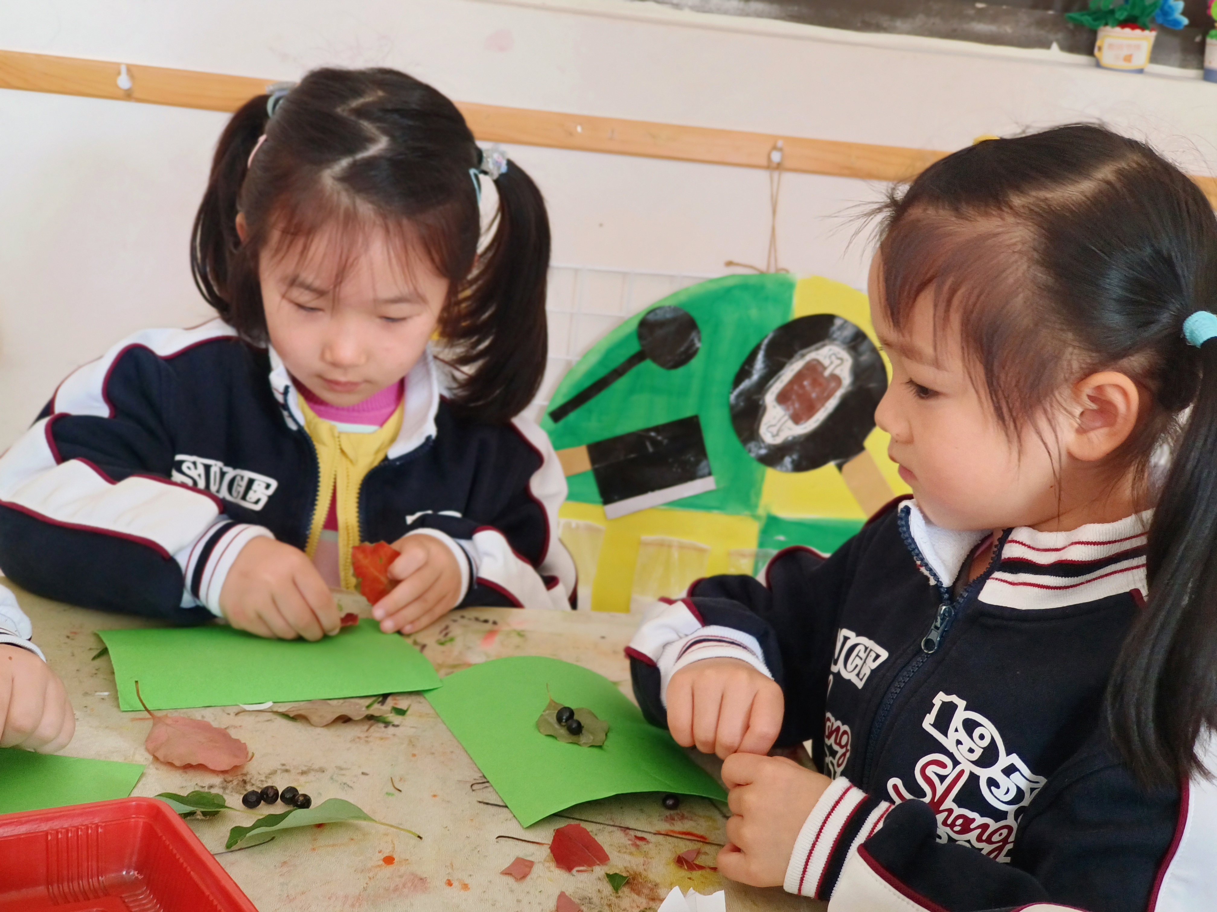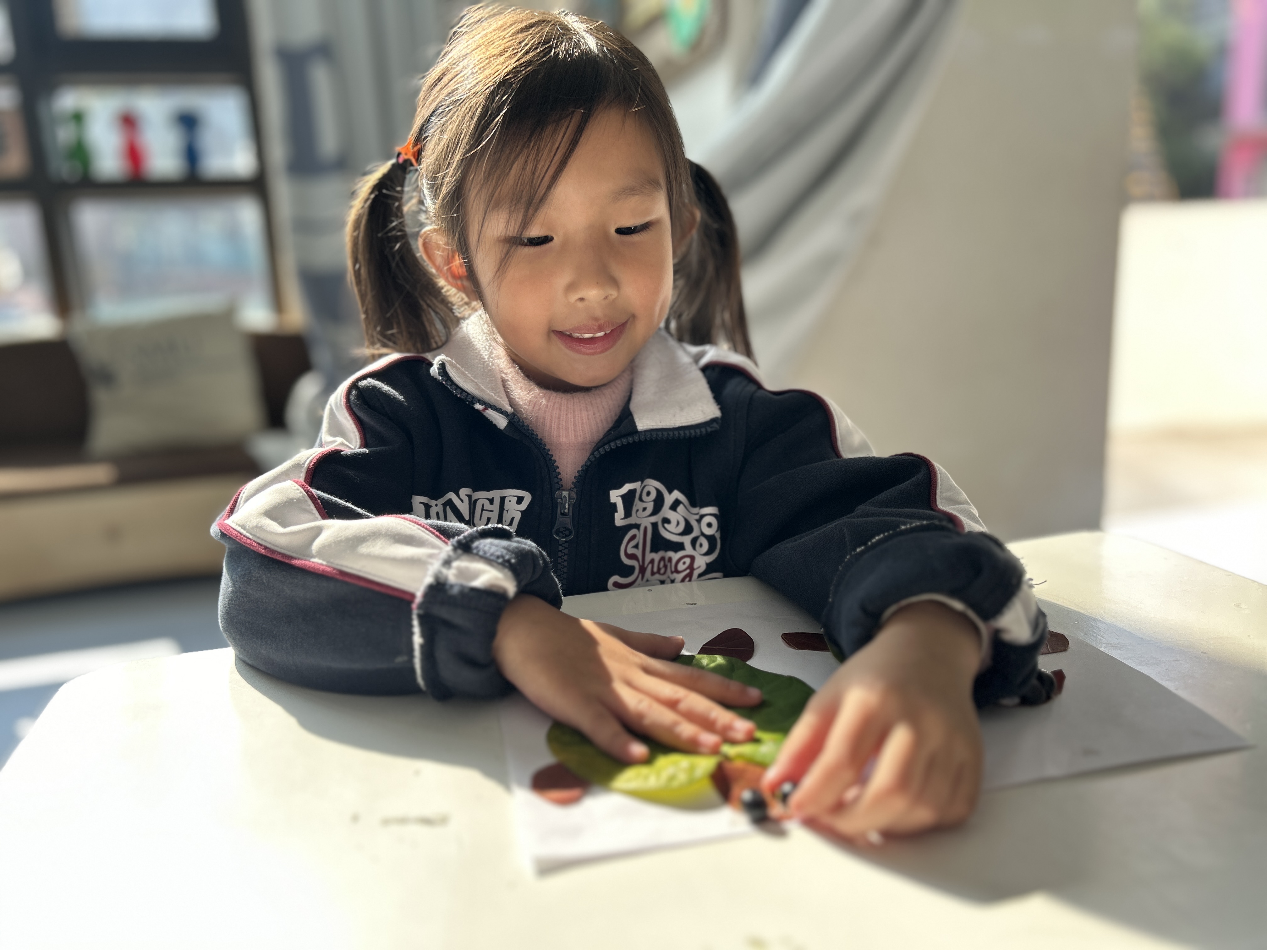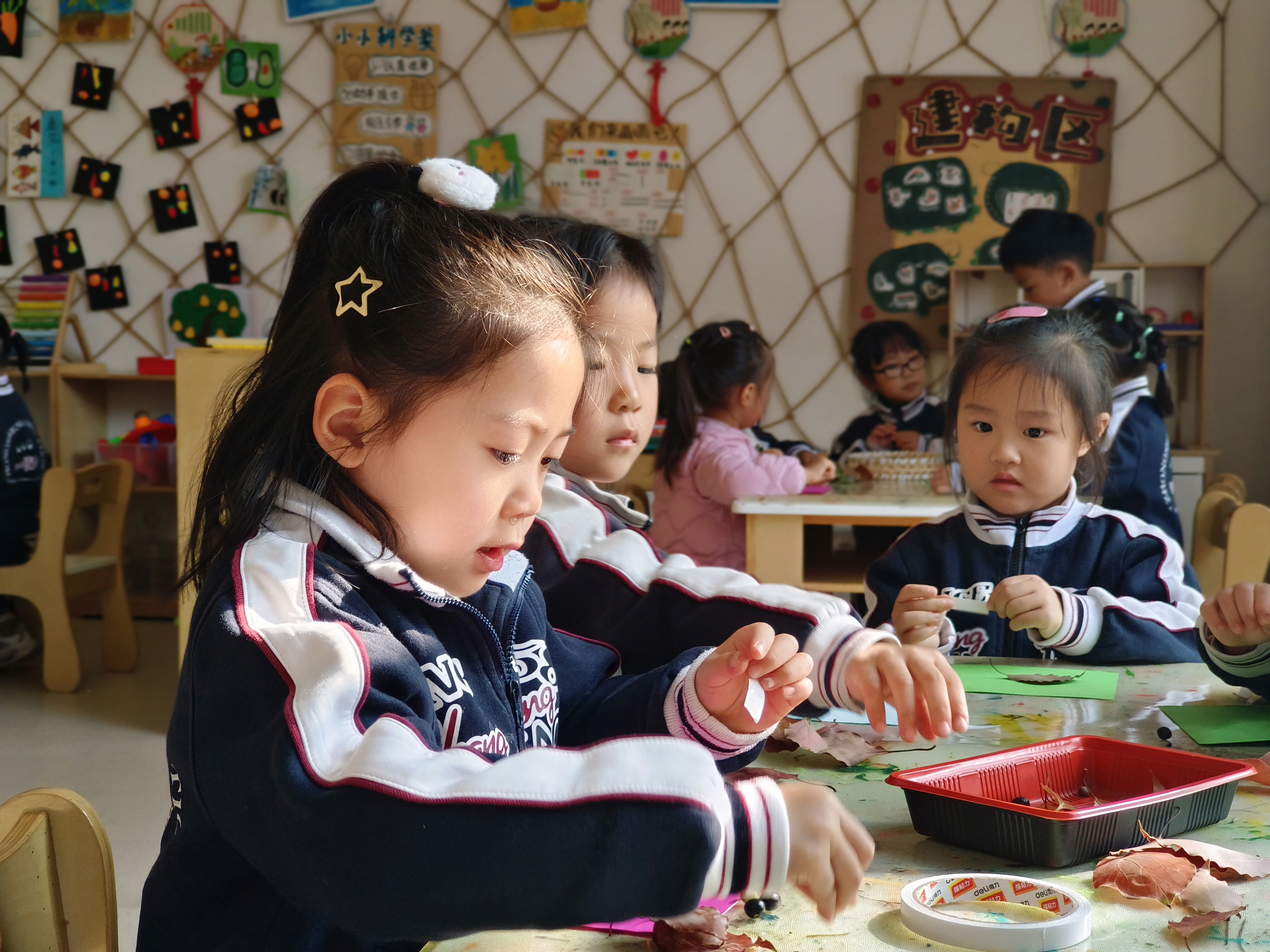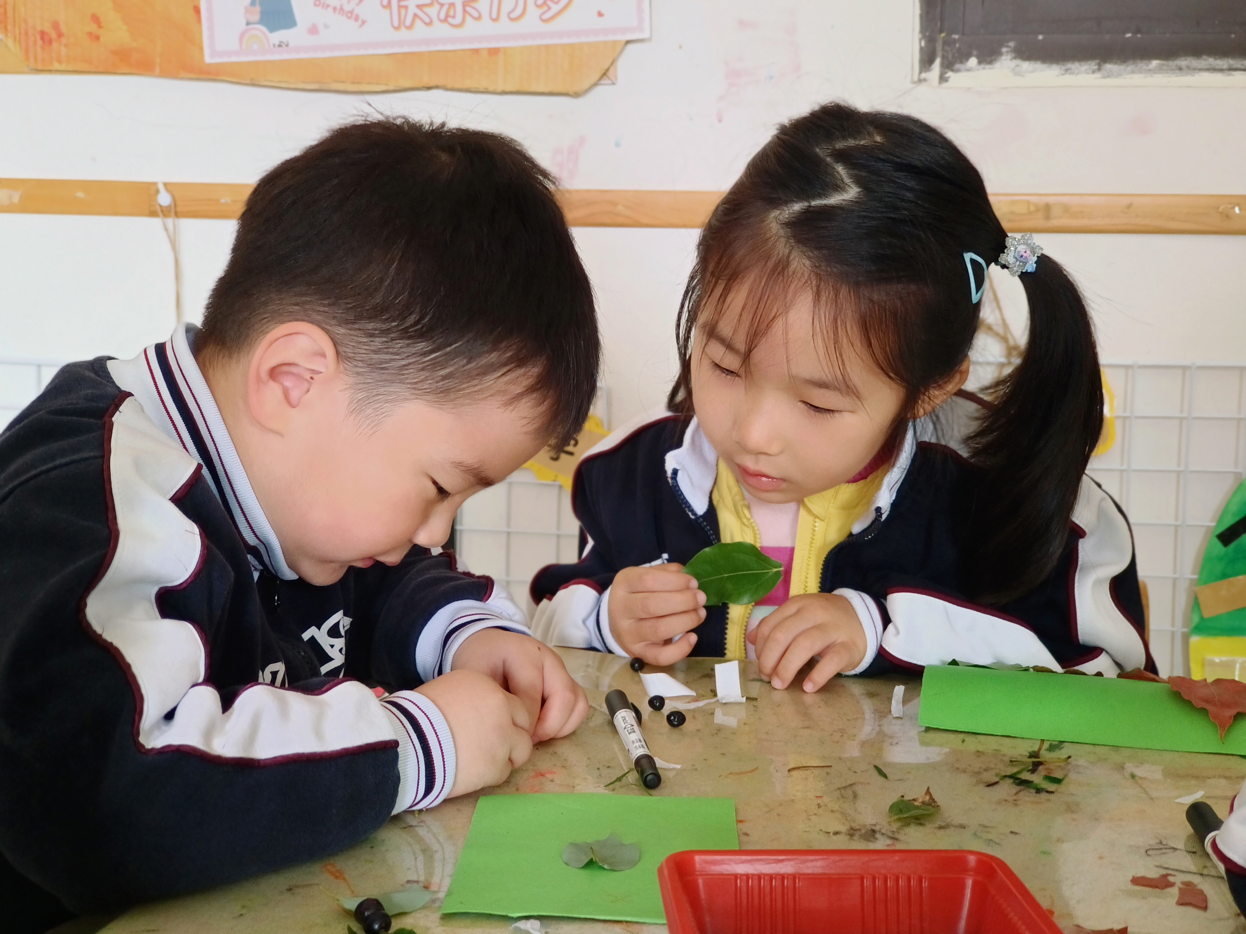 创作的过程中,孩子们发挥想象力,摆弄着手中的树叶,努力拼凑着自己想要的画面。