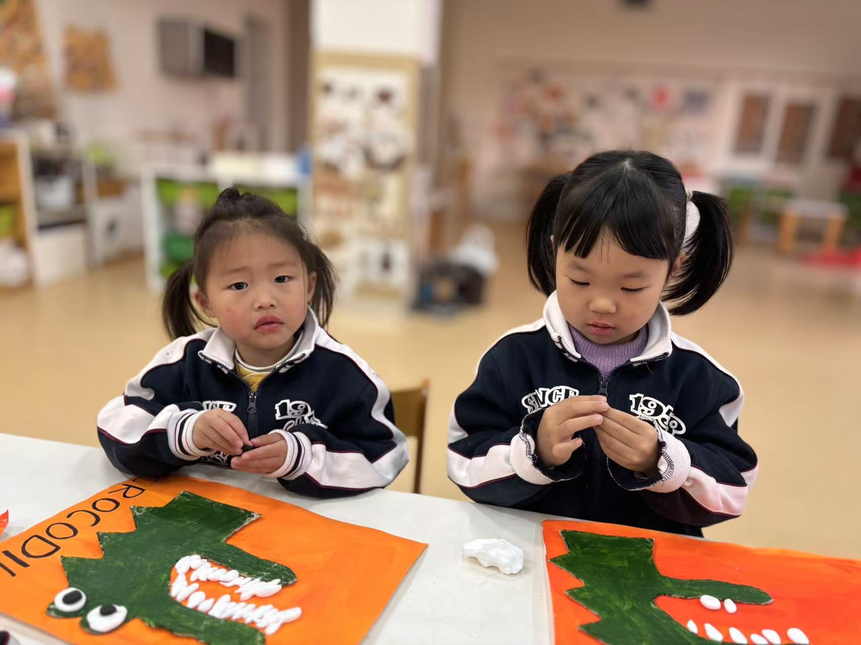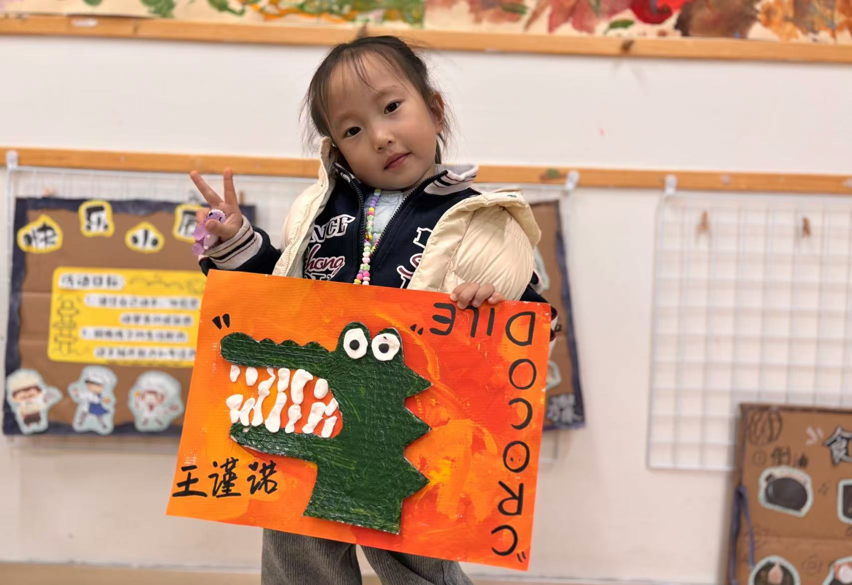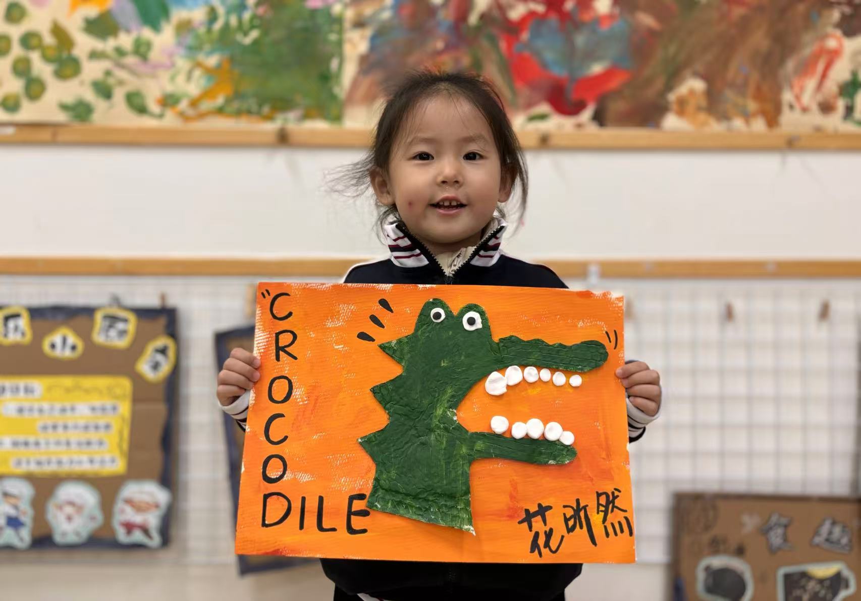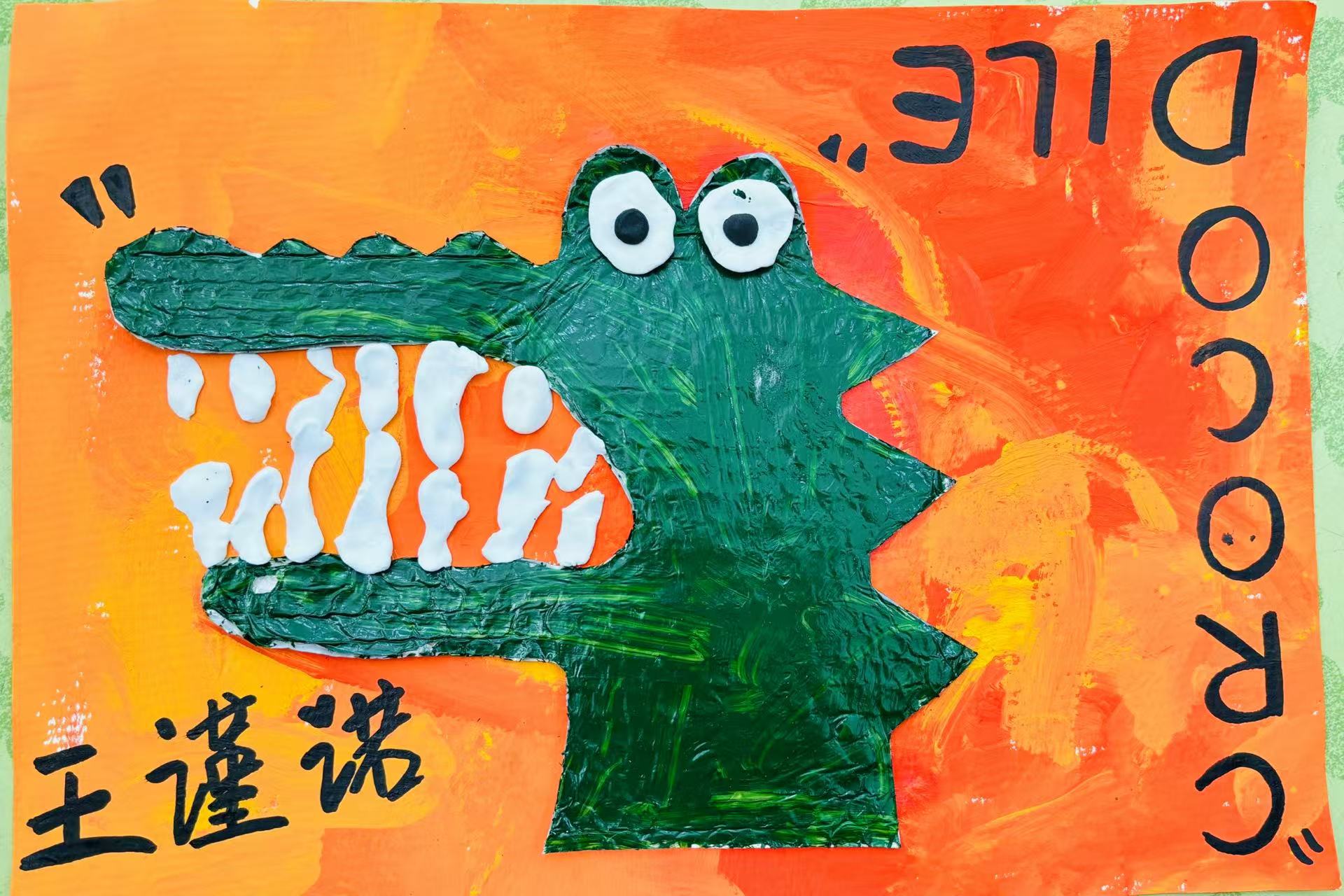 最后再用黏土将鳄鱼先生的牙齿做出来,看,孩子们画笔下的鳄鱼先生就像真的一样呢!让我们一起来欣赏一下宝贝们的创作吧!
