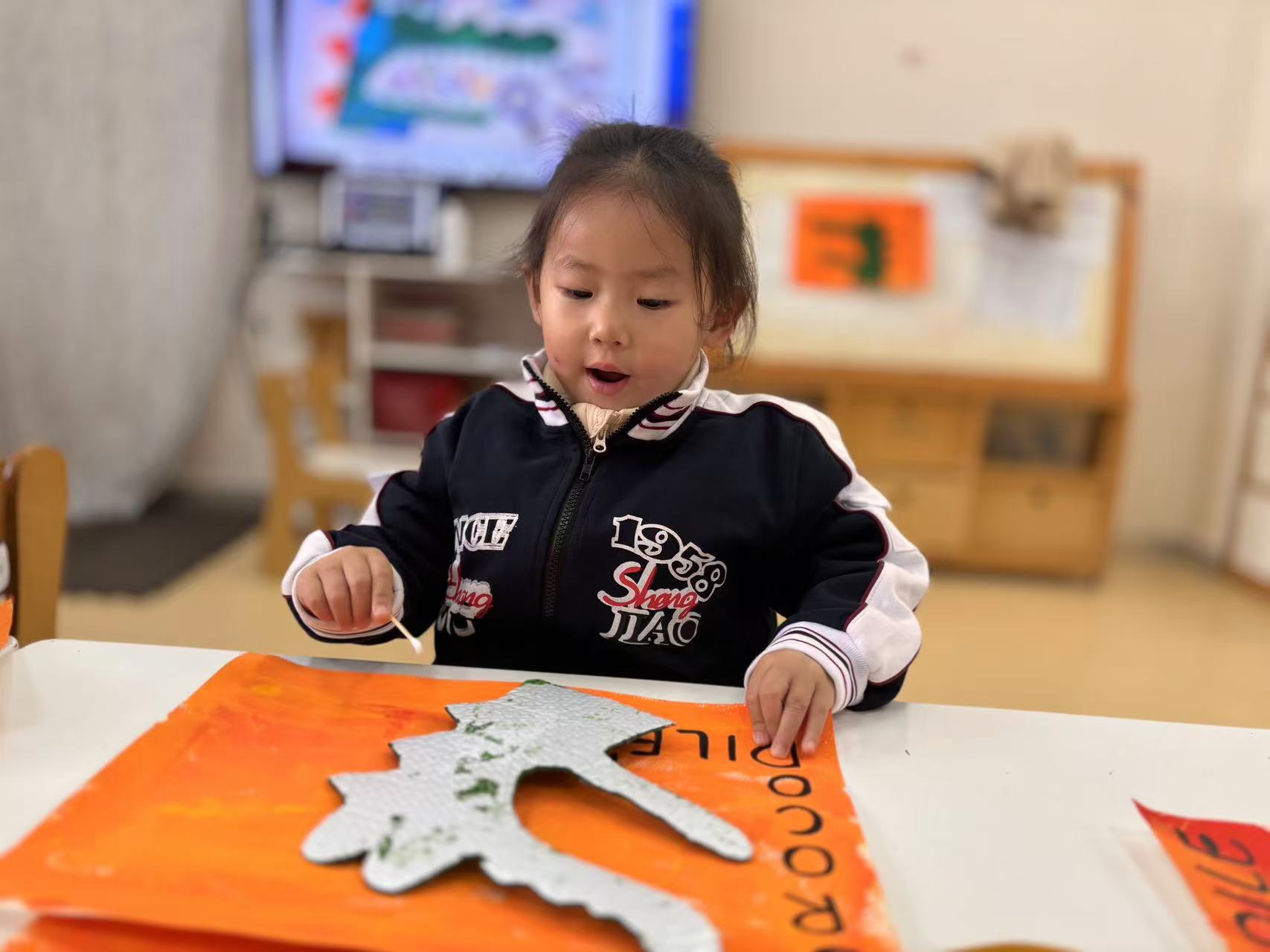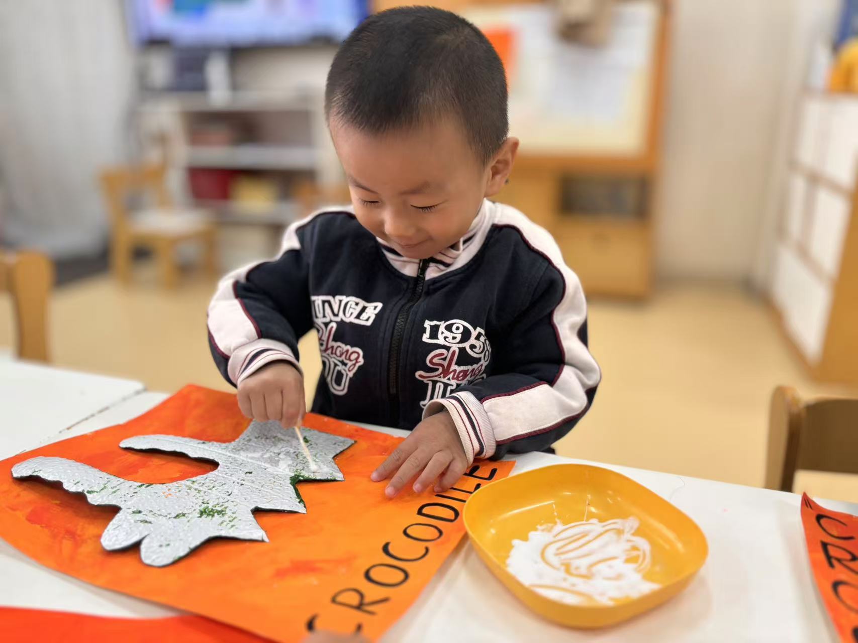 我们拿起画笔,在泡泡纸上面涂上漂亮的颜色,再将涂好颜色的鳄鱼粘贴在画纸上面,鳄鱼先生创意画就做好了。瞧!一个个普通的泡泡纸,像被施了魔法一样,变成一个个与众不同的艺术品。