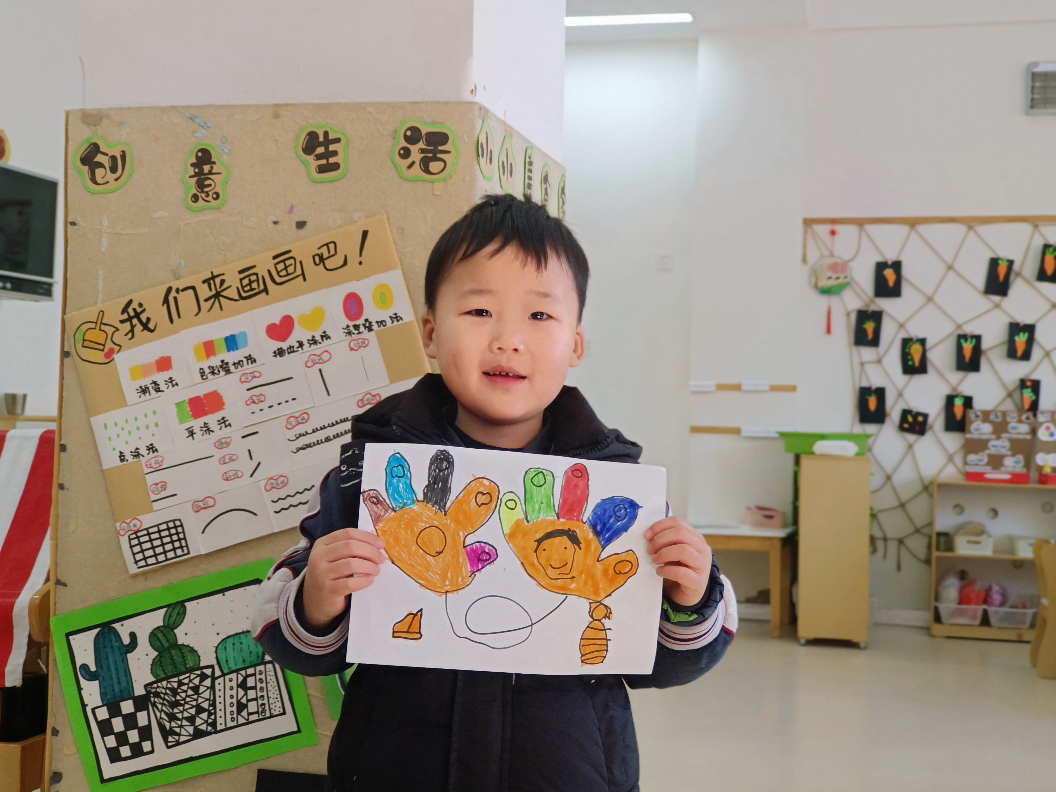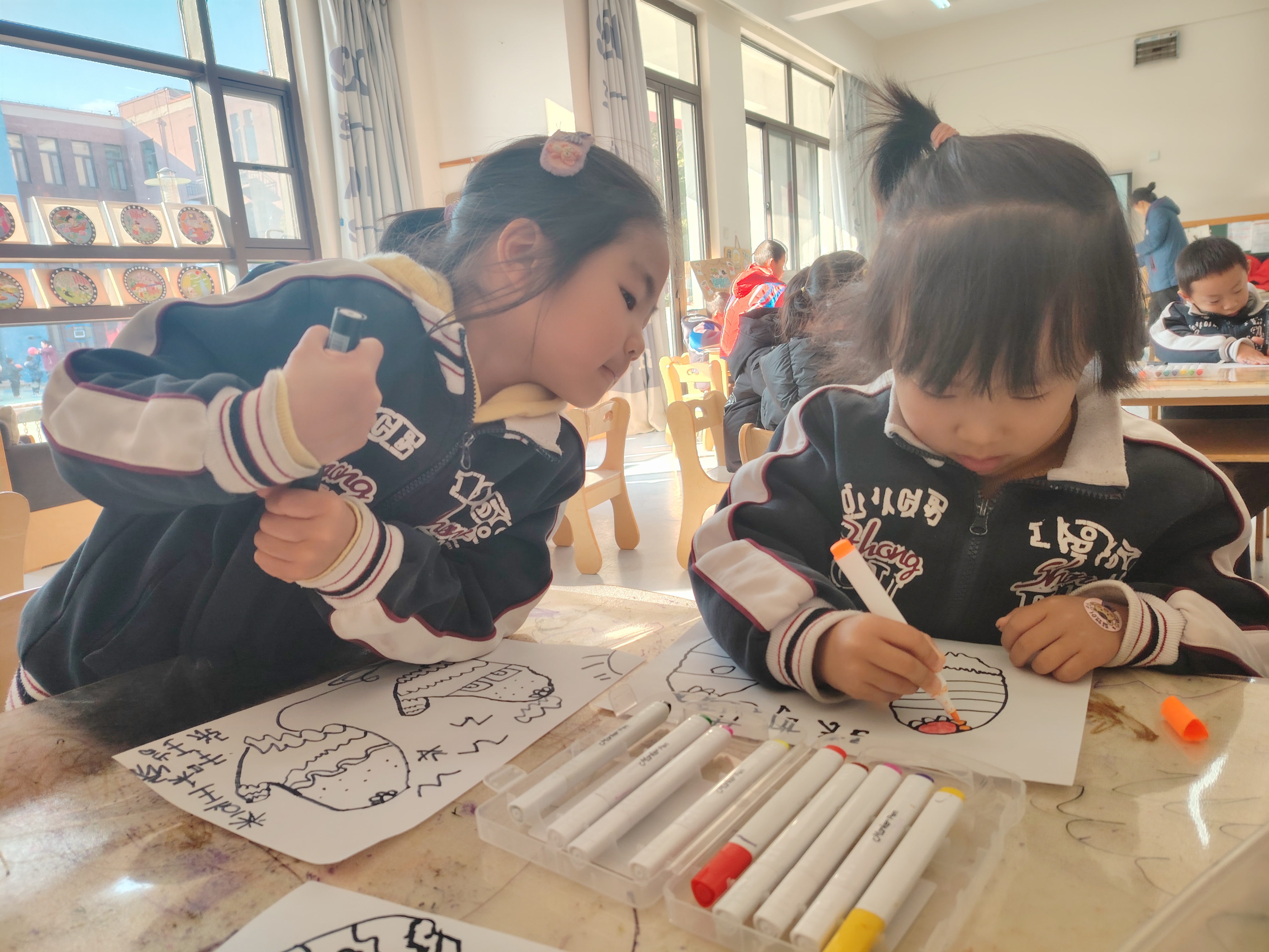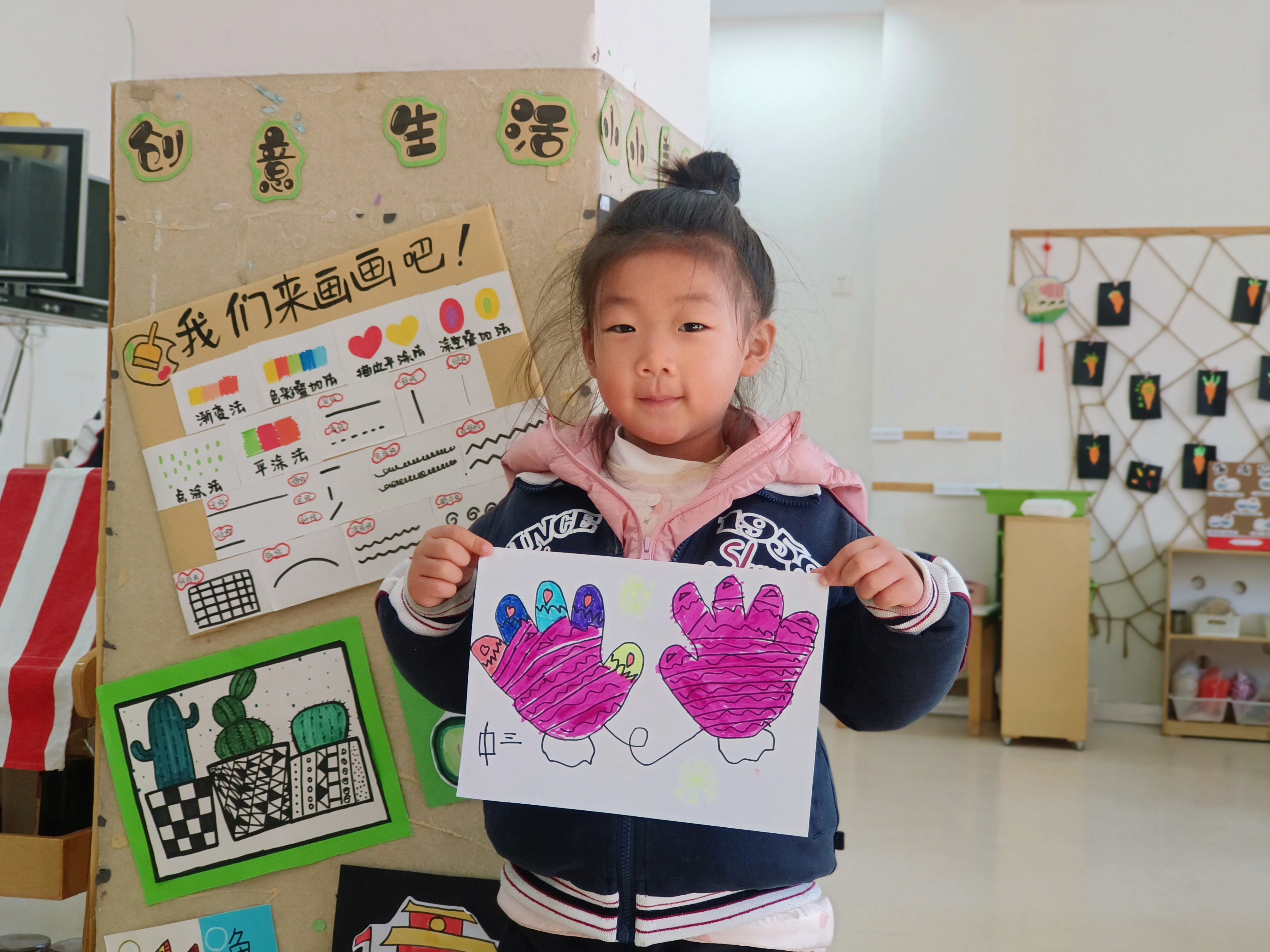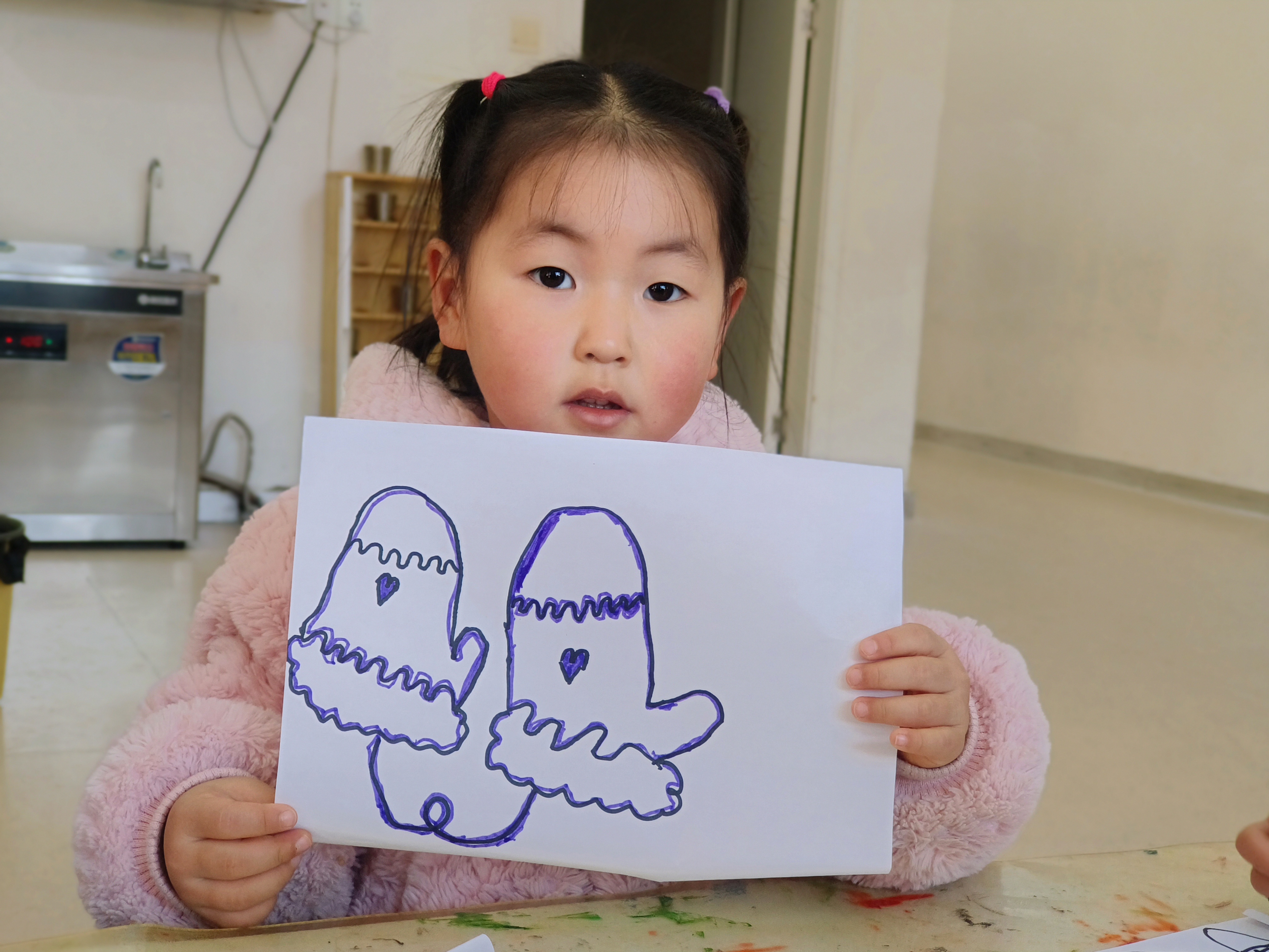 宝贝们化身小小设计师,拿起画笔,沿着自己稚嫩的小手画出手套的轮廓,添上自己想要的花纹和图案,涂上喜爱的颜色,一双双小手套就跃然呈现在画面上啦!