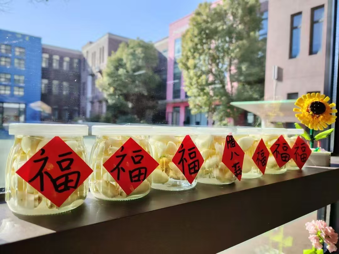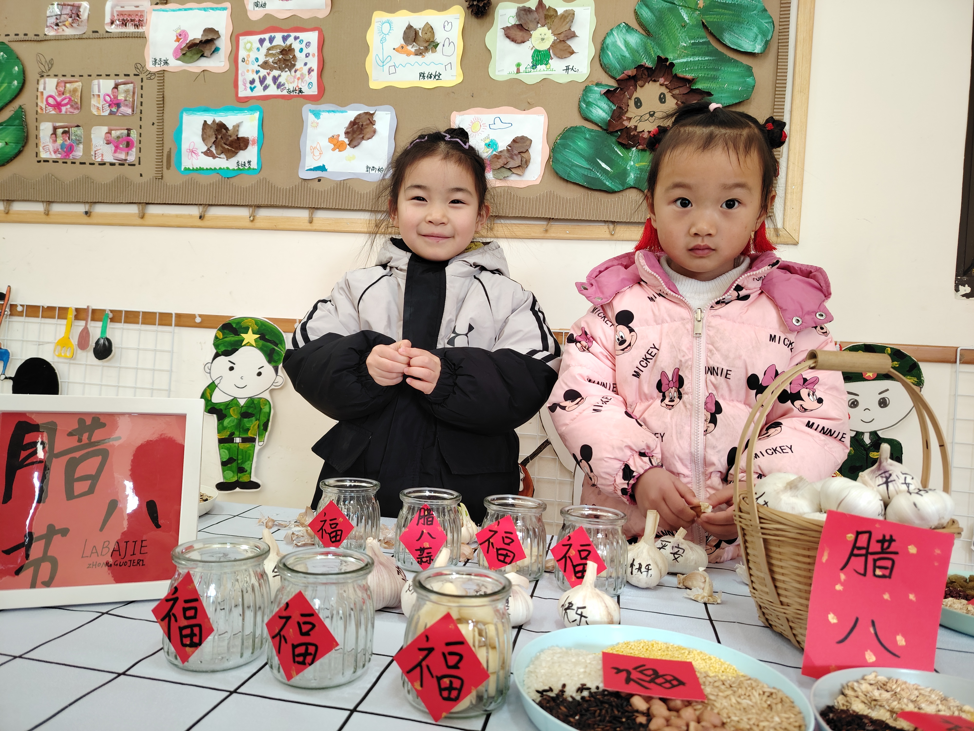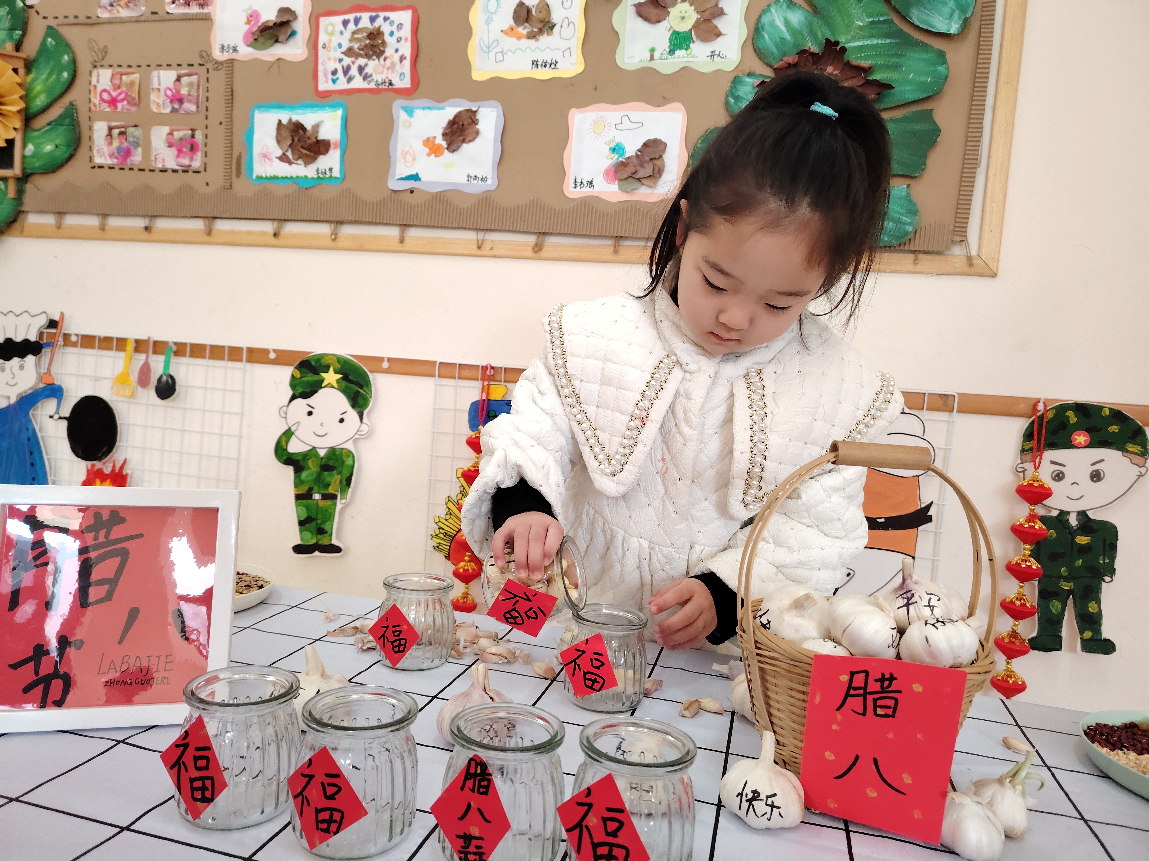 腊八节除了喝腊八粥,北方民间还会泡腊八蒜,被醋泡过的蒜,辣味淡了很多,连小朋友们也可以吃上几瓣。通过老师的讲解,小朋友还了解吃腊八蒜,可以防寒,预防感冒哦!