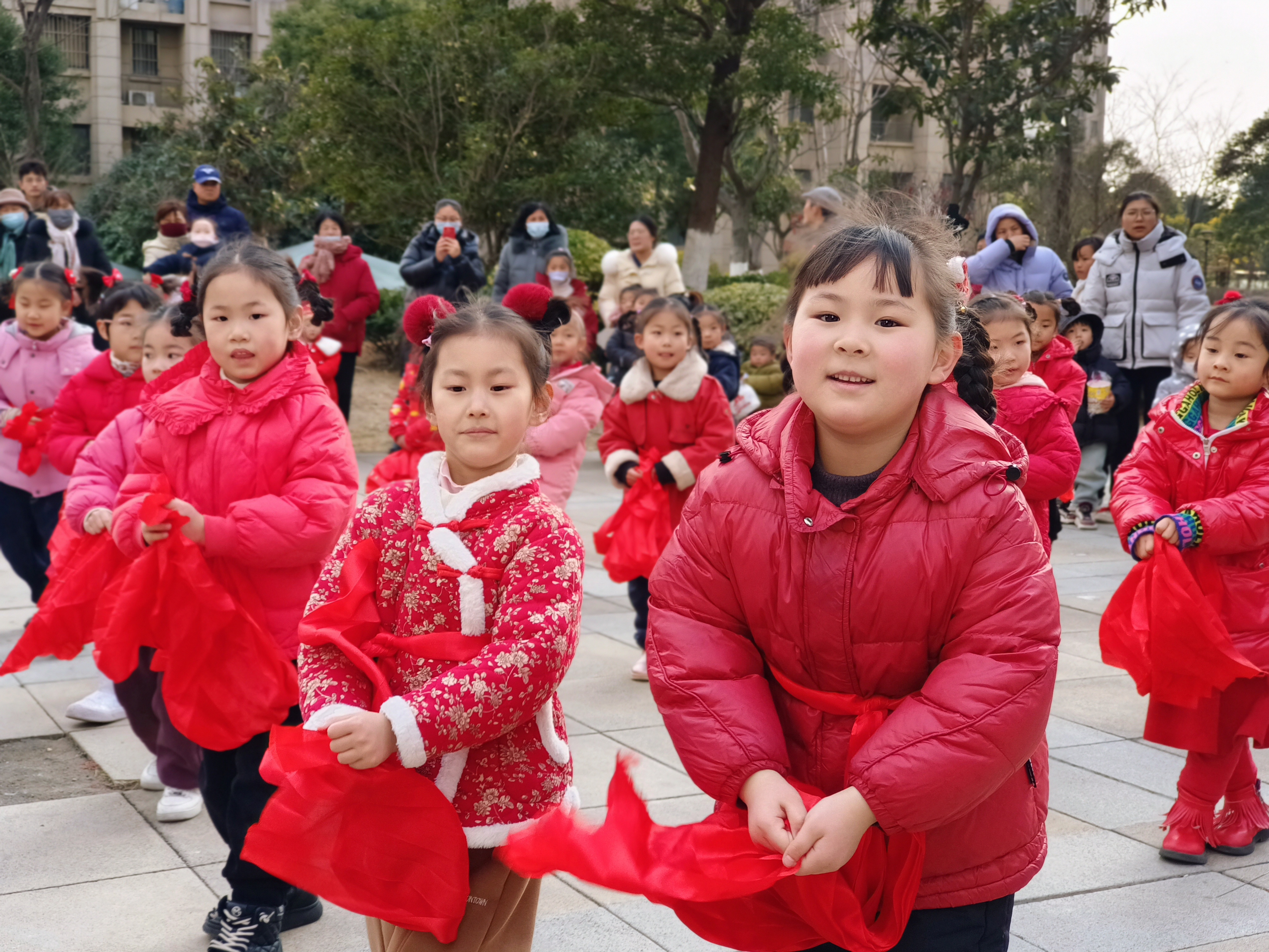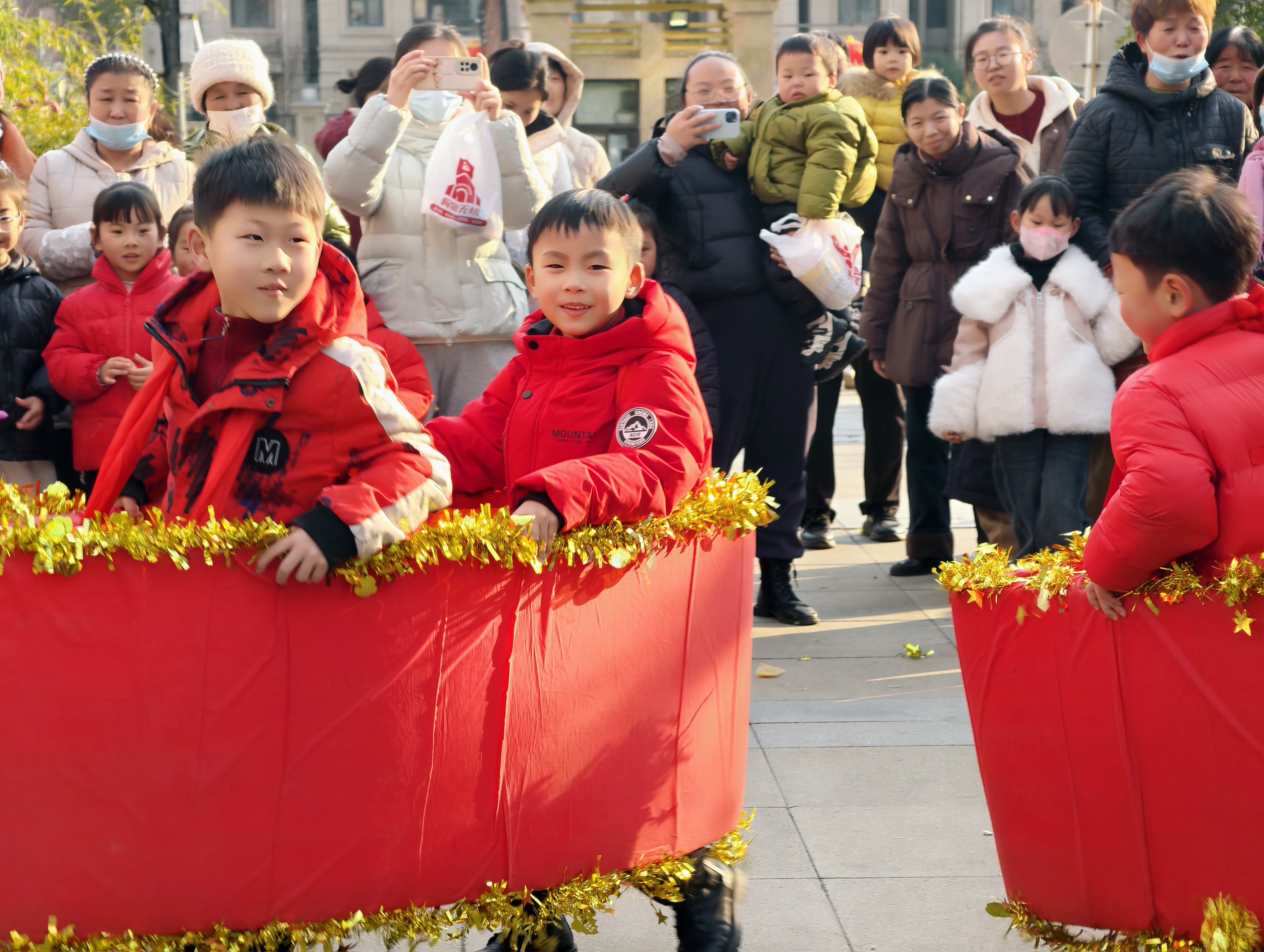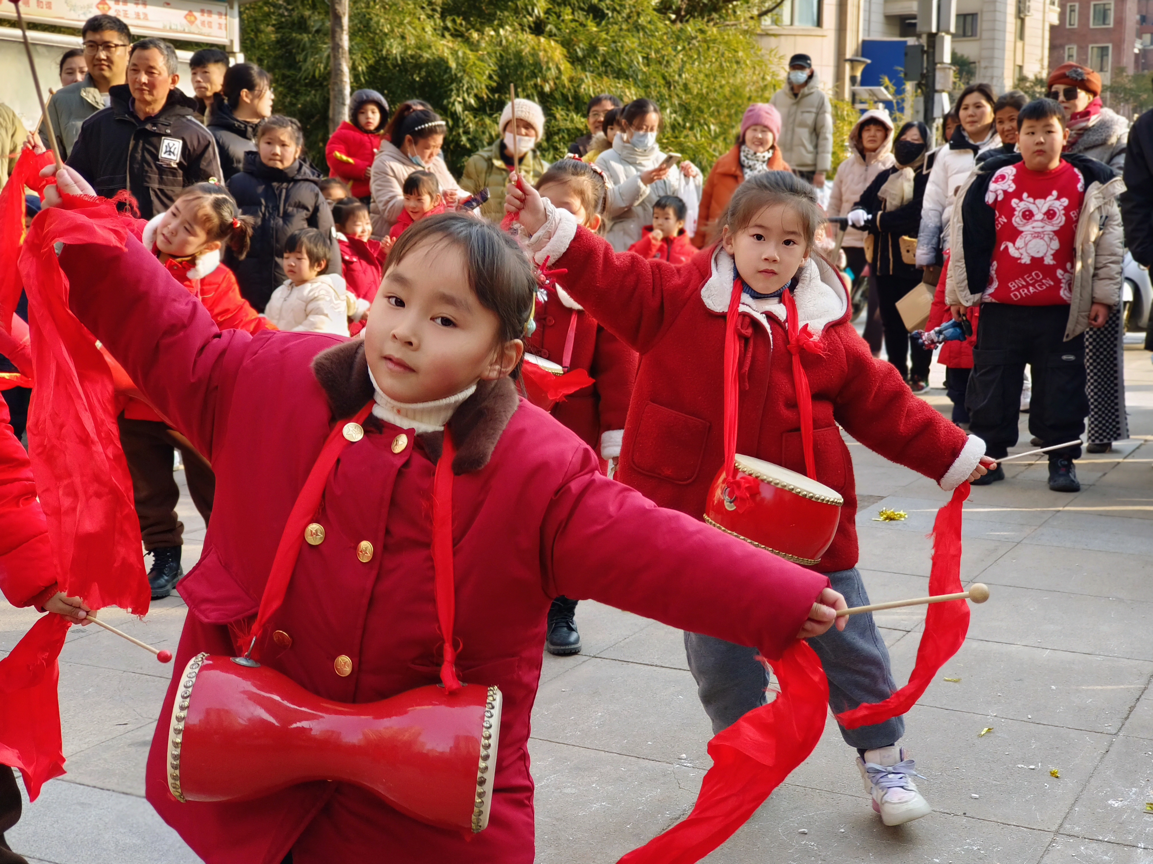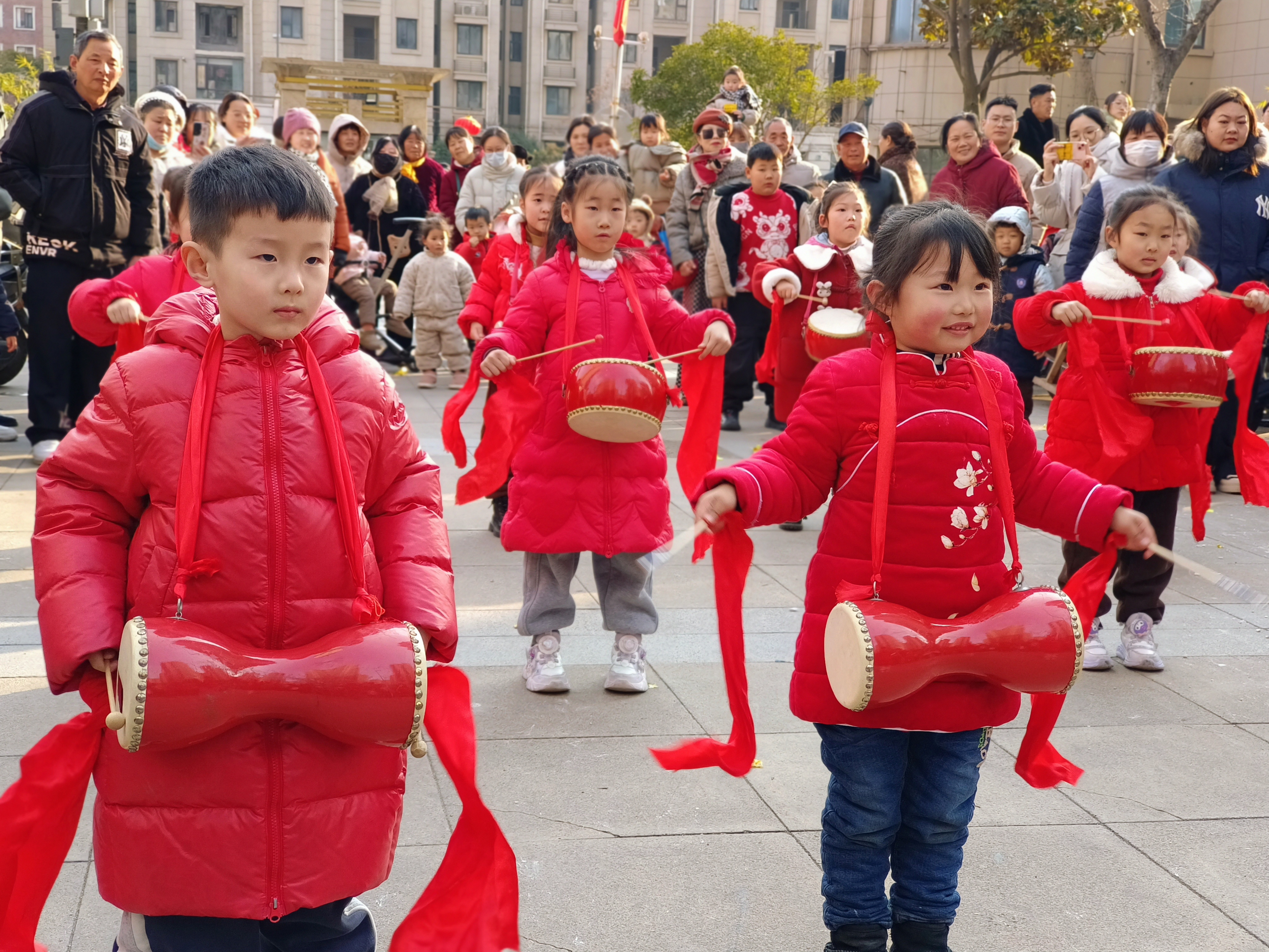 活动中,孩子们走进社区,热情洋溢的表演扭秧歌、划旱船、打腰鼓、舞龙等传统民间习俗,认真的模样、喜庆的演出形式,赢得现场阵阵掌声!
