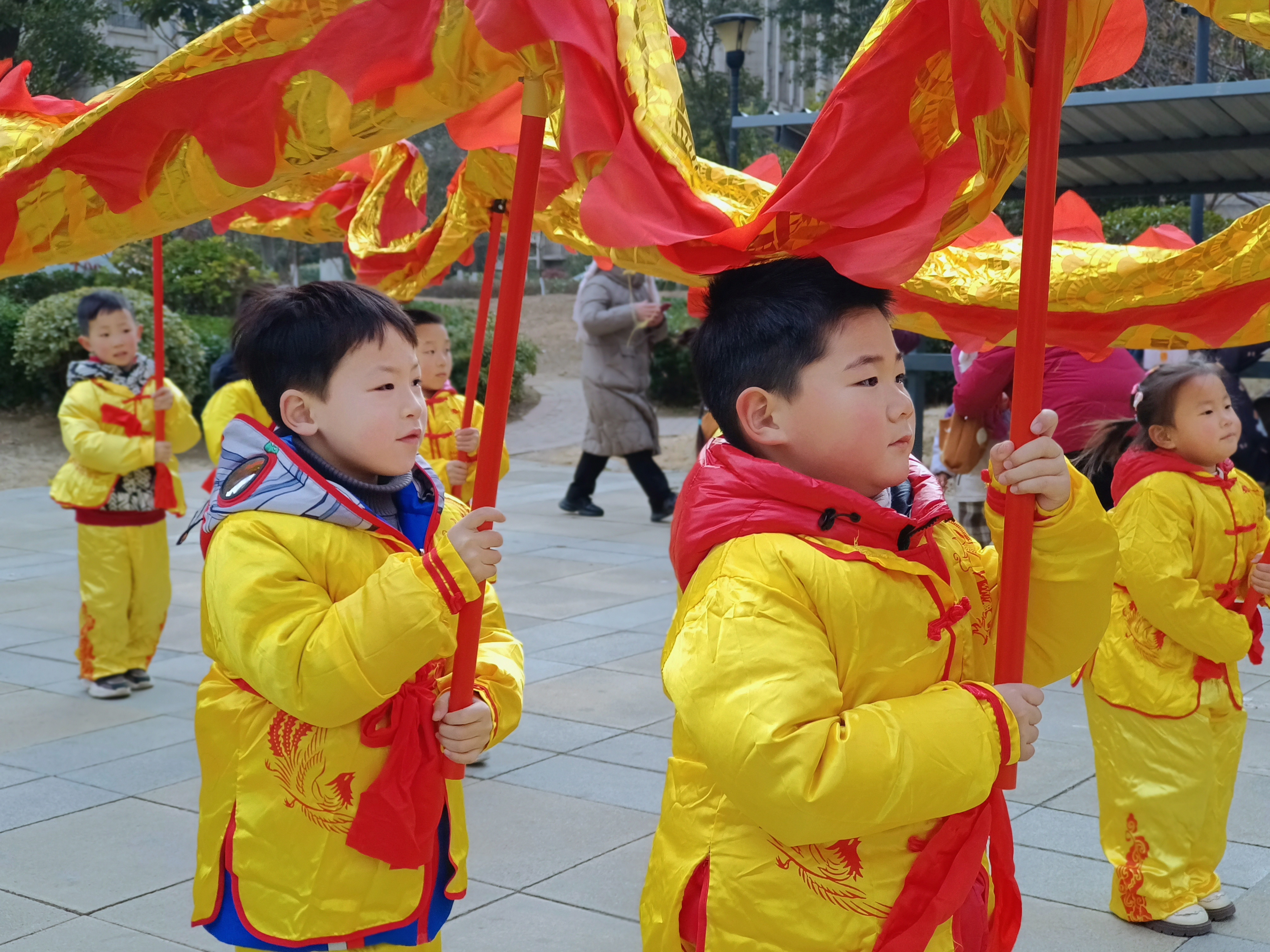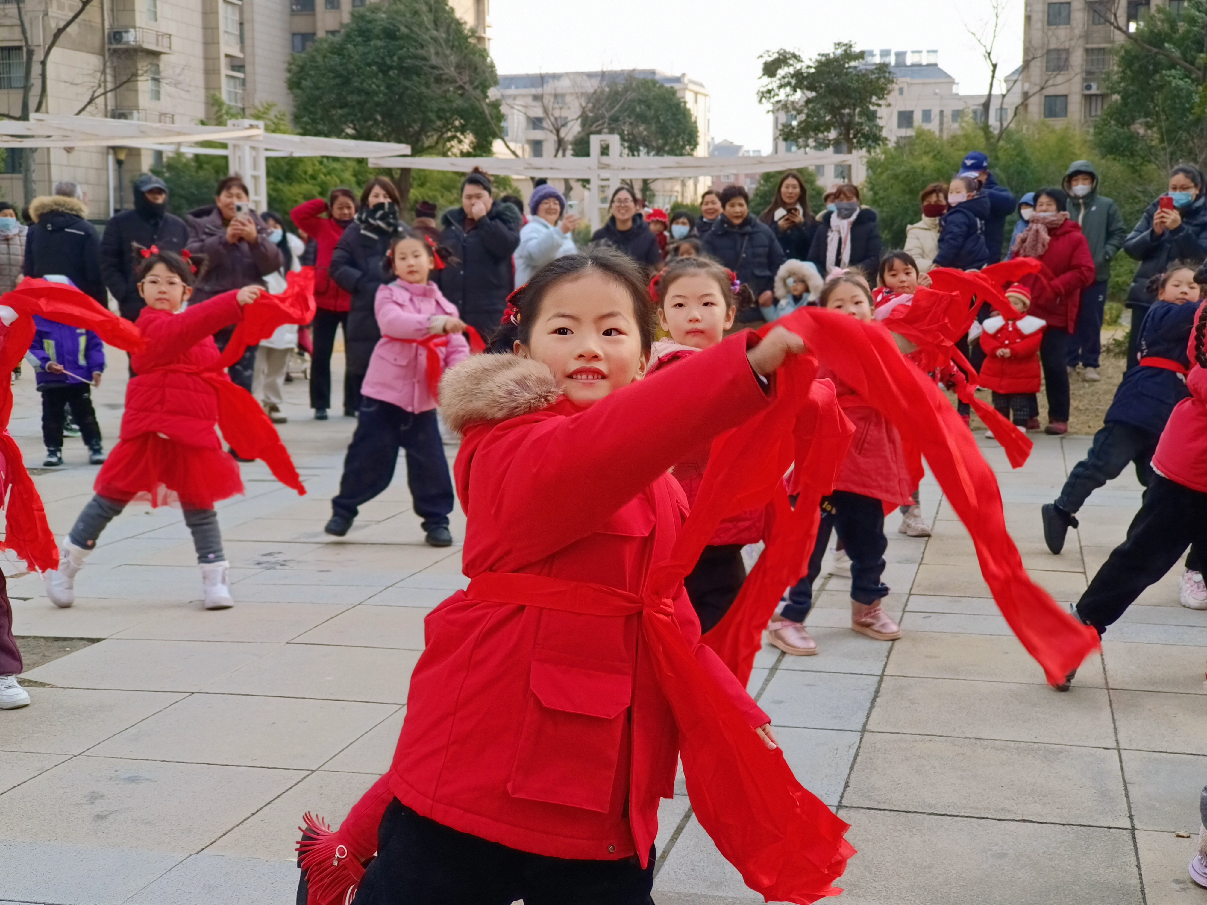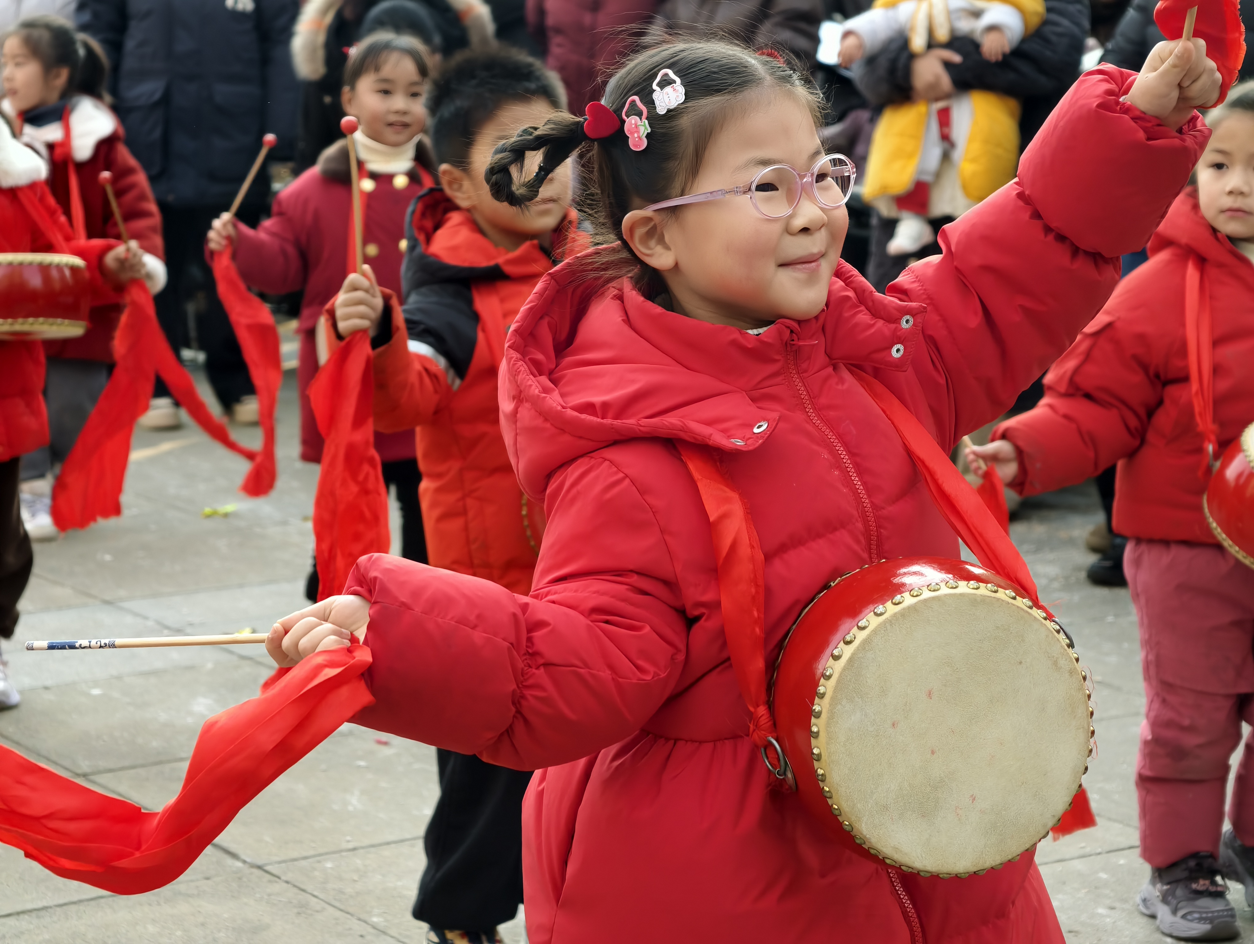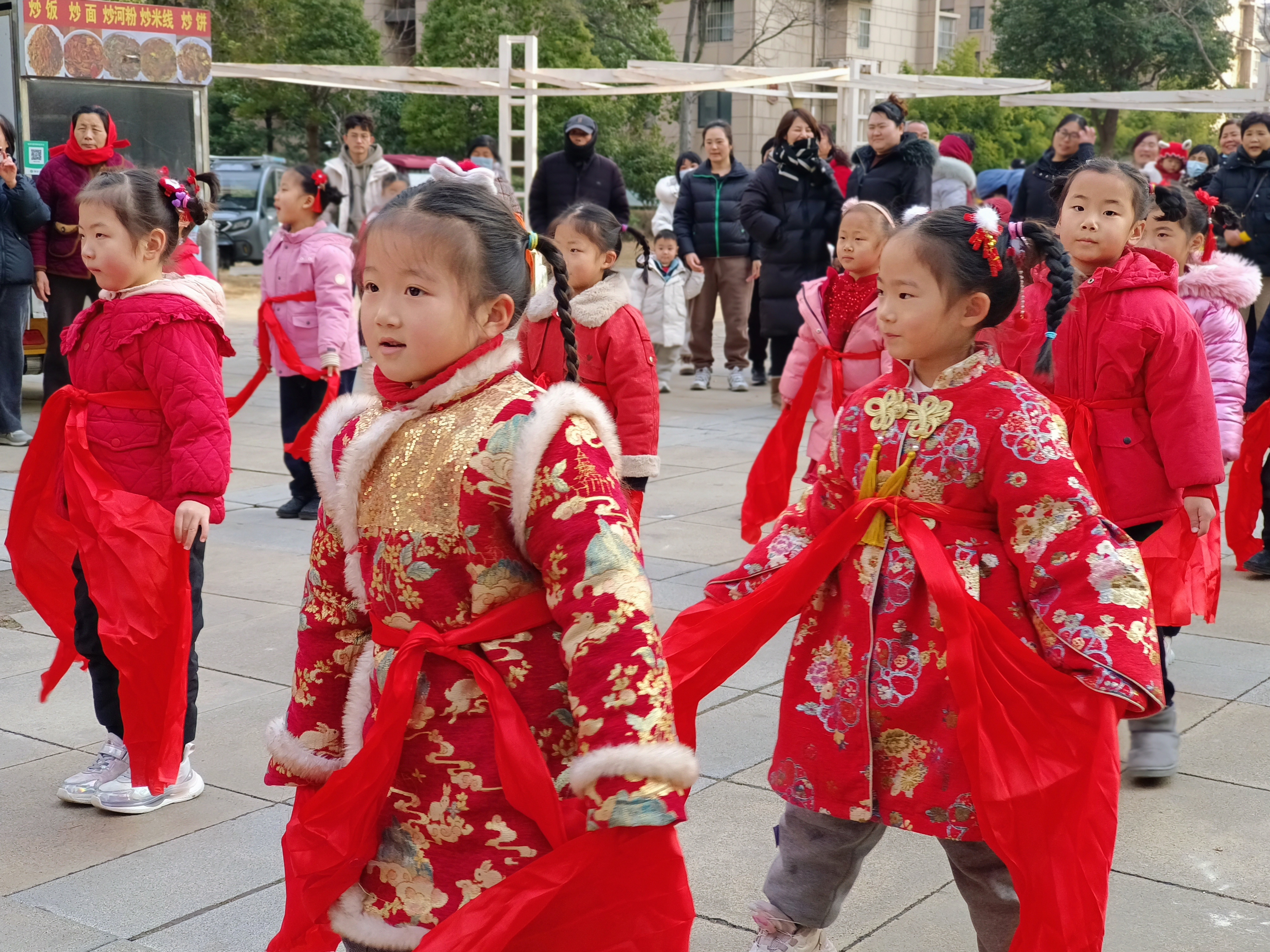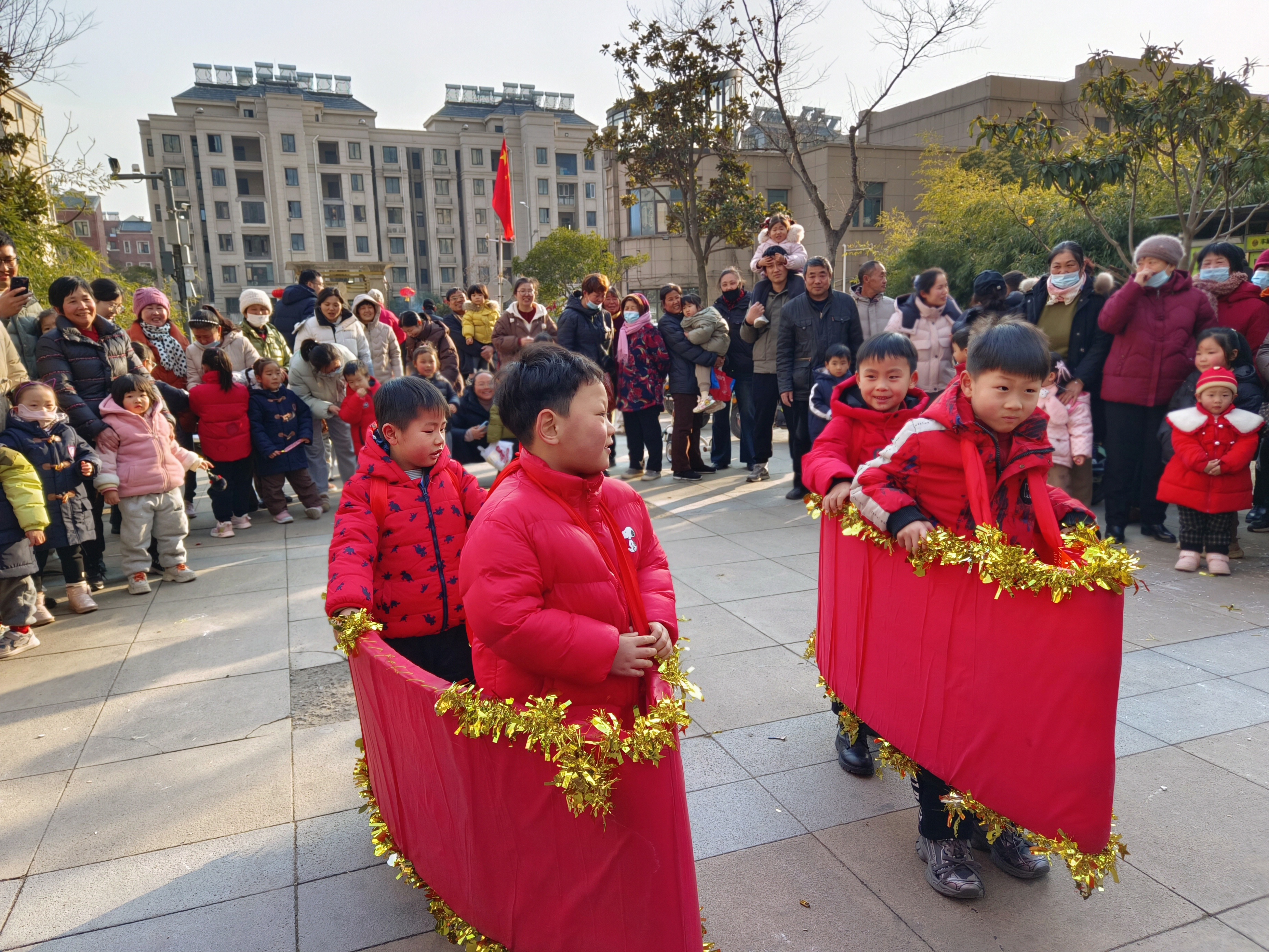 活动中,孩子们走进社区,热情洋溢的表演扭秧歌、划旱船、打腰鼓、舞龙等传统民间习俗,认真的模样、喜庆的演出形式,赢得现场阵阵掌声!