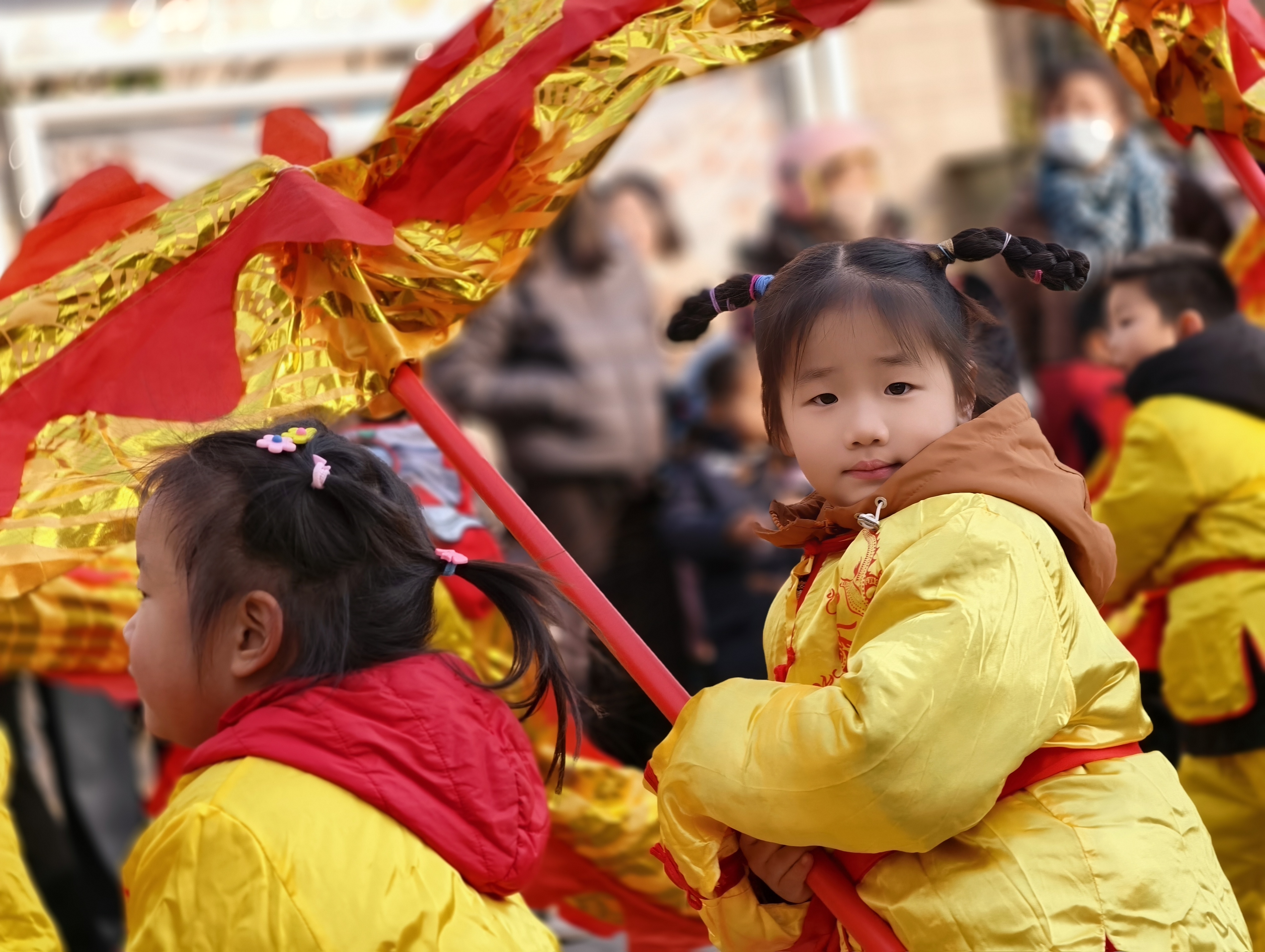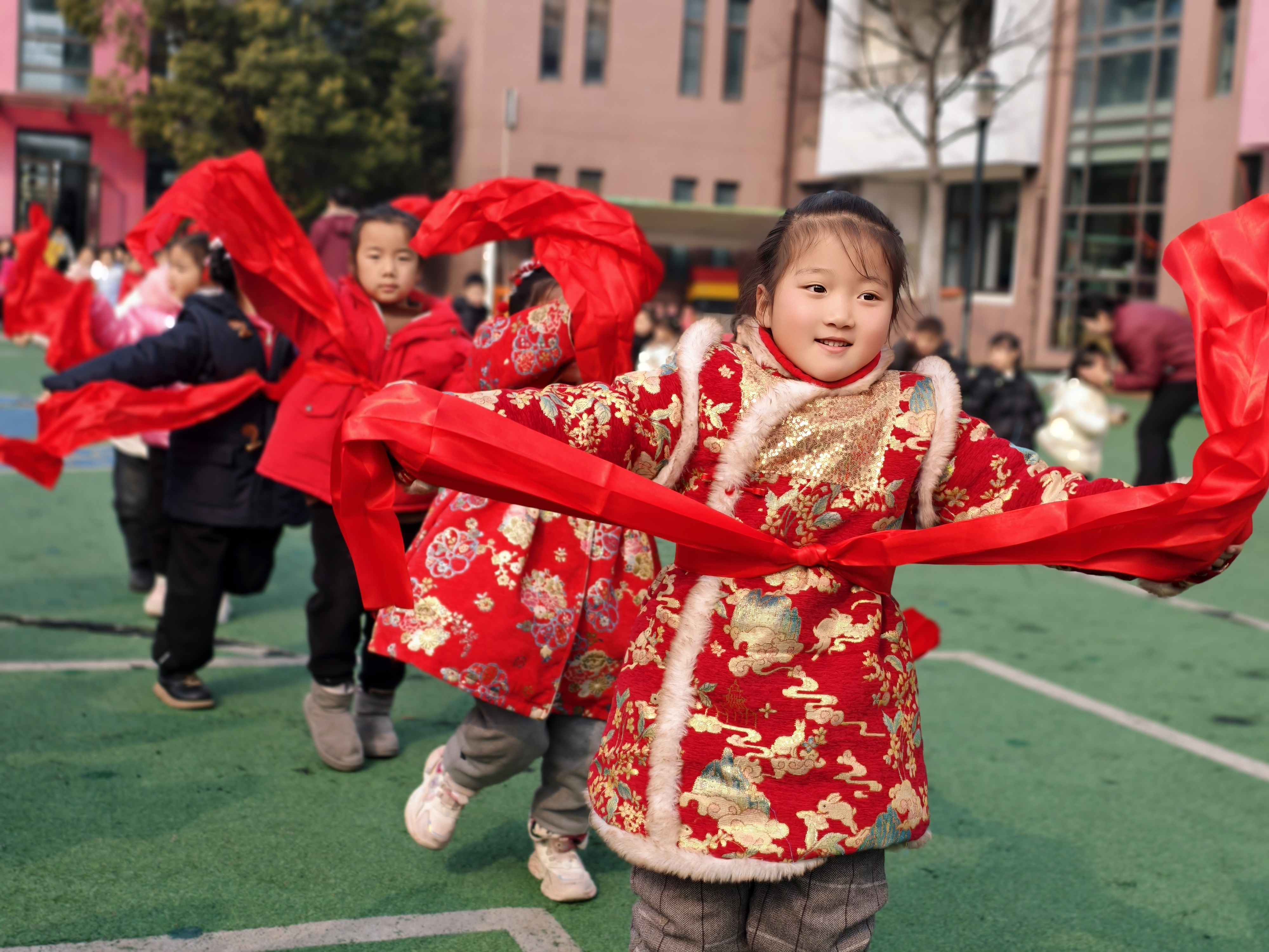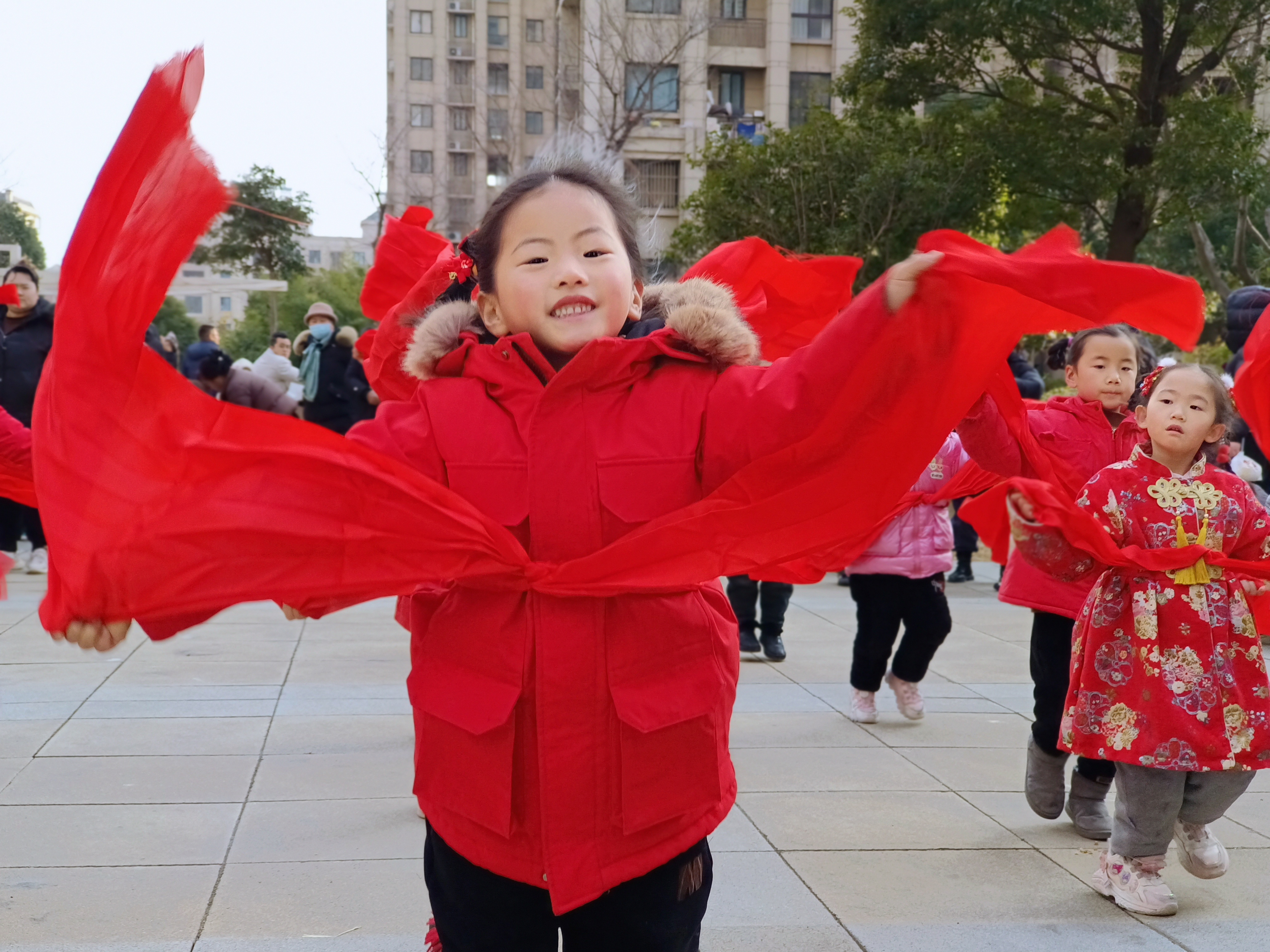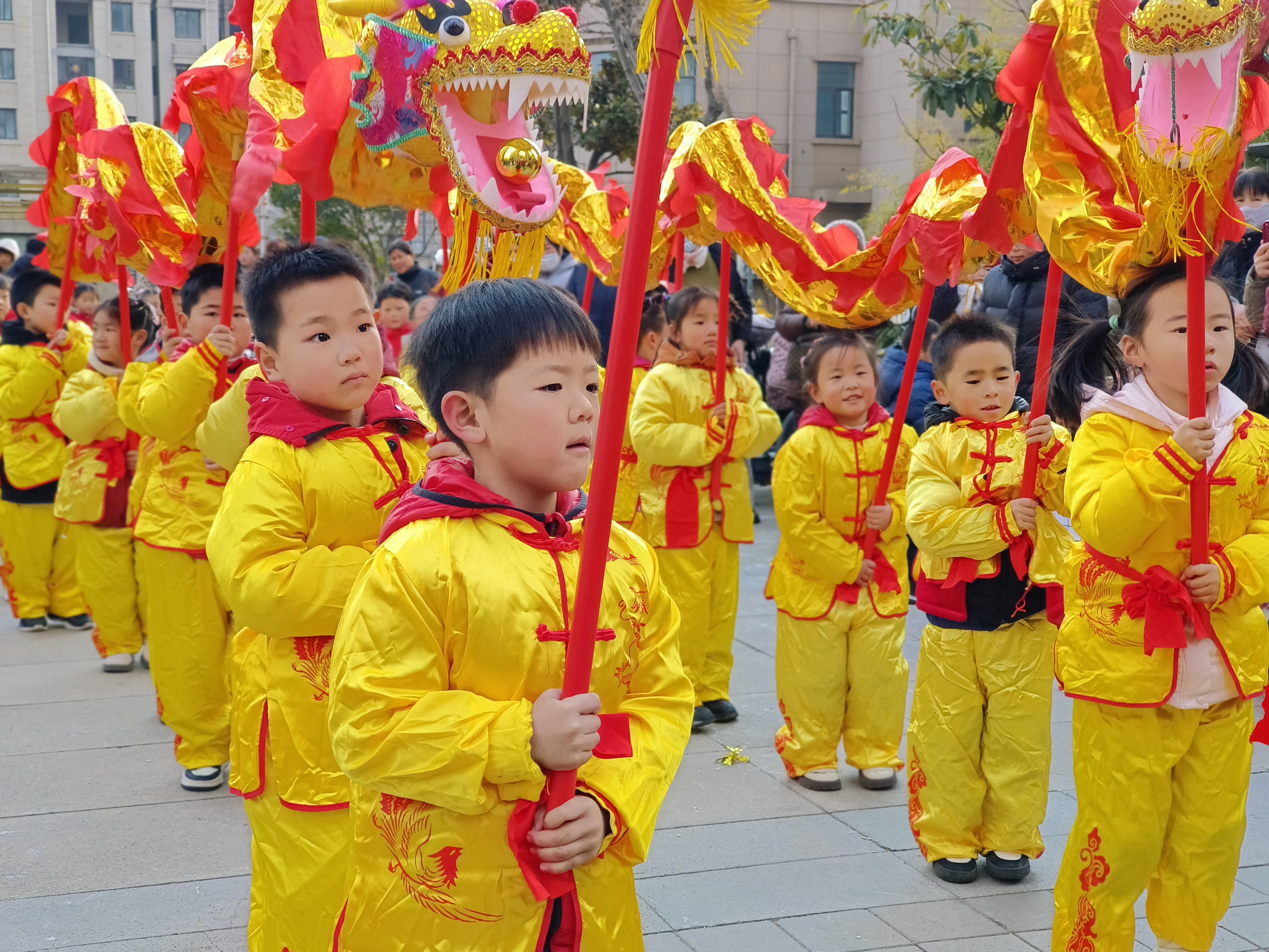 活动中,孩子们走进社区,热情洋溢的表演扭秧歌、划旱船、打腰鼓、舞龙等传统民间习俗,认真的模样、喜庆的演出形式,赢得现场阵阵掌声!
