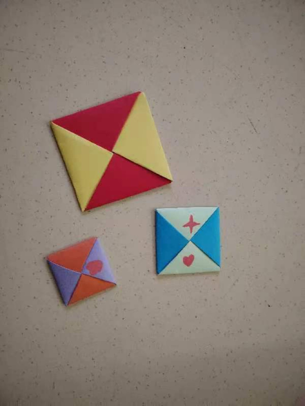 游戏准备:大小不同的宝(折法:将两张同样大小的纸折成长条,成十字折叠,下面的一条边角沿上条边折成三角,再折到上面这条中间。另一头也同样如此。最后将折叠的四个尖角依次交叉,就叠好了。好的“方宝”一般用牛皮纸或杂志封面叠成,比书本或报纸等叠的“方宝”重,不容易输给对方)