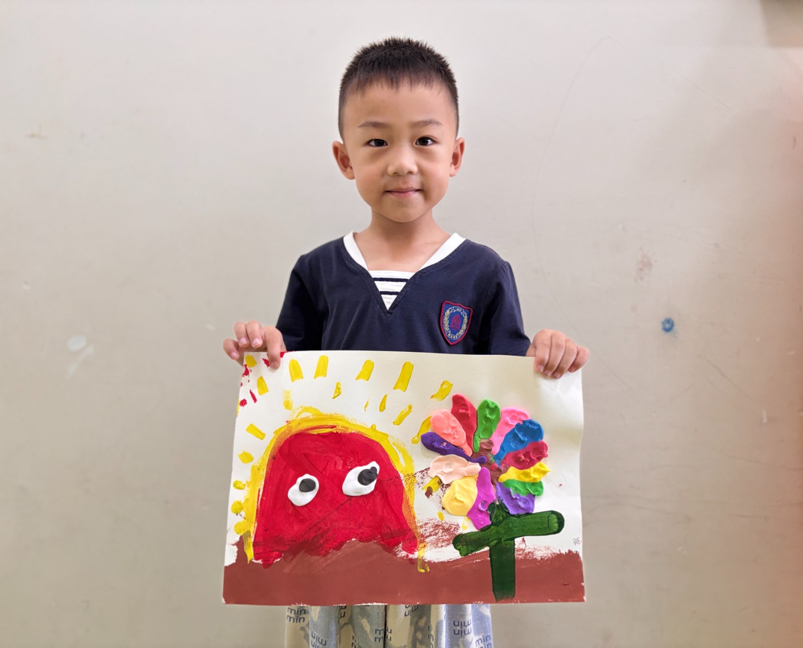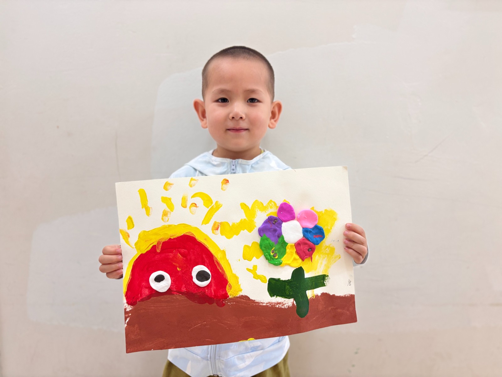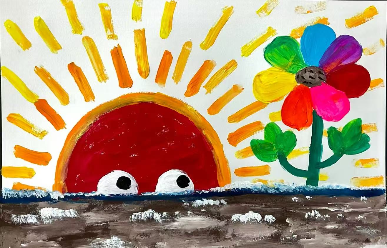 在创意美术的奇妙天地里,孩子们总能用画笔与巧思,编织出令人惊喜的童话。近期,小朋友们创作了超可爱的作品——《彩虹色的花》 。画面中,红彤彤的太阳睁着“大眼睛” ,散发暖黄光芒,一旁 “彩虹色的花” 用彩泥拼贴,花瓣色彩缤纷,像把彩虹揉进了花朵里。