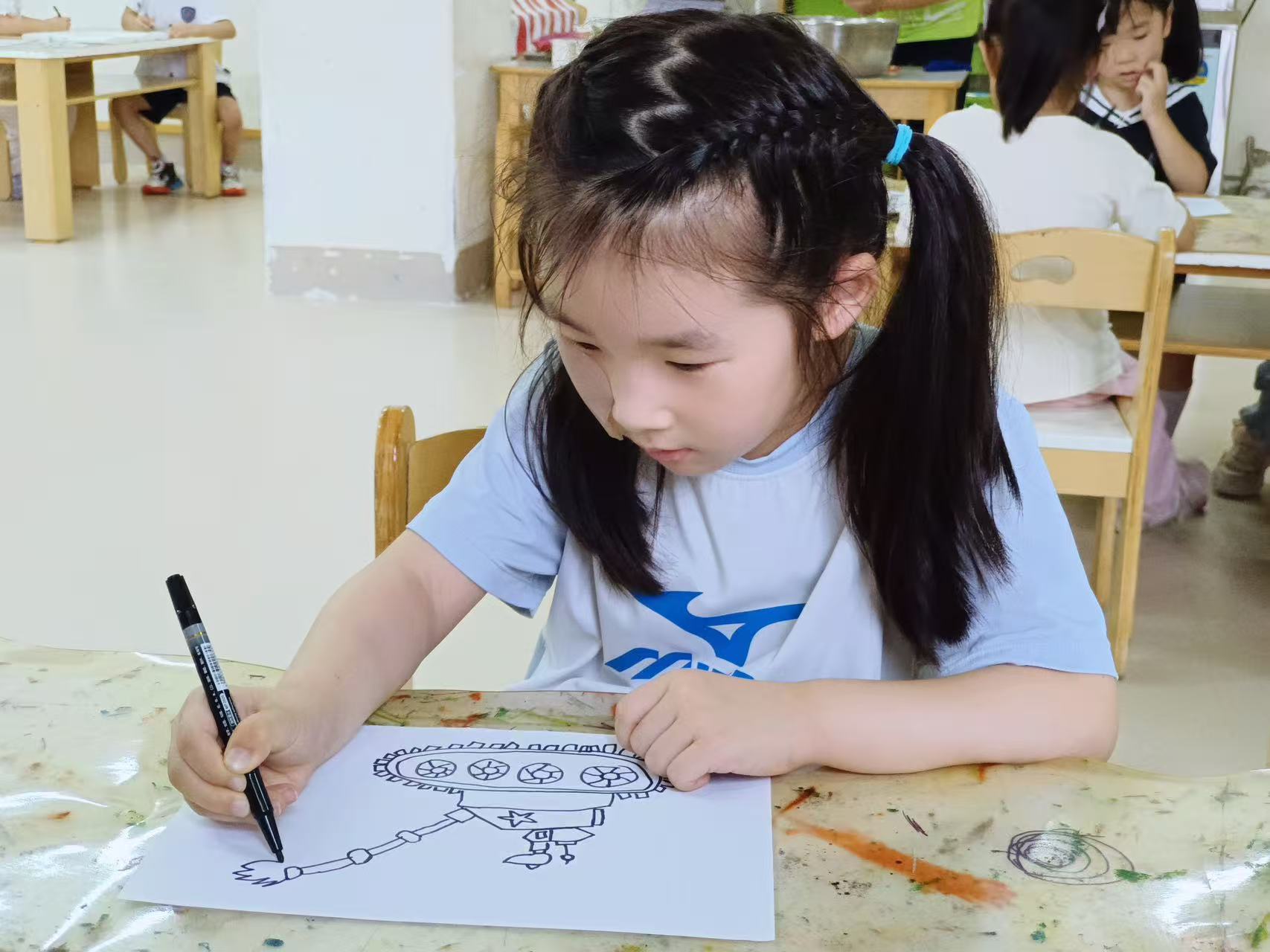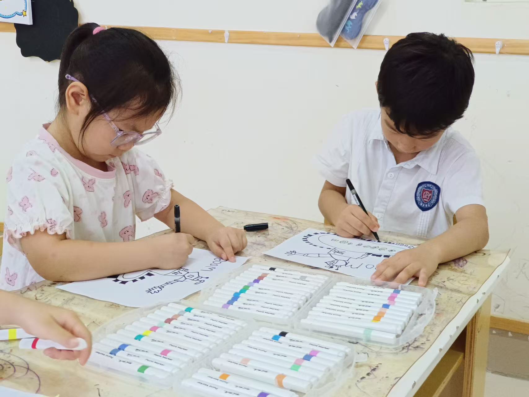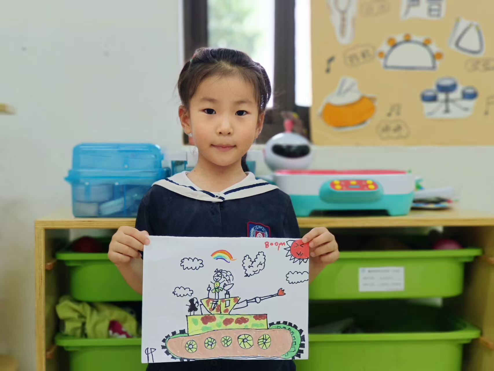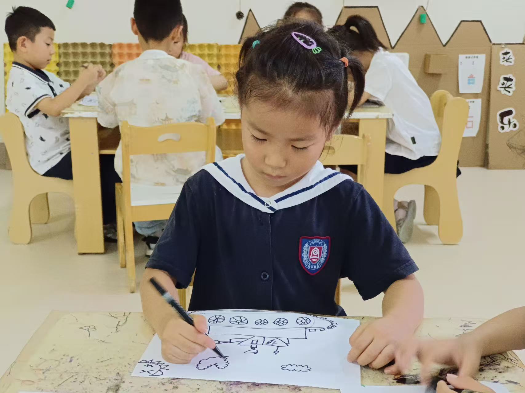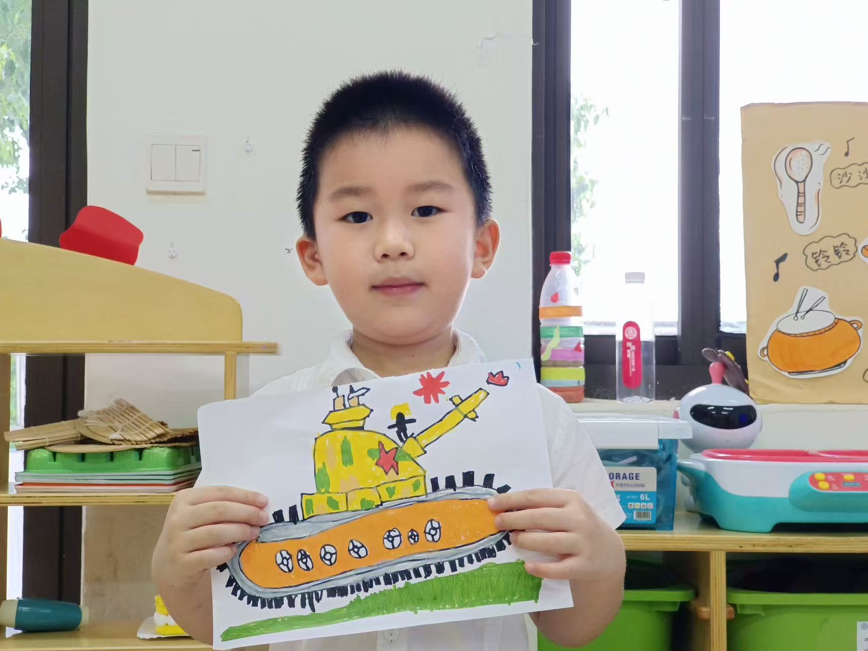活动中,孩子们专注勾勒坦克、军人形象、 用色彩填充对军人的崇敬,每一笔都是对“最可爱的人”的礼赞,稚嫩的笔触绘出对祖国、对军人的热爱。