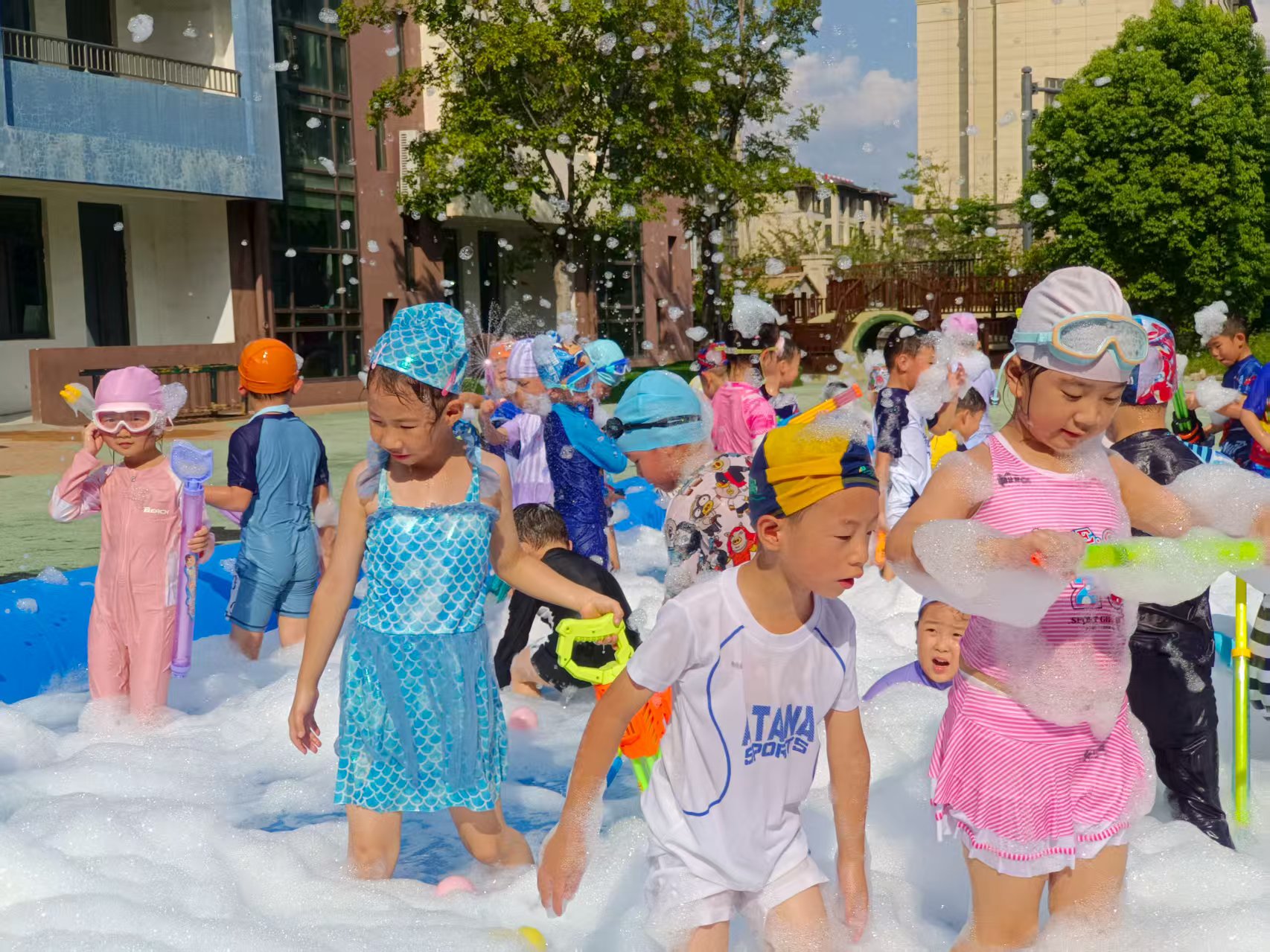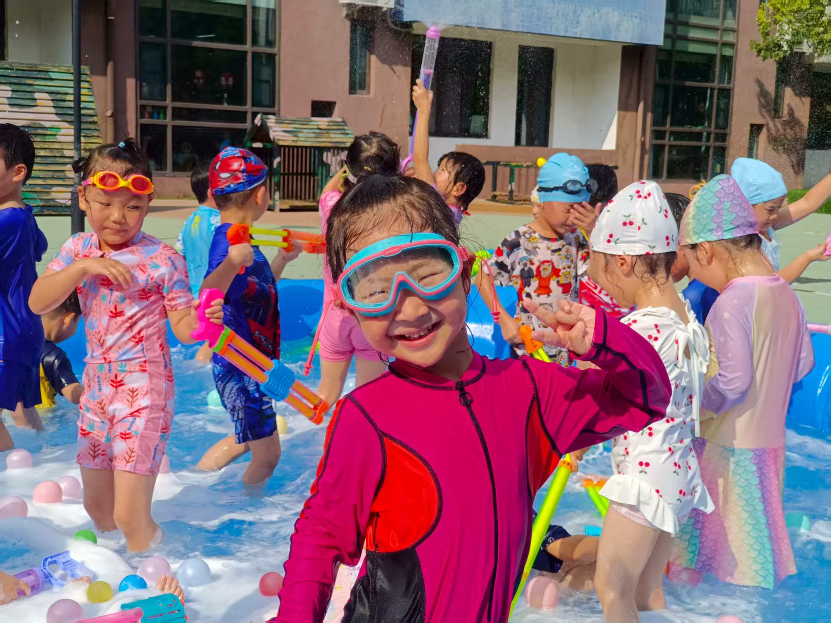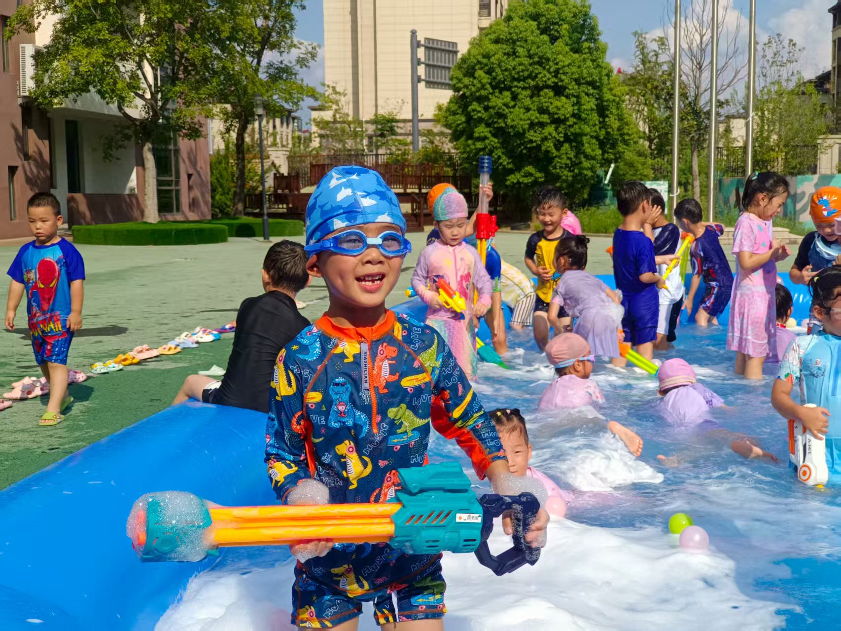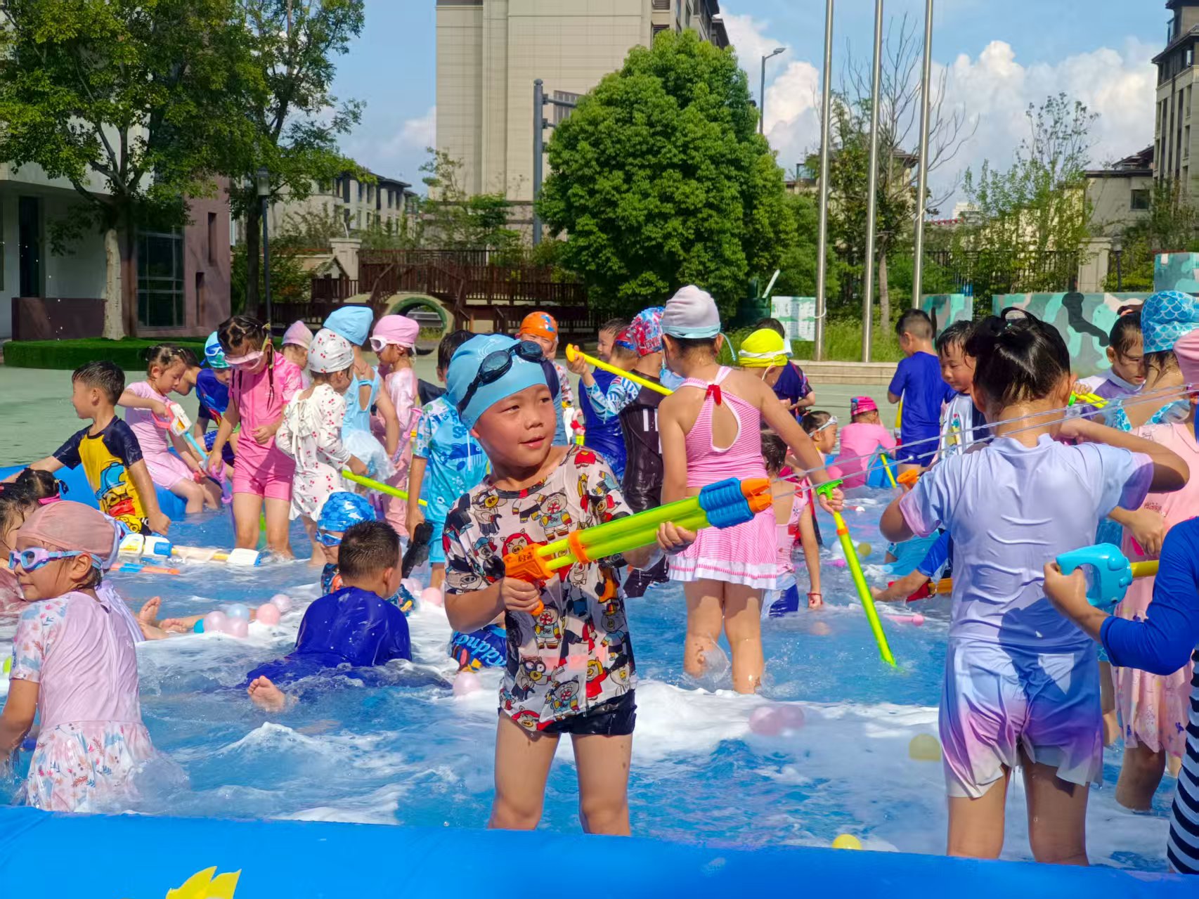 看呀~宝贝们化身“水战小勇士”,拿着各式各样的水枪、水炮,在蓝色“海洋”里肆意欢笑、追逐。有的宝贝被溅得满脸水珠,却笑得比阳光还灿烂;有的小心翼翼护着自己的“武器”,瞄准小伙伴时眼神里满是狡黠的快乐;还有的在泡沫里摸爬滚打,像极了一只可爱的“小海豚”。