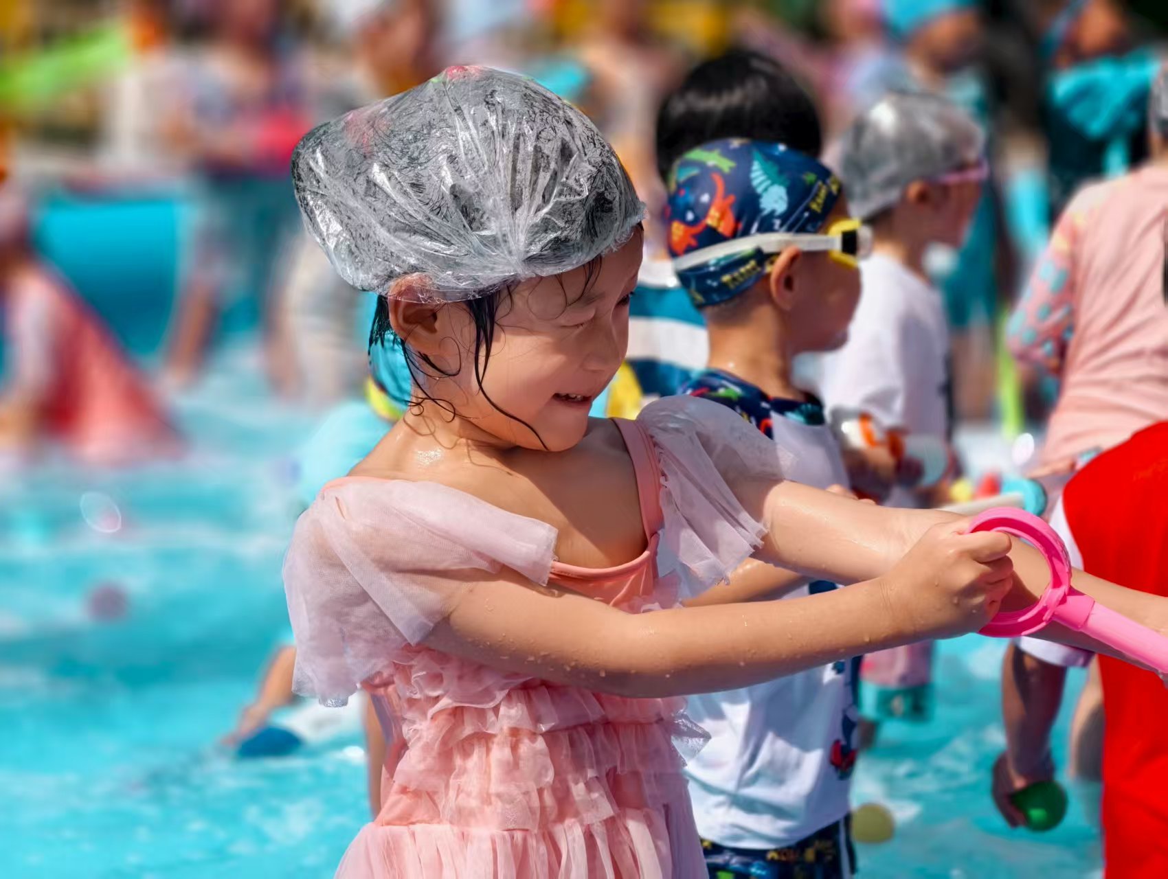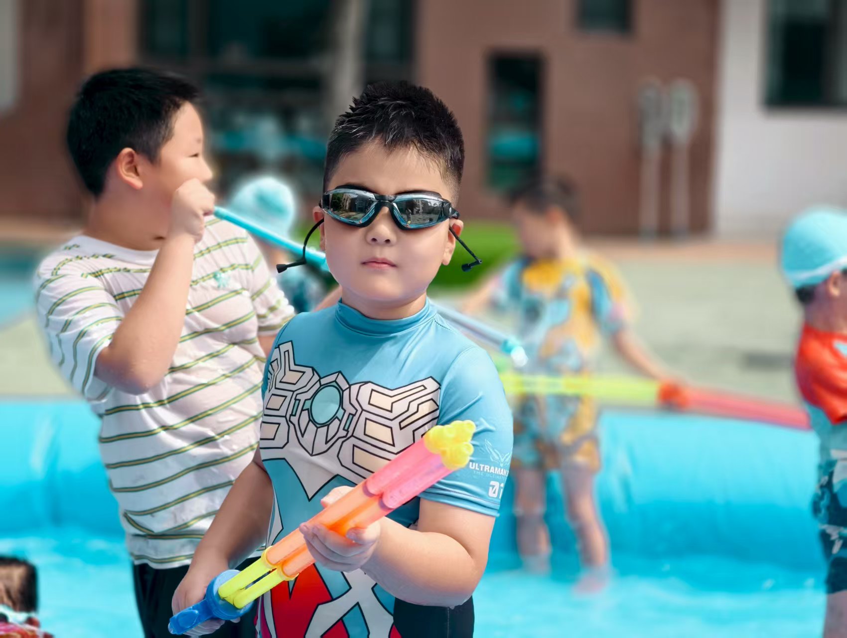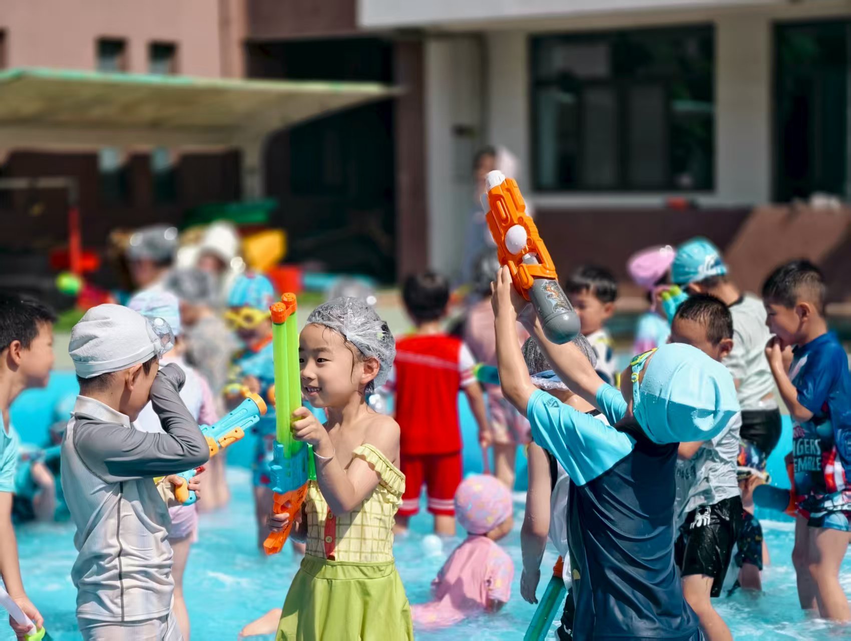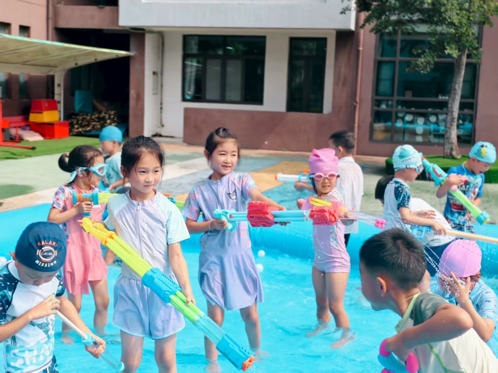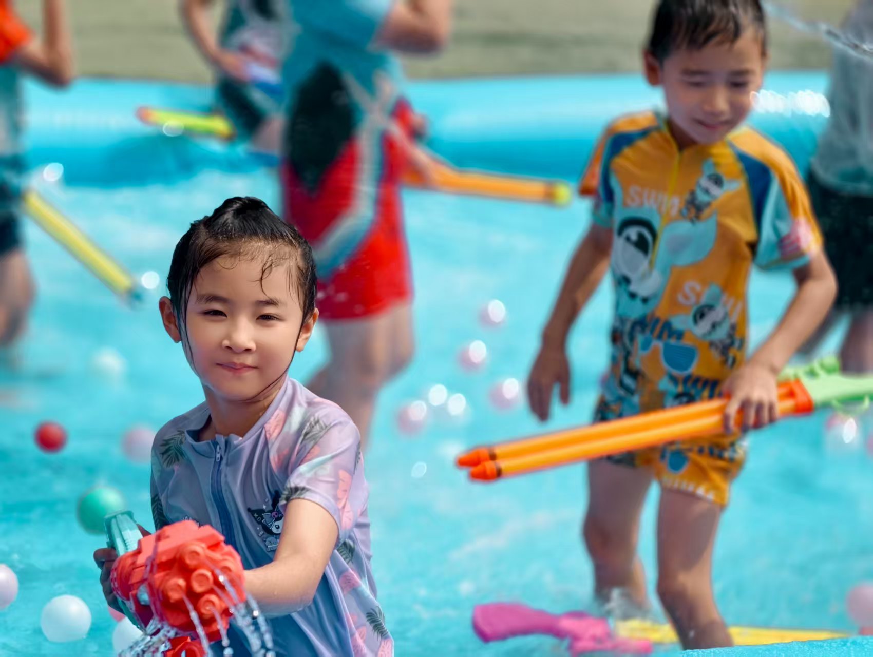 看呀~宝贝们化身“水战小勇士”,拿着各式各样的水枪、水炮,在蓝色“海洋”里肆意欢笑、追逐。有的宝贝被溅得满脸水珠,却笑得比阳光还灿烂;有的小心翼翼护着自己的“武器”,瞄准小伙伴时眼神里满是狡黠的快乐;还有的在泡沫里摸爬滚打,像极了一只可爱的“小海豚”。