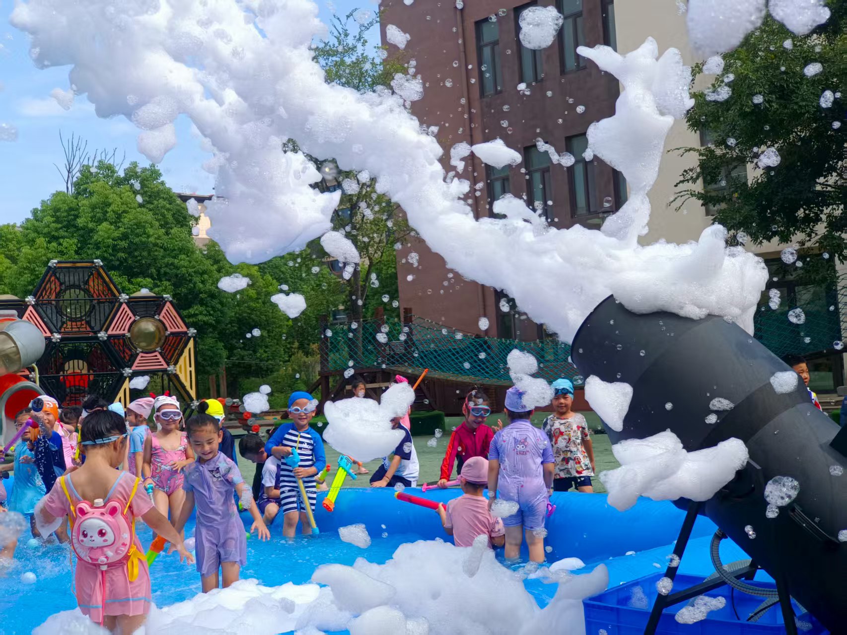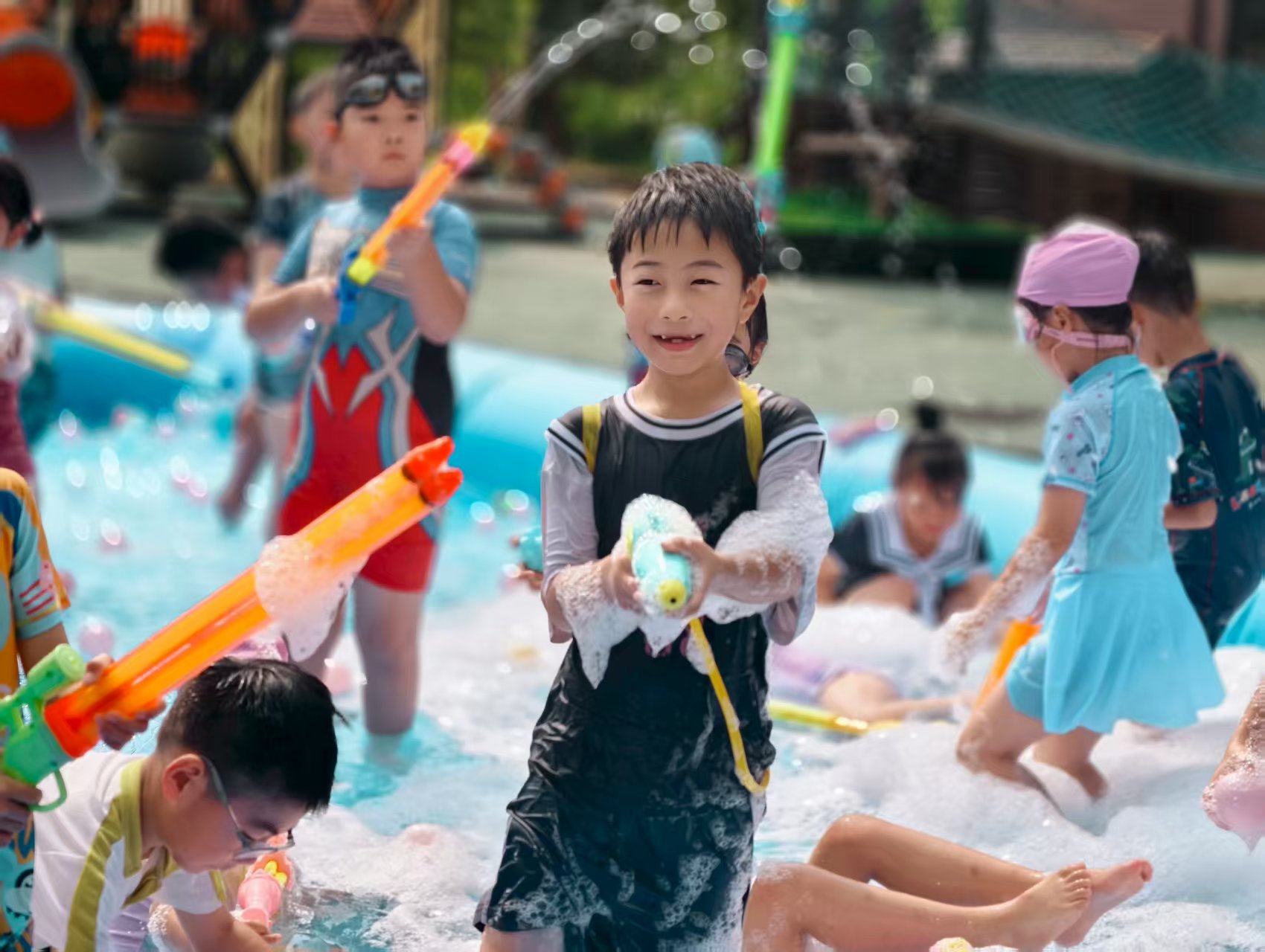 老师也加入其中,和孩子们一起在水花与泡沫中疯玩,定格下这专属夏日的、无忧无虑的美好瞬间!