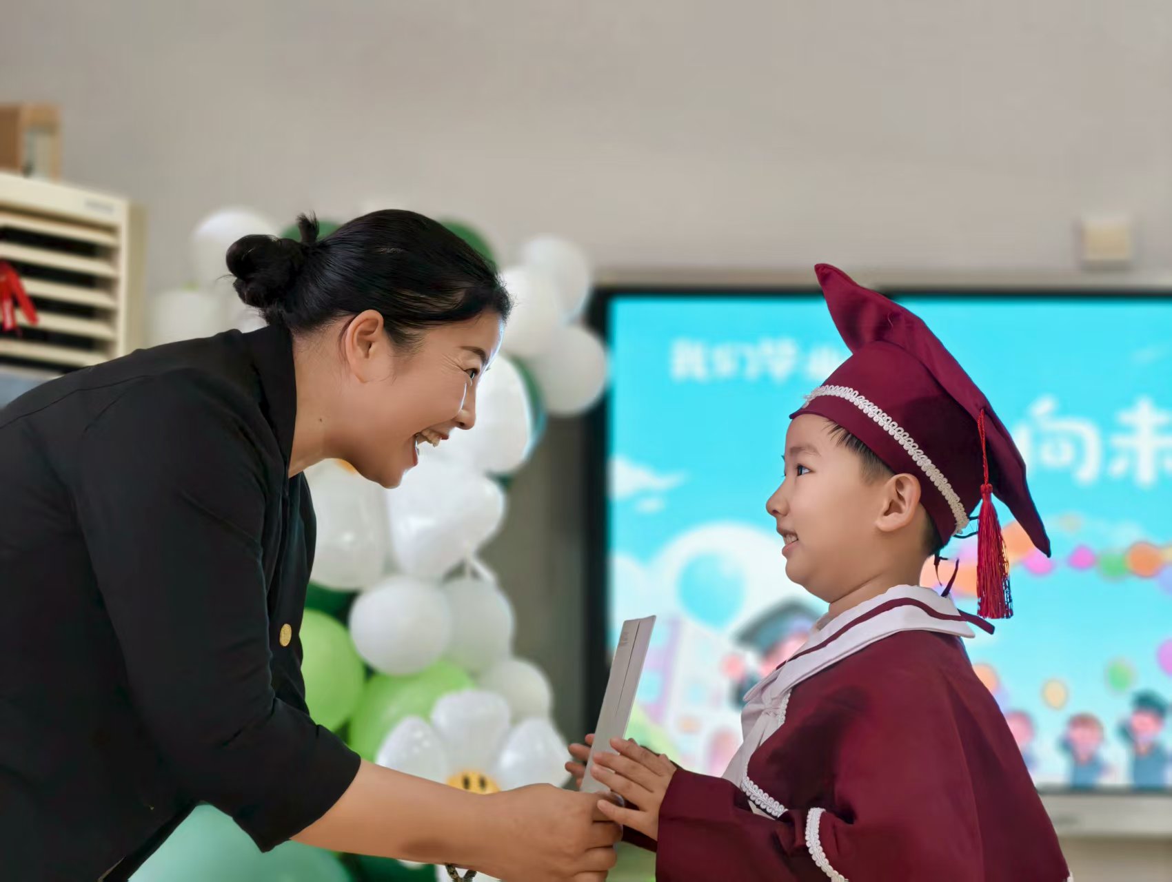 毕业季的风里,藏着老师们最温柔的模样。是清晨在校门口弯着腰,笑着接过孩子小手的模样;是午餐时耐心哄着挑食宝贝,把饭菜细细拌匀的模样;是手工课上,握着孩子的小手一起贴出小花的模样。她们会蹲下来听孩子讲天马行空的梦想,会把哭闹的宝贝轻轻抱在怀里擦眼泪,也会在毕业表演时,悄悄站在角落,红着眼眶为孩子们鼓掌。