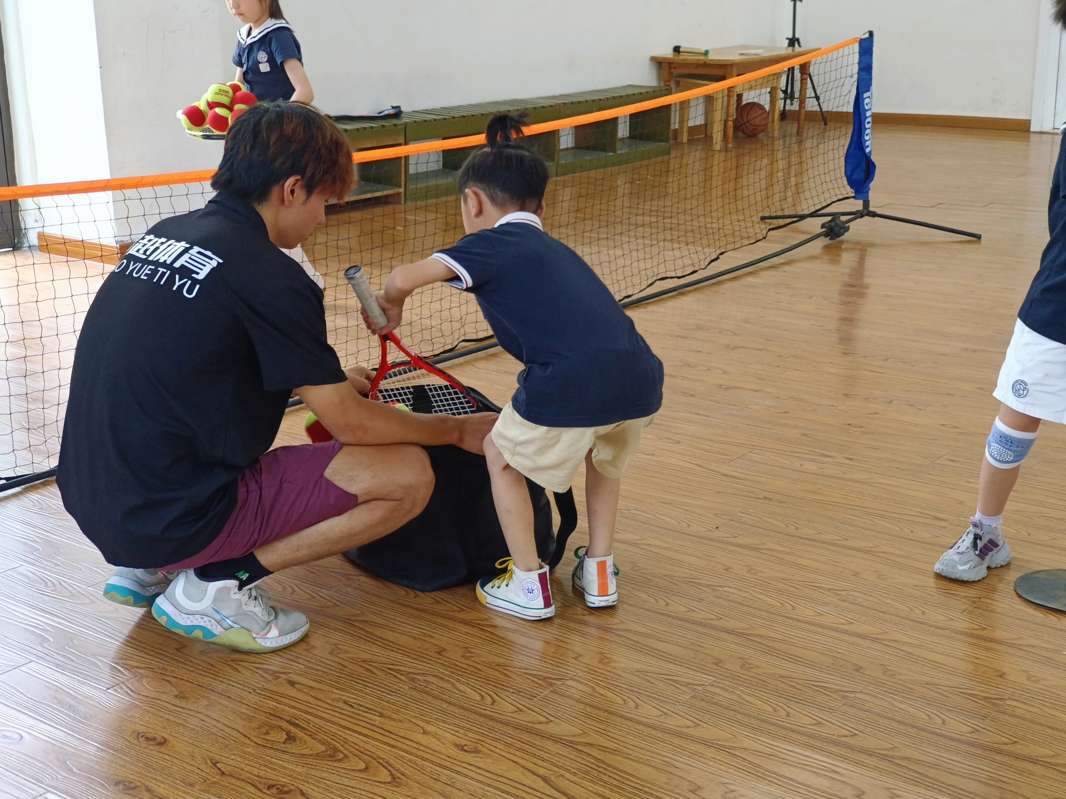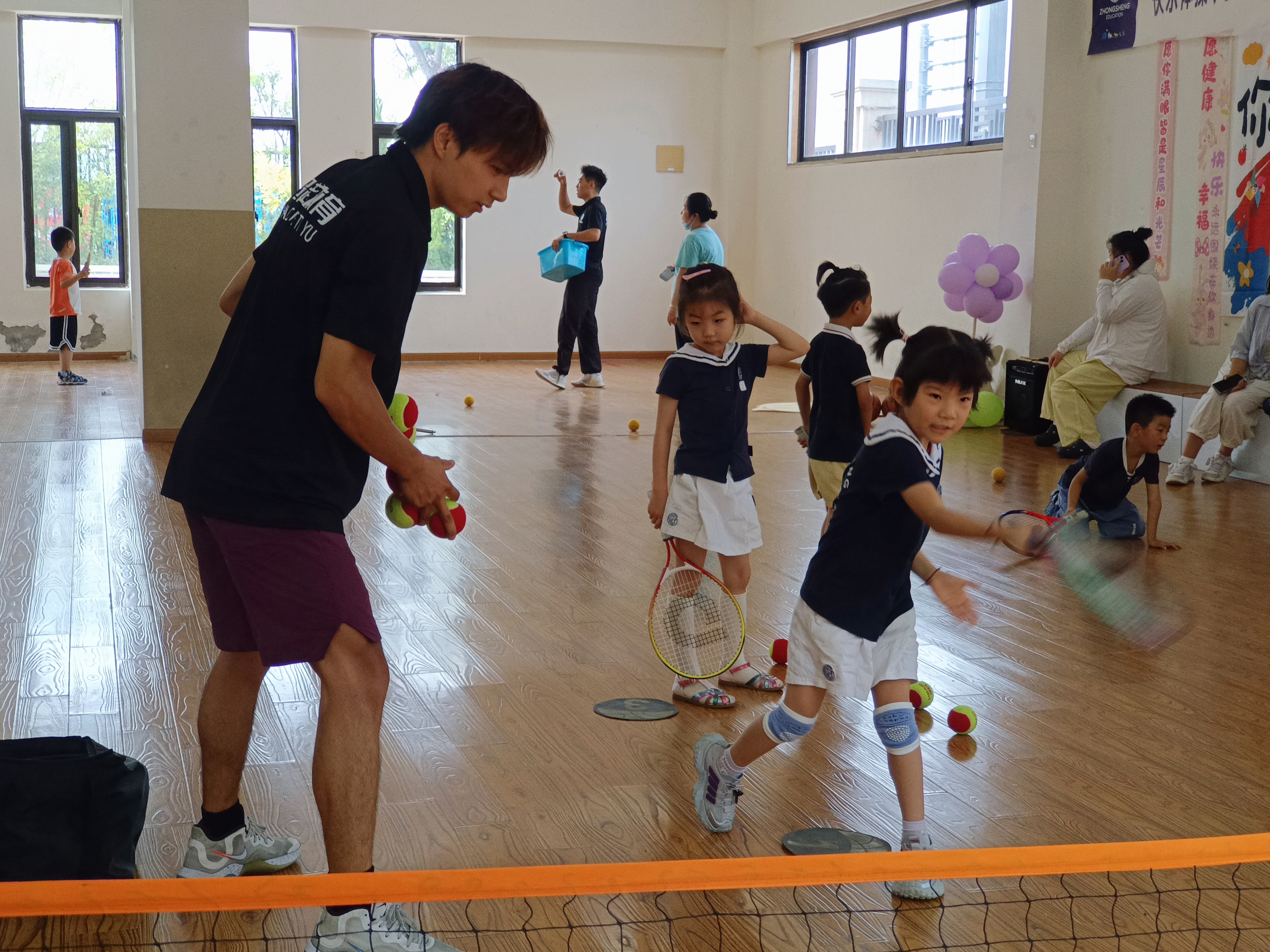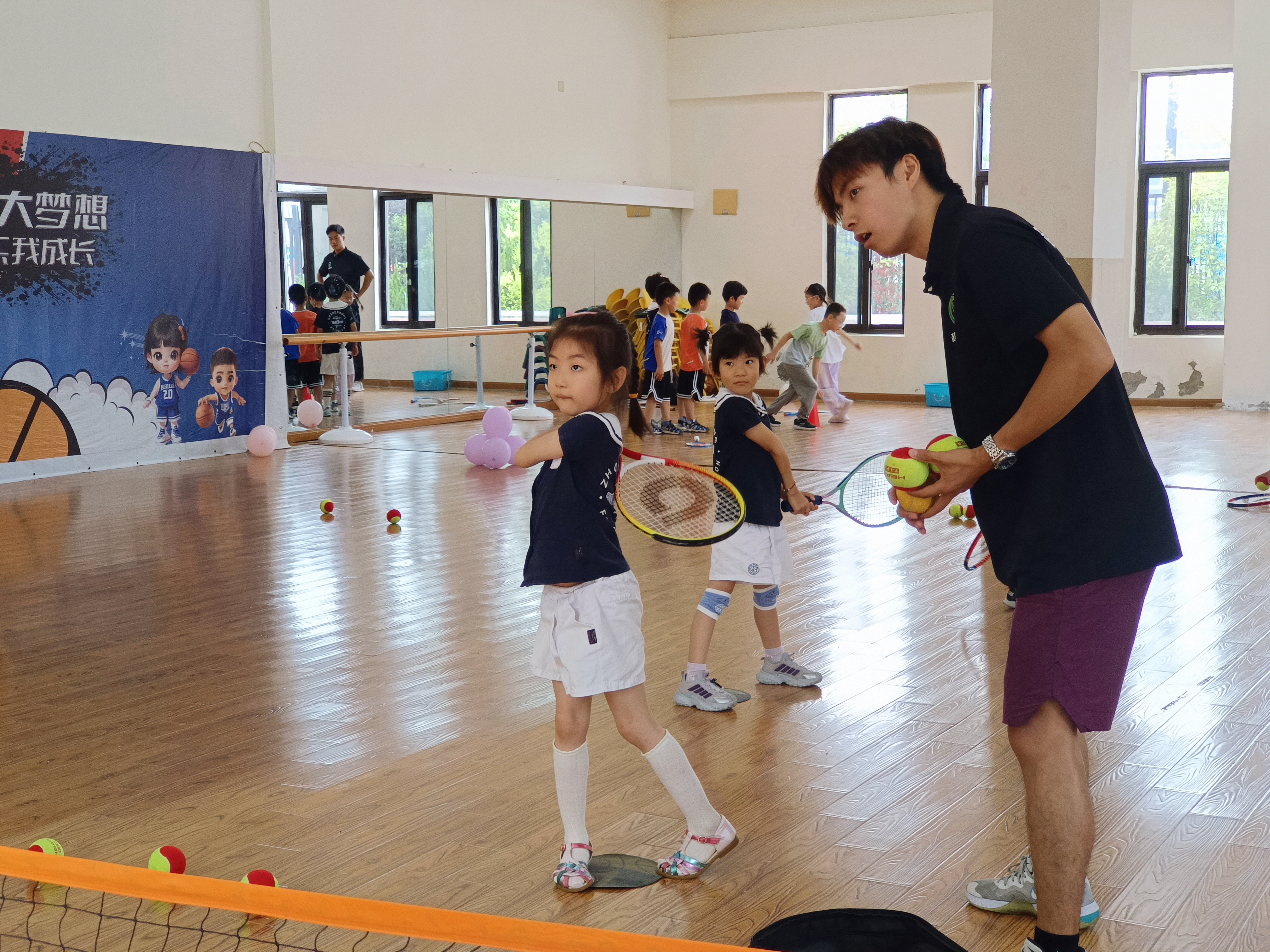 室内场地上,小萌娃们活力拉满:有的握着球拍,追着羽毛球欢快奔跑,笑声比球还轻盈;有的跟着教练,专注地接抛网球,眼神里满是对新技能的好奇与执着。
