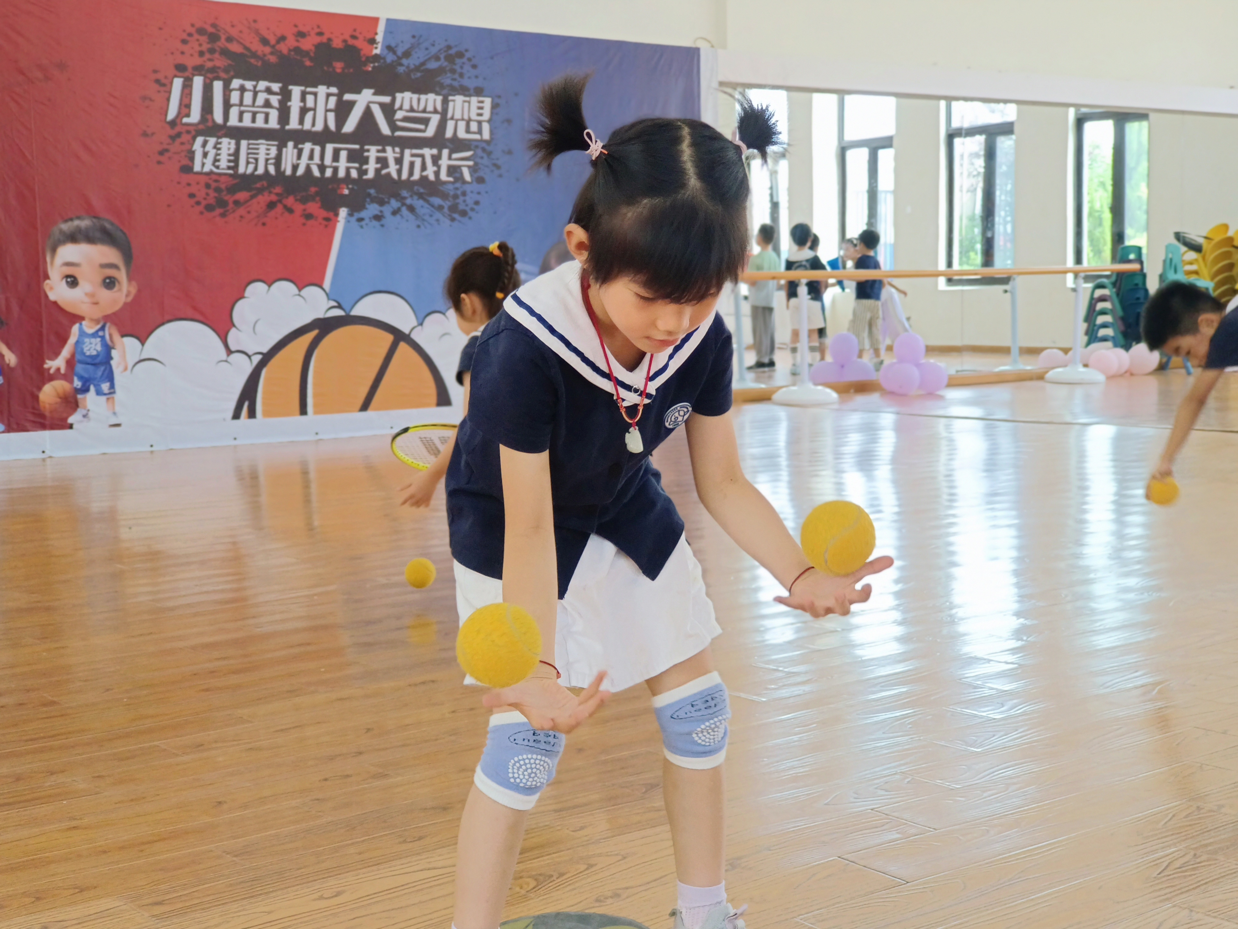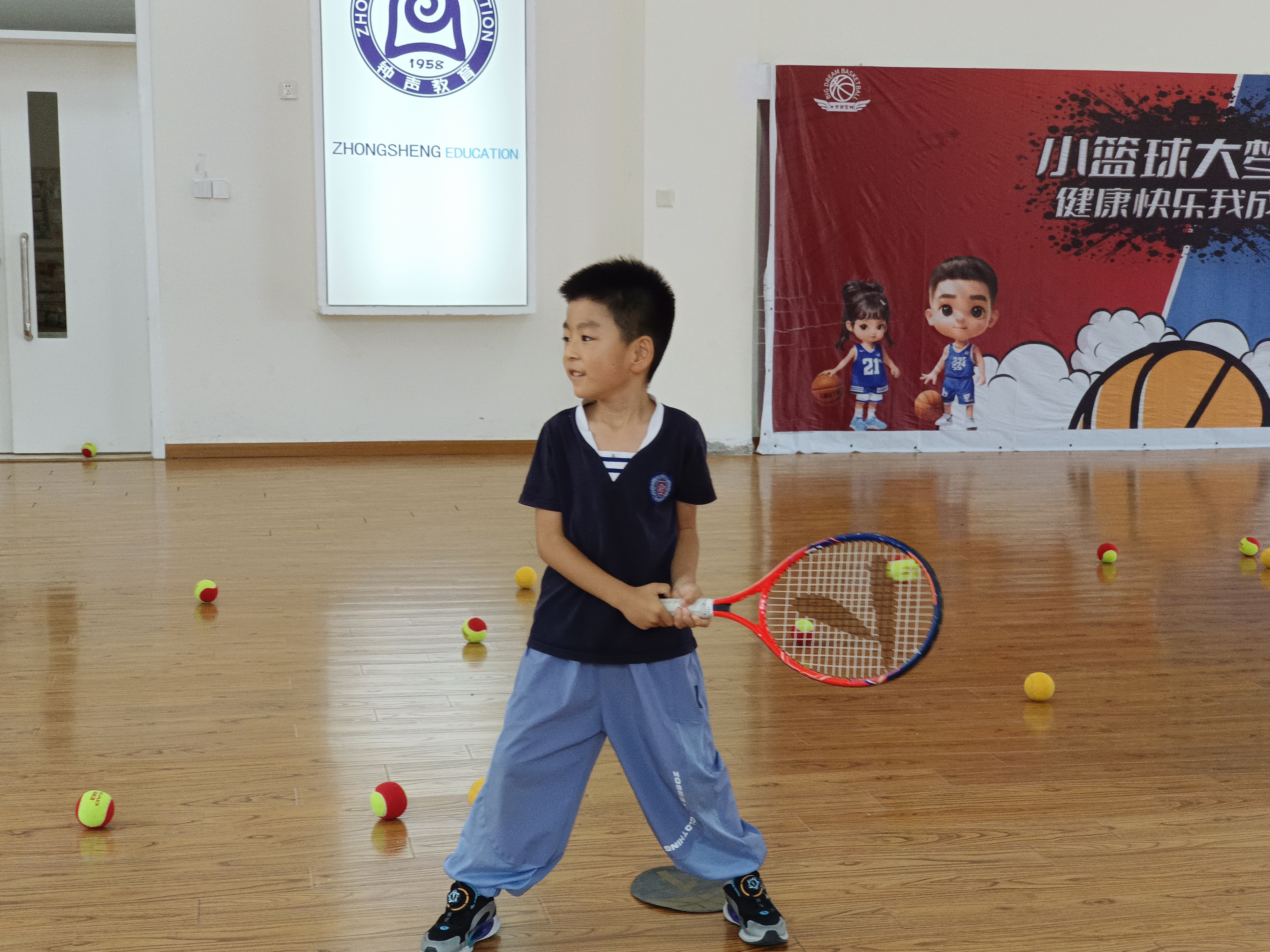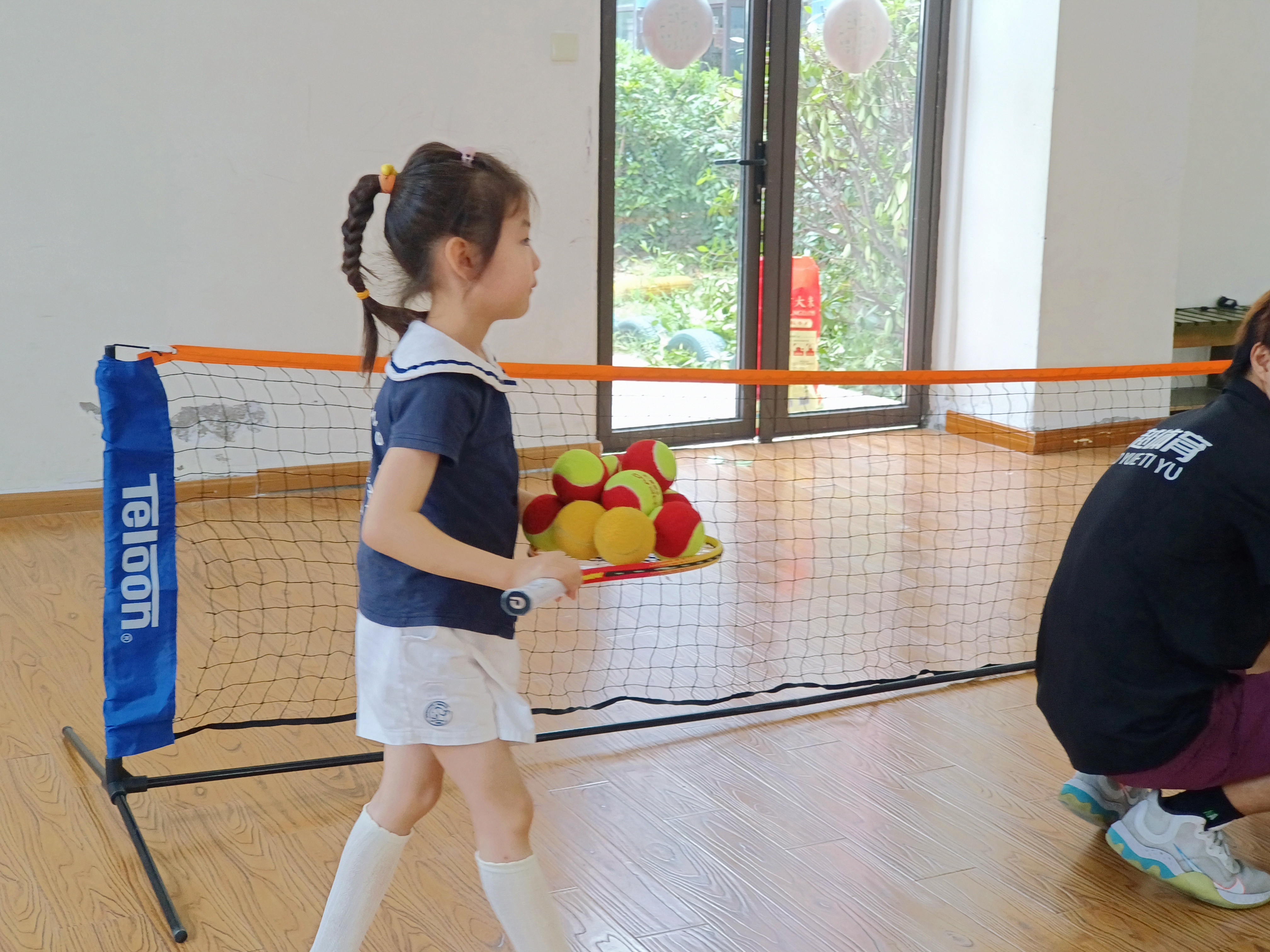 室内场地上,小萌娃们活力拉满:有的握着球拍,追着羽毛球欢快奔跑,笑声比球还轻盈;有的跟着教练,专注地接抛网球,眼神里满是对新技能的好奇与执着。
