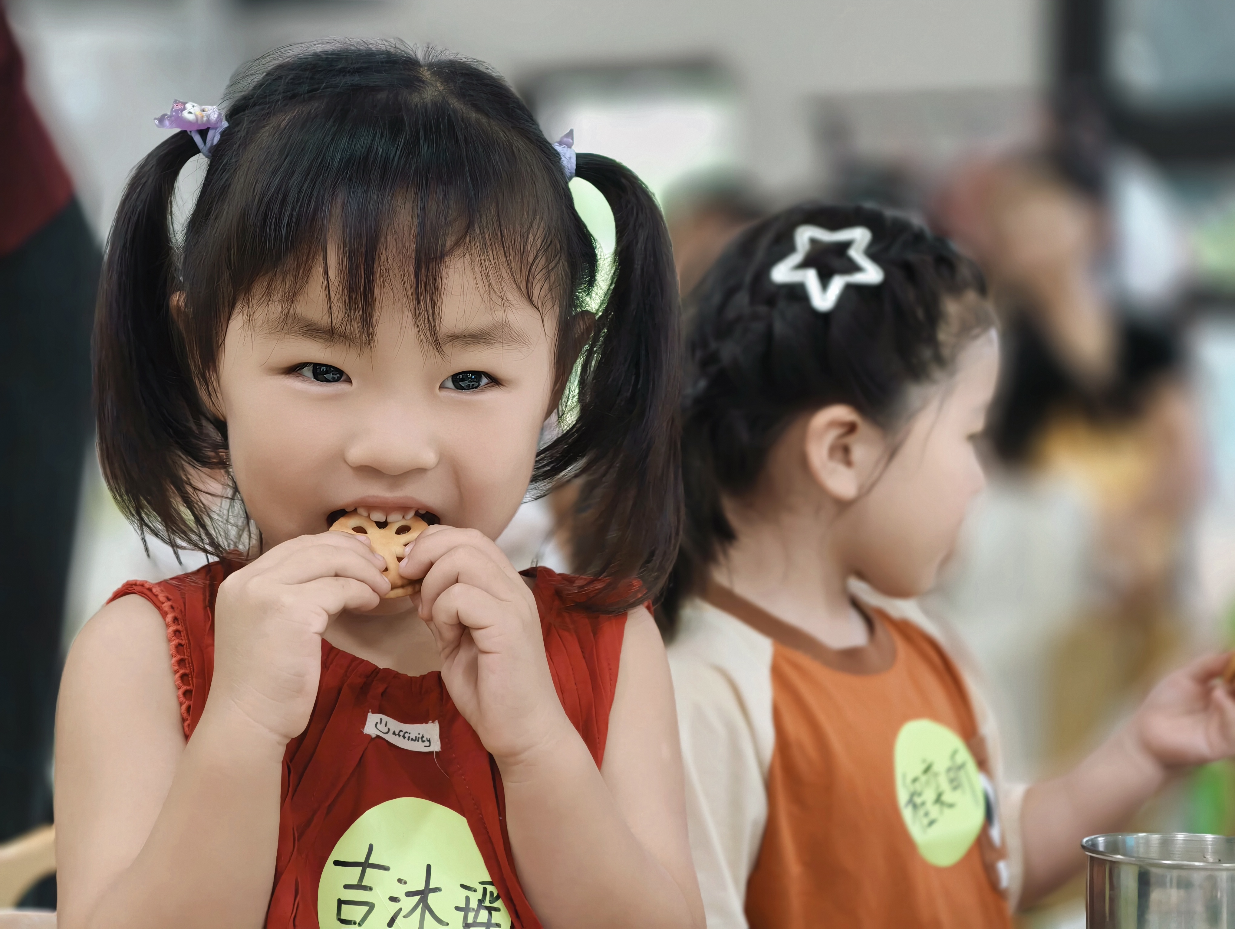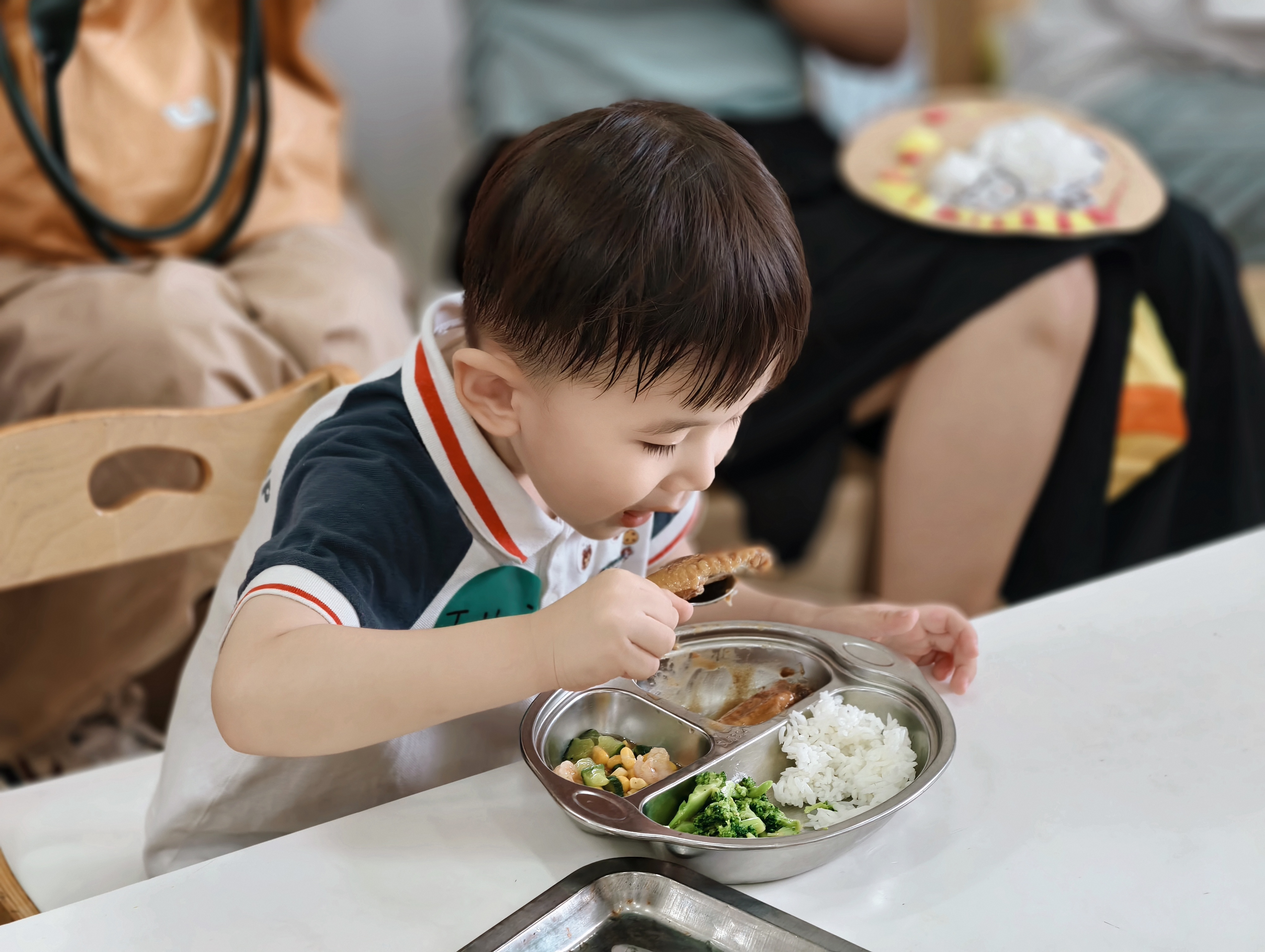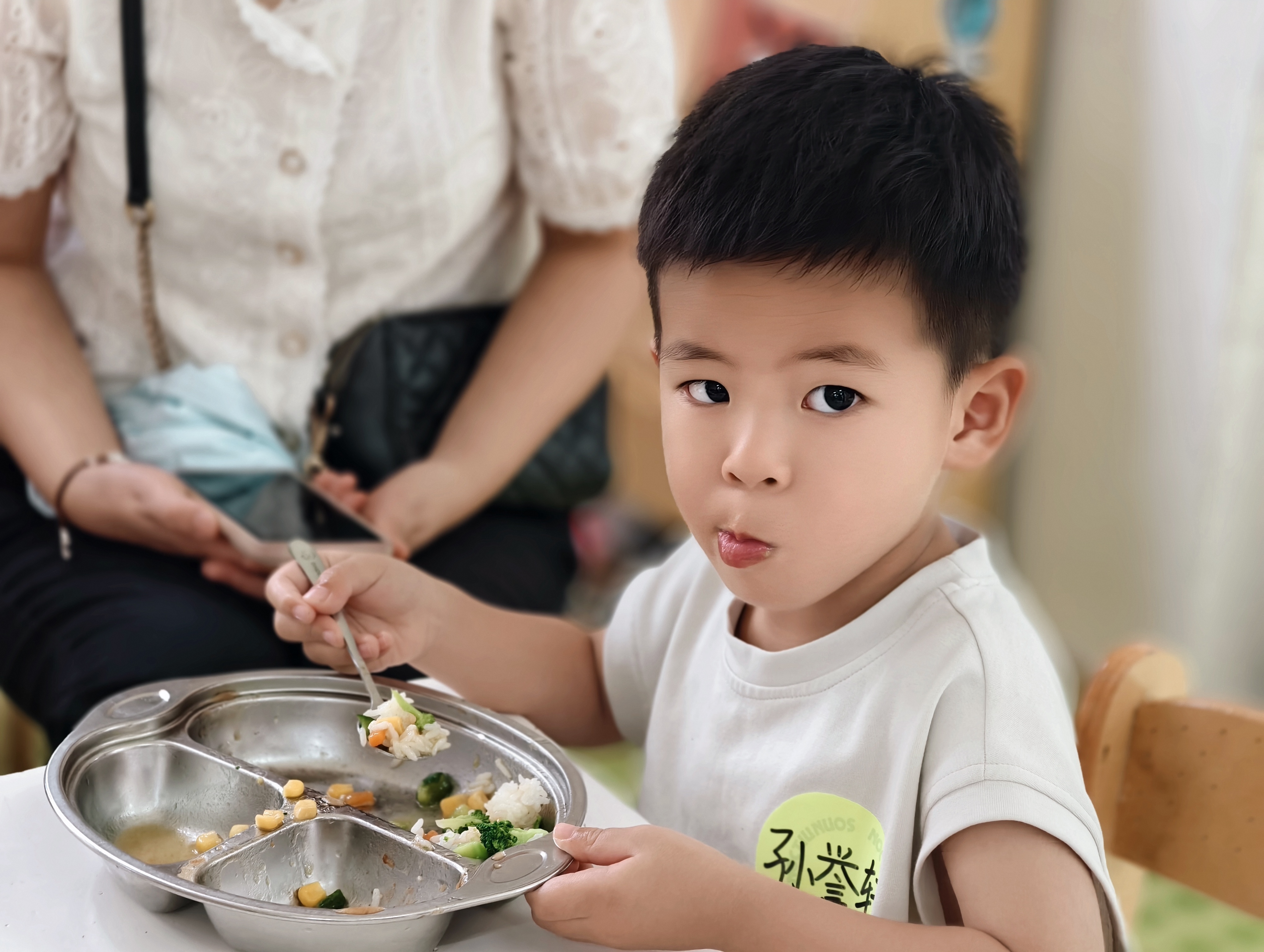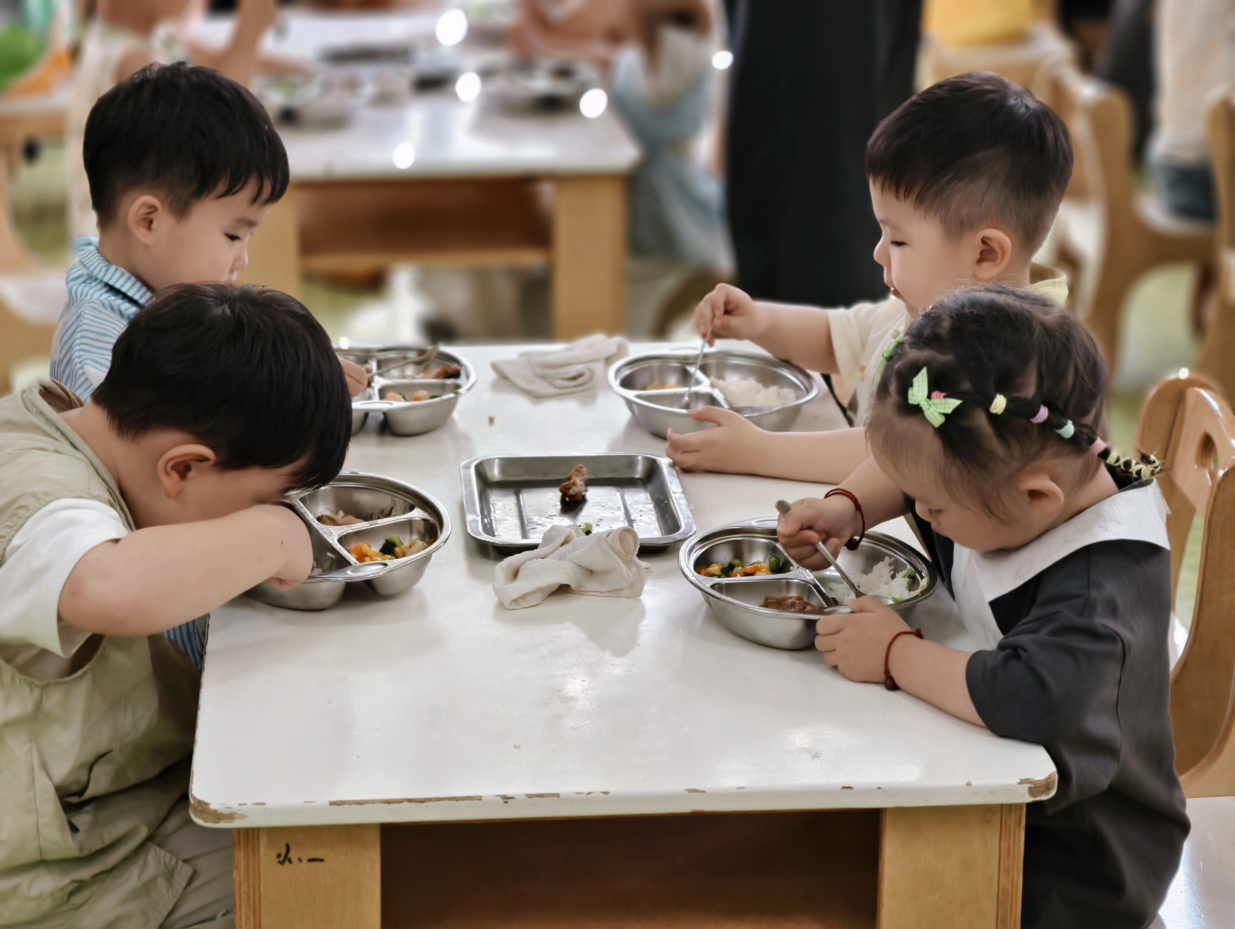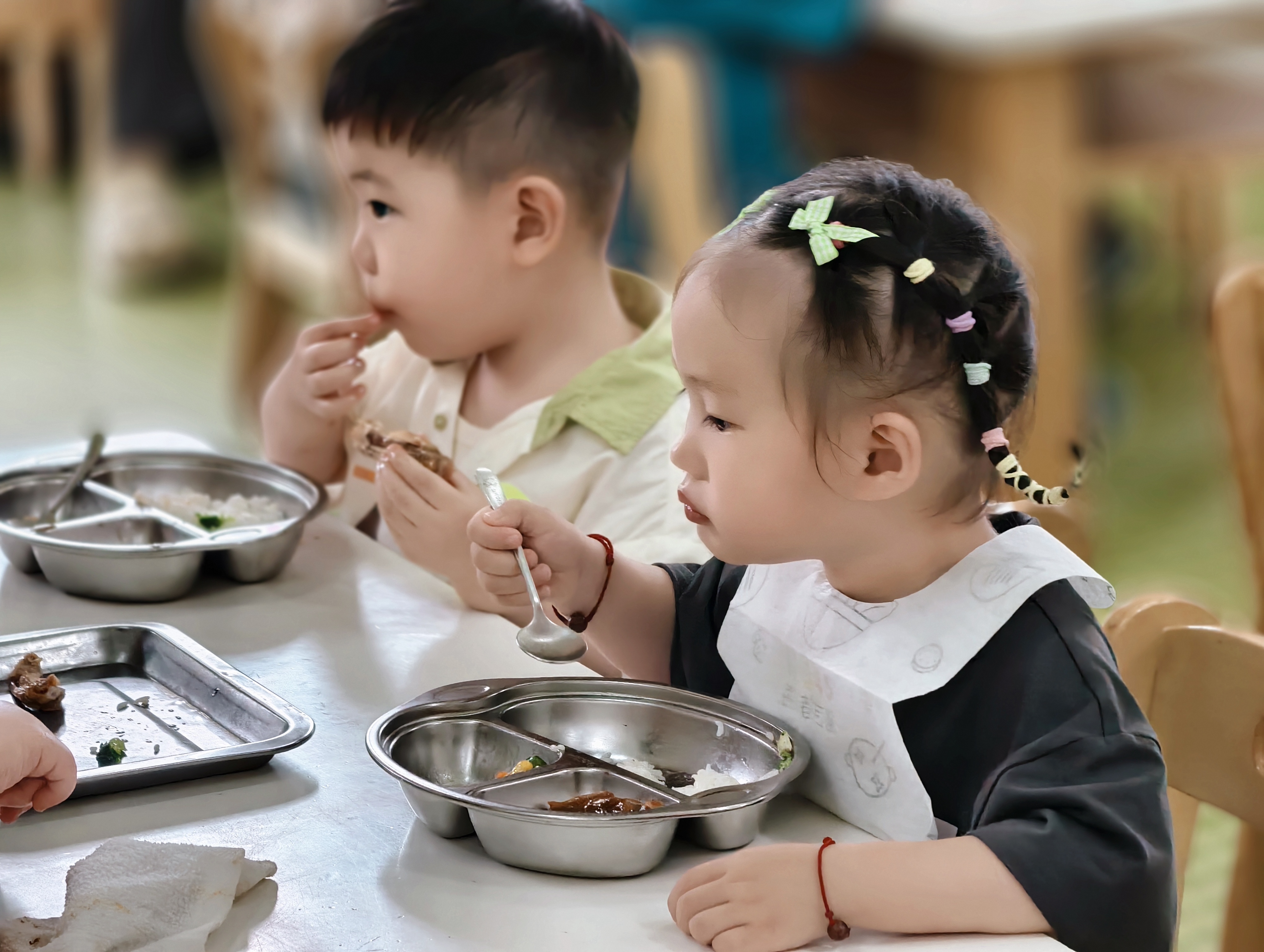 到了午餐时间,香喷喷的饭菜端上桌。孩子们学着自己拿勺子,安静用餐,偶尔和旁边小伙伴相视一笑,满是对新环境的喜爱。