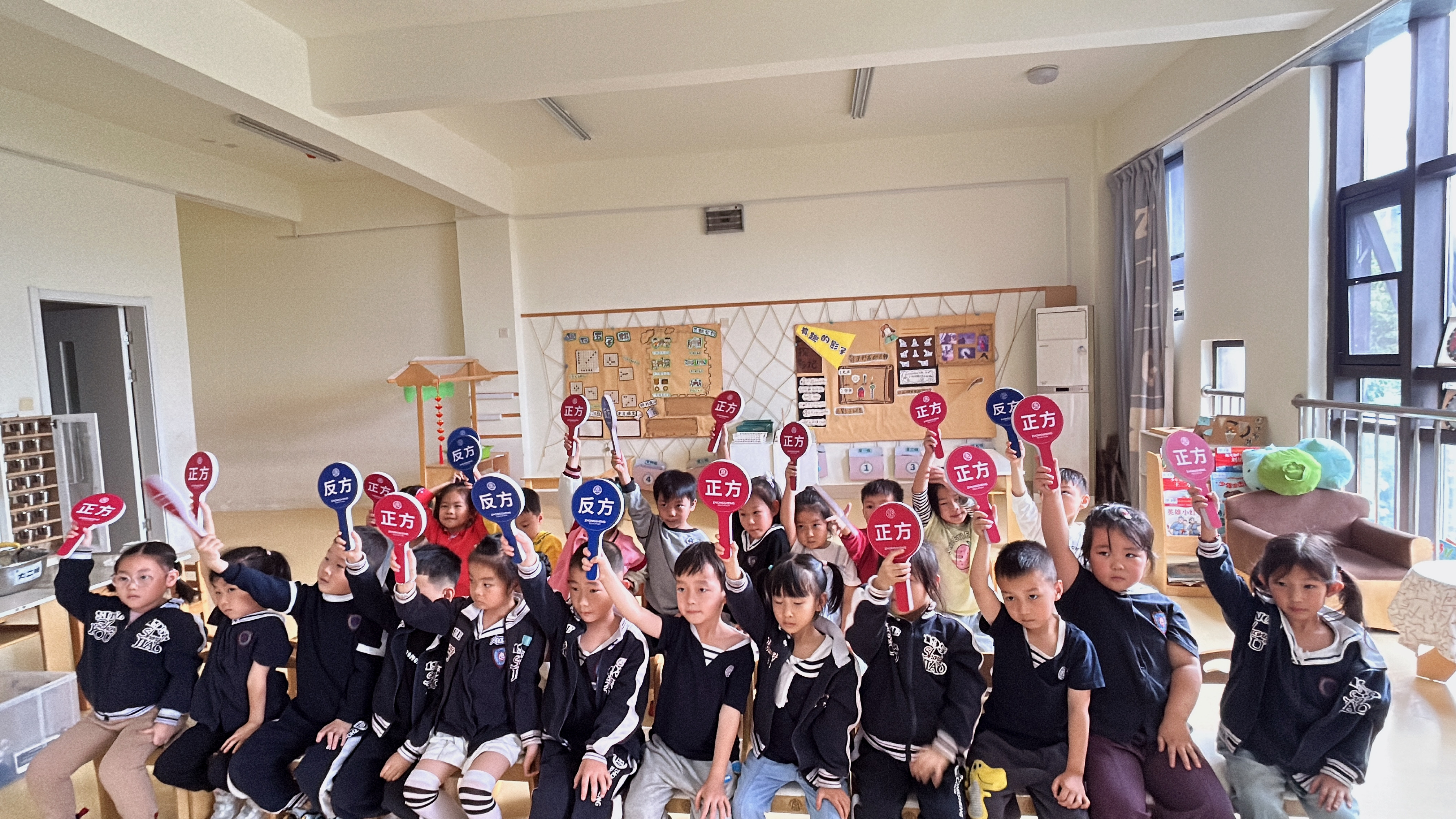 场下的小观众们也忙坏啦,纷纷举起 “正方”“反方” 的小牌子,使劲儿为支持的队伍加油。等到辩论结束,小辩手们笑着握手,像真正的 “辩论家” 一样礼貌又友好。