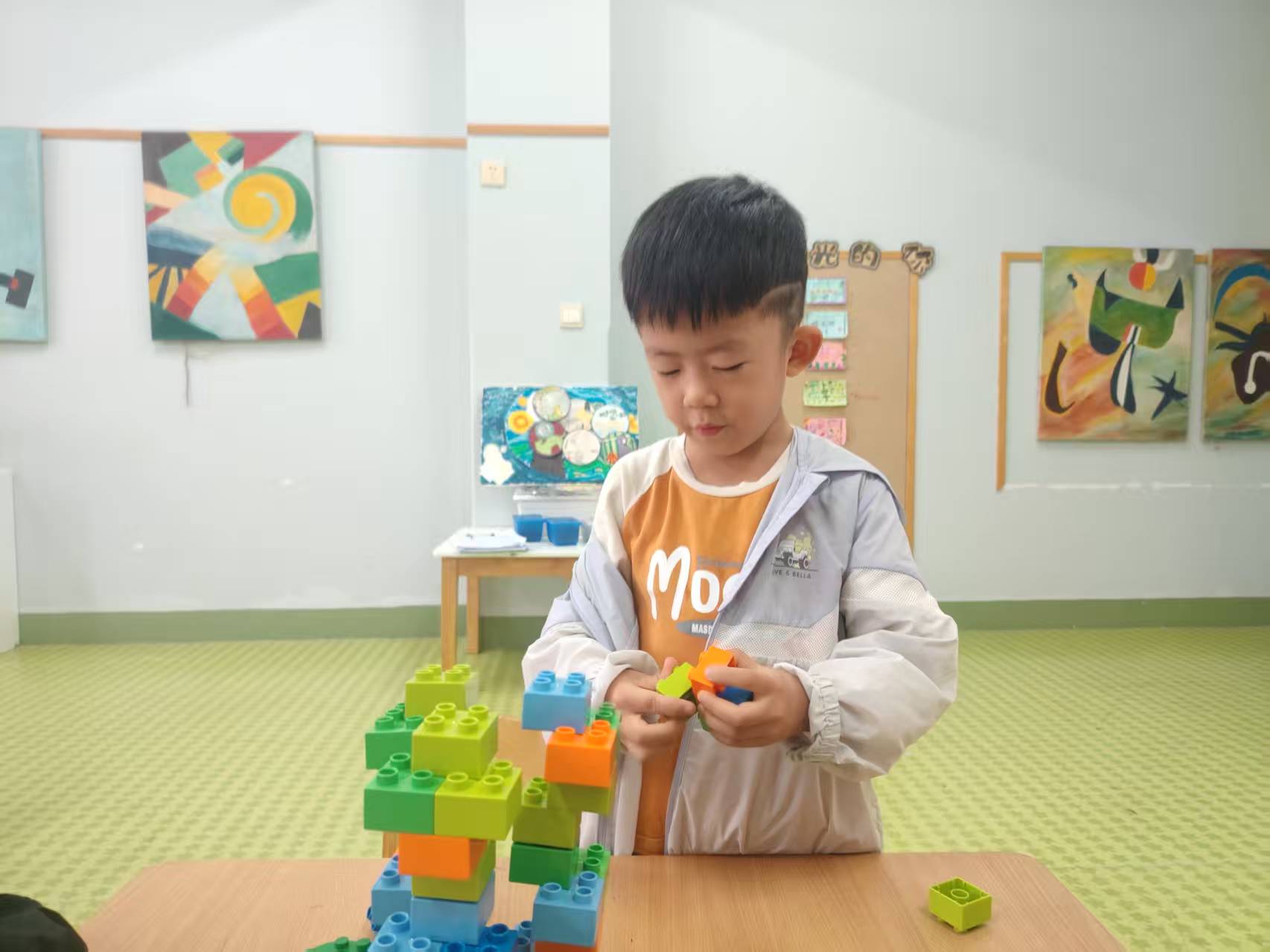 看!宝贝们化身 “小小建筑师”,有的沉浸在自己的创意宇宙里:小手稳稳拿起彩色积木,一块一块认真拼接,花朵、高塔在指尖慢慢 “长大”;有的则和小伙伴们组队,你选积木我来搭,合力构建出超棒的 “集体城堡”,合作的快乐在空气中蔓延~