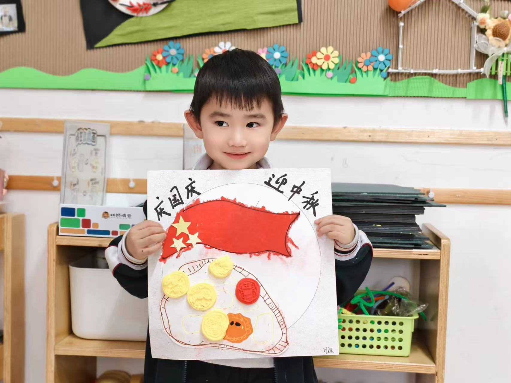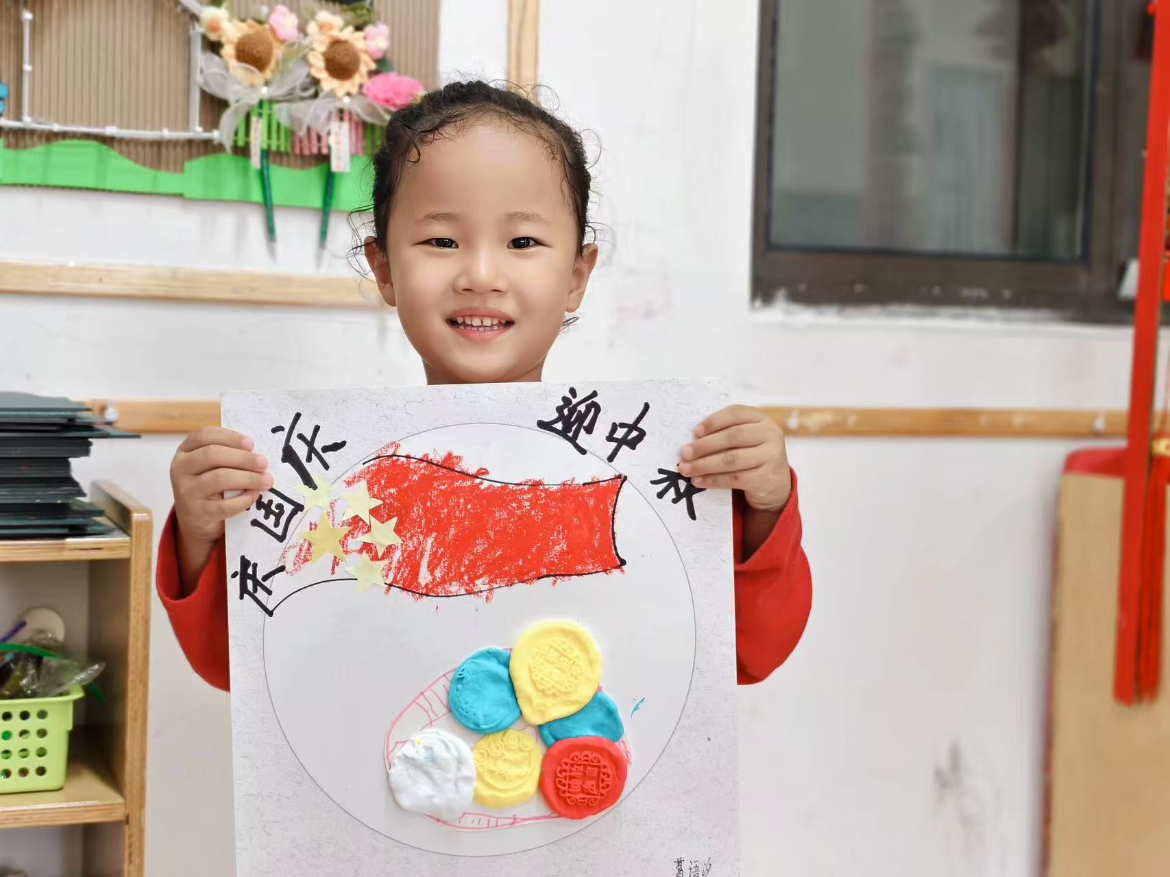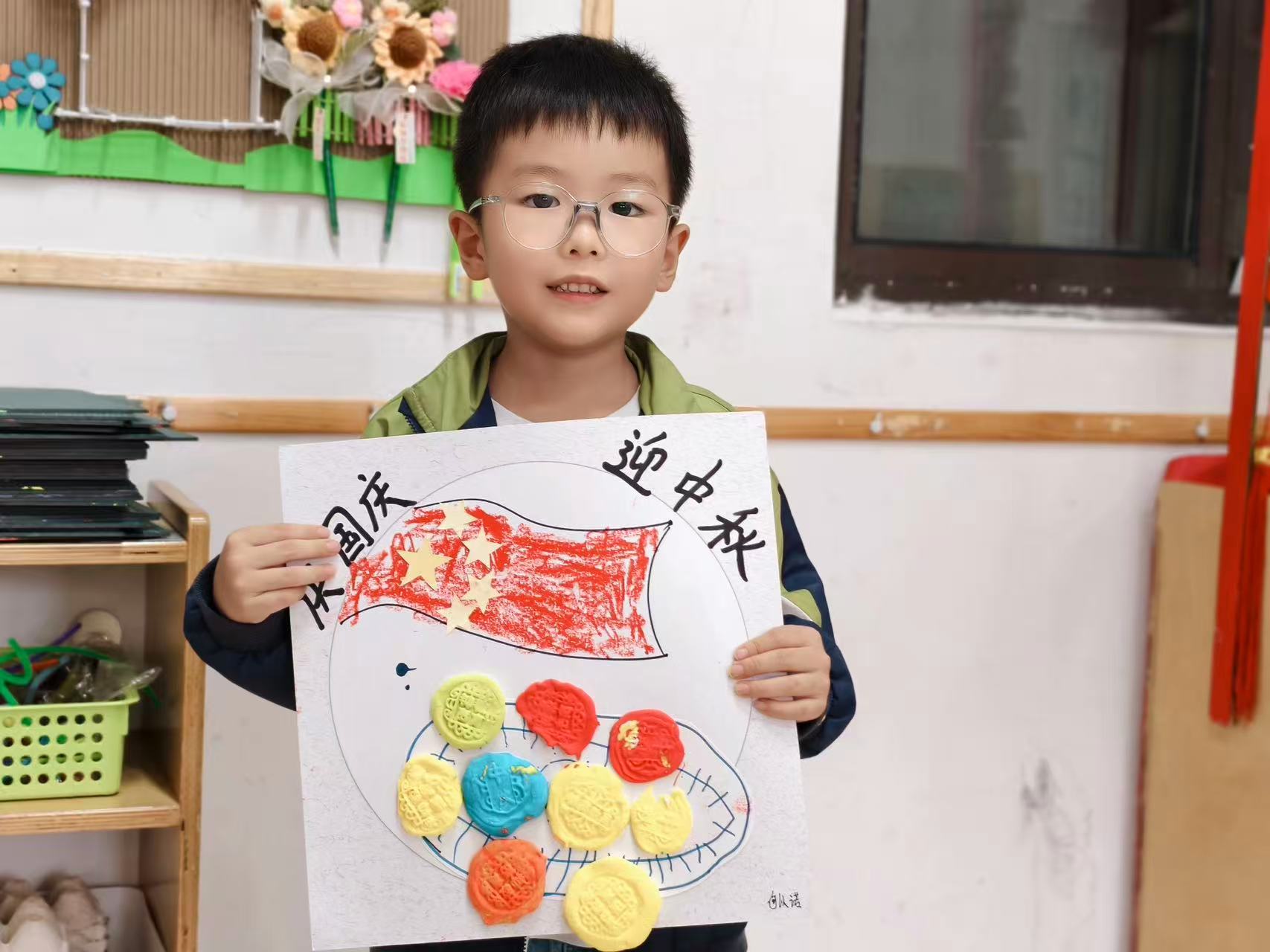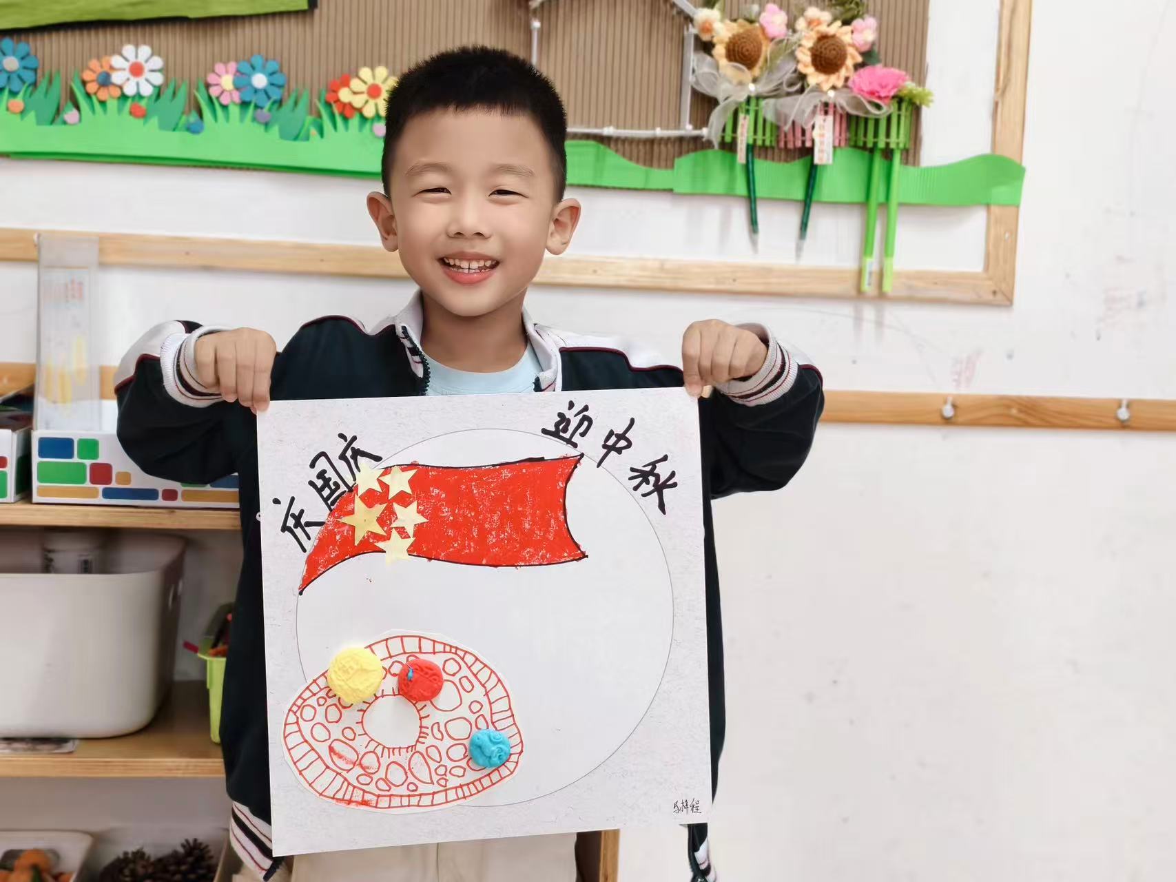 在老师的引导下,孩子们用彩泥与画笔,让五星红旗与中秋月饼在画纸上奇妙相遇。稚嫩的小手捏出五彩月饼,绘出鲜红国旗,每一抹色彩、每一个造型,都是他们对“家国同庆”最纯真的理解,在彩泥的芬芳里,家国情怀的种子悄然萌发。