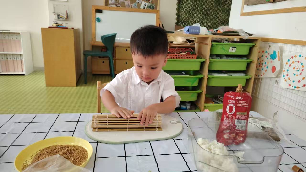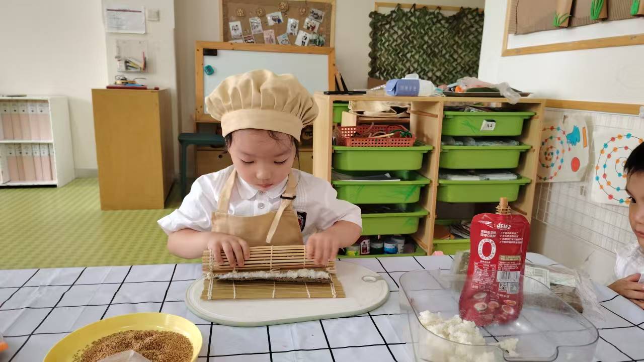 看,孩子们化身小小美食家,在老师的引导下,认真地给黄瓜 “脱衣”,小心翼翼地挥动着儿童专用刀具;专注地用竹帘卷起寿司,让米饭与海苔完美相拥;还有的在搅拌蛋液,让食材在碗中跳起欢快的舞蹈…… 每一个动作,都是他们对生活技能的探索,对食物的好奇与热爱。