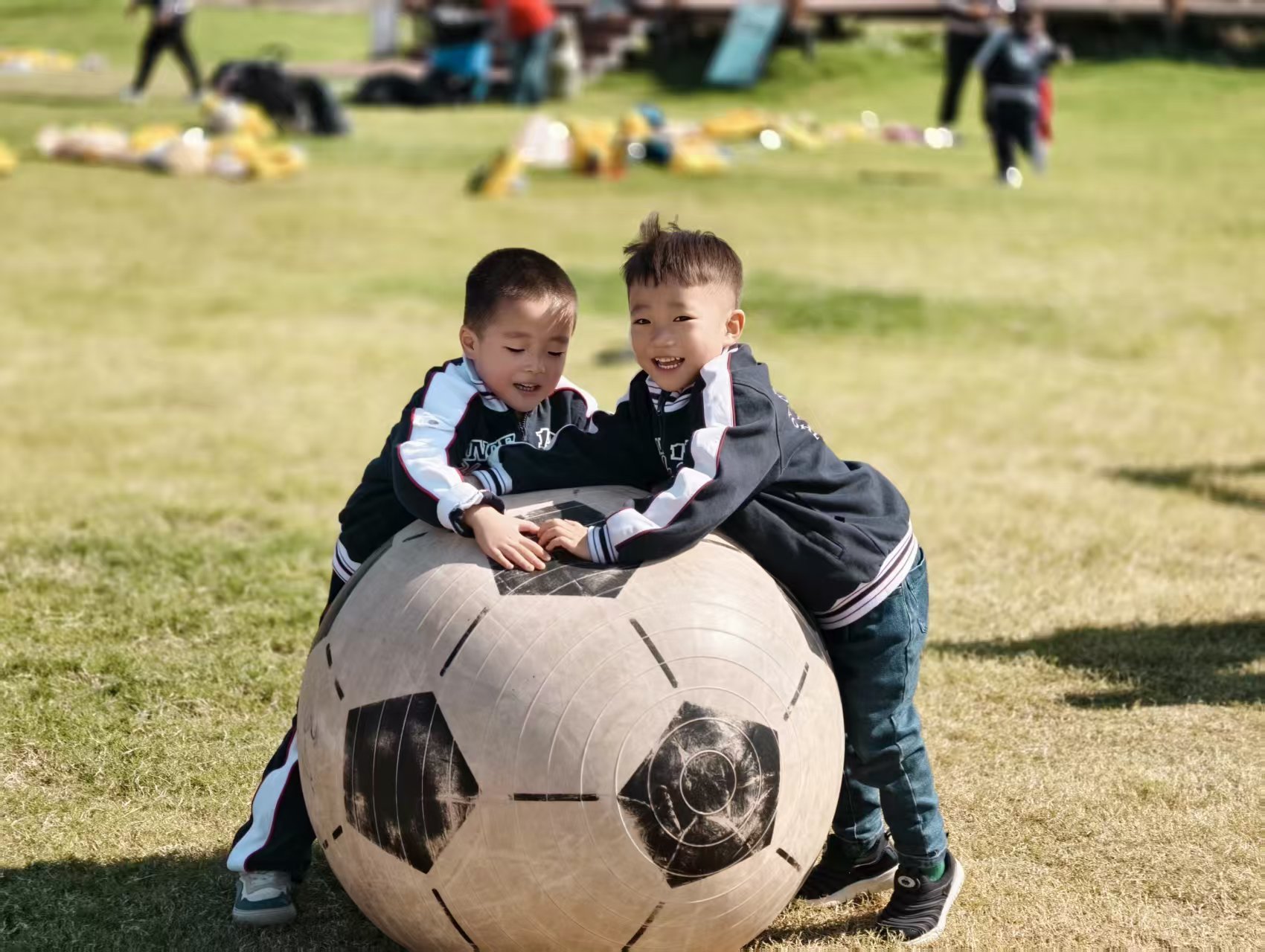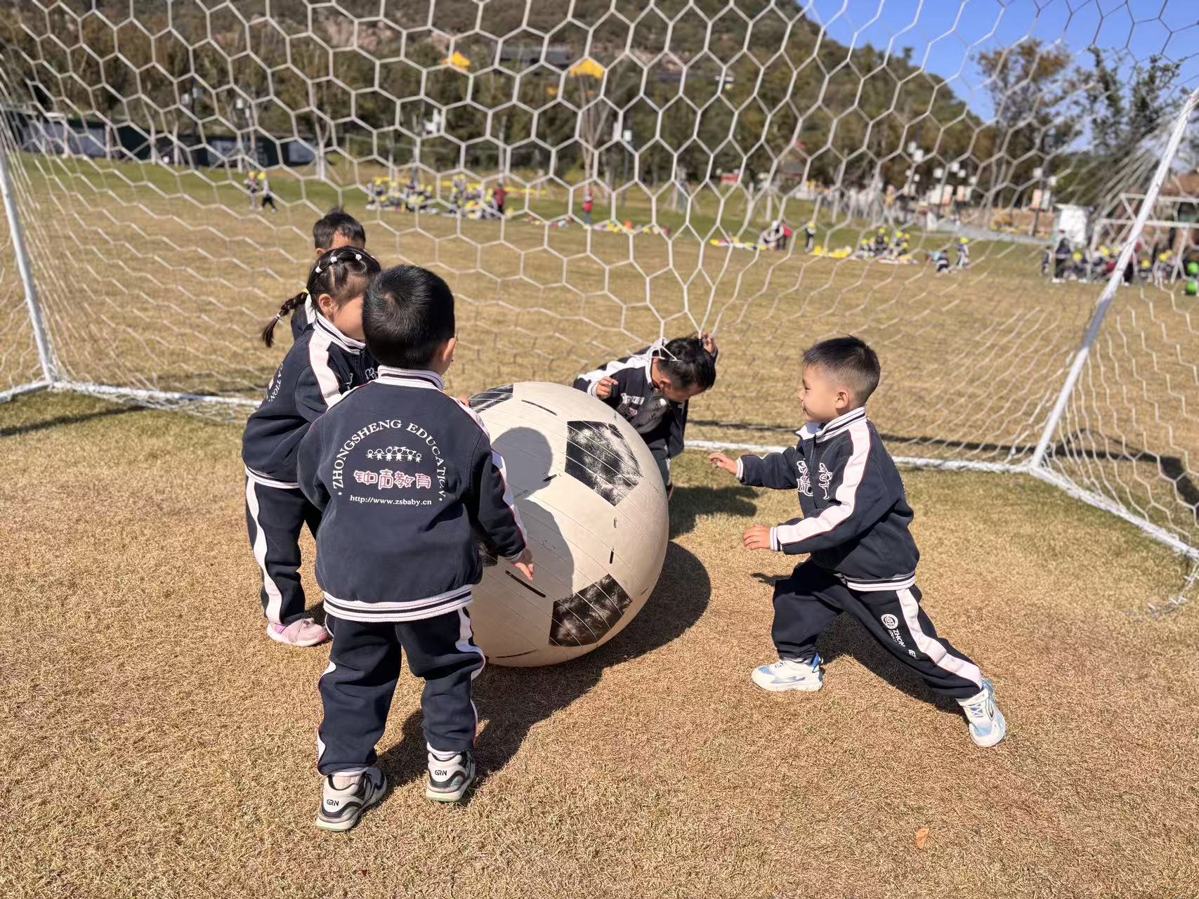 草坪上的巨型足球成了欢乐焦点,你推我挡、协作欢笑,秋日阳光洒在孩子们脸上,把友谊与运动的快乐,定格成最明媚的画面。