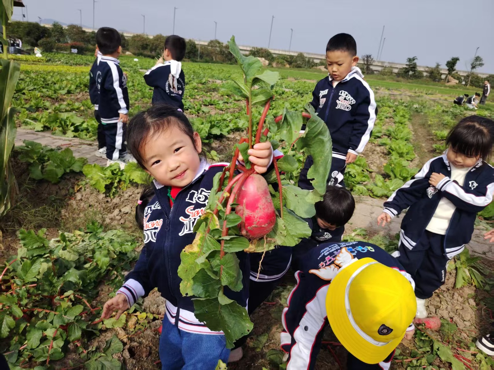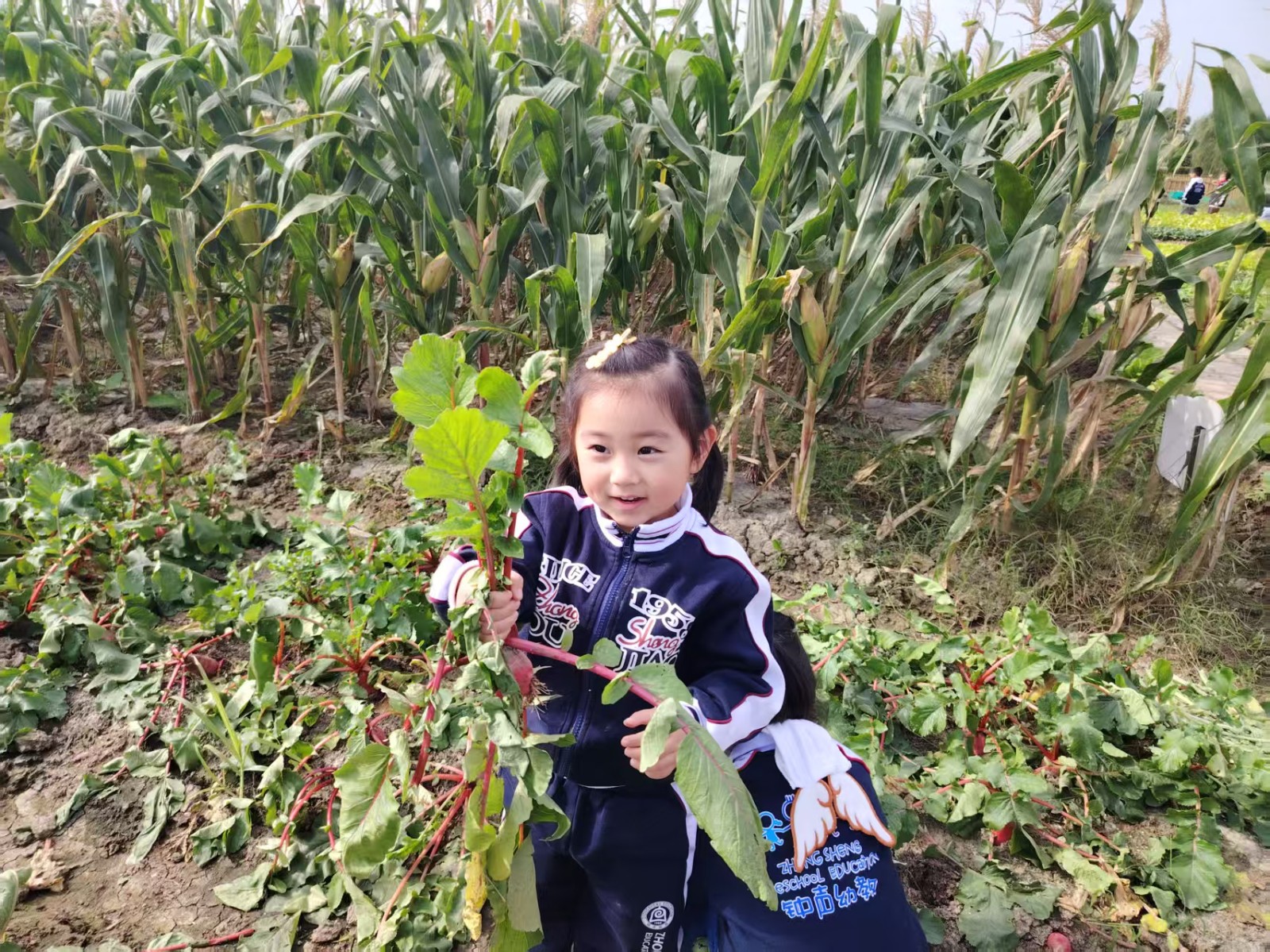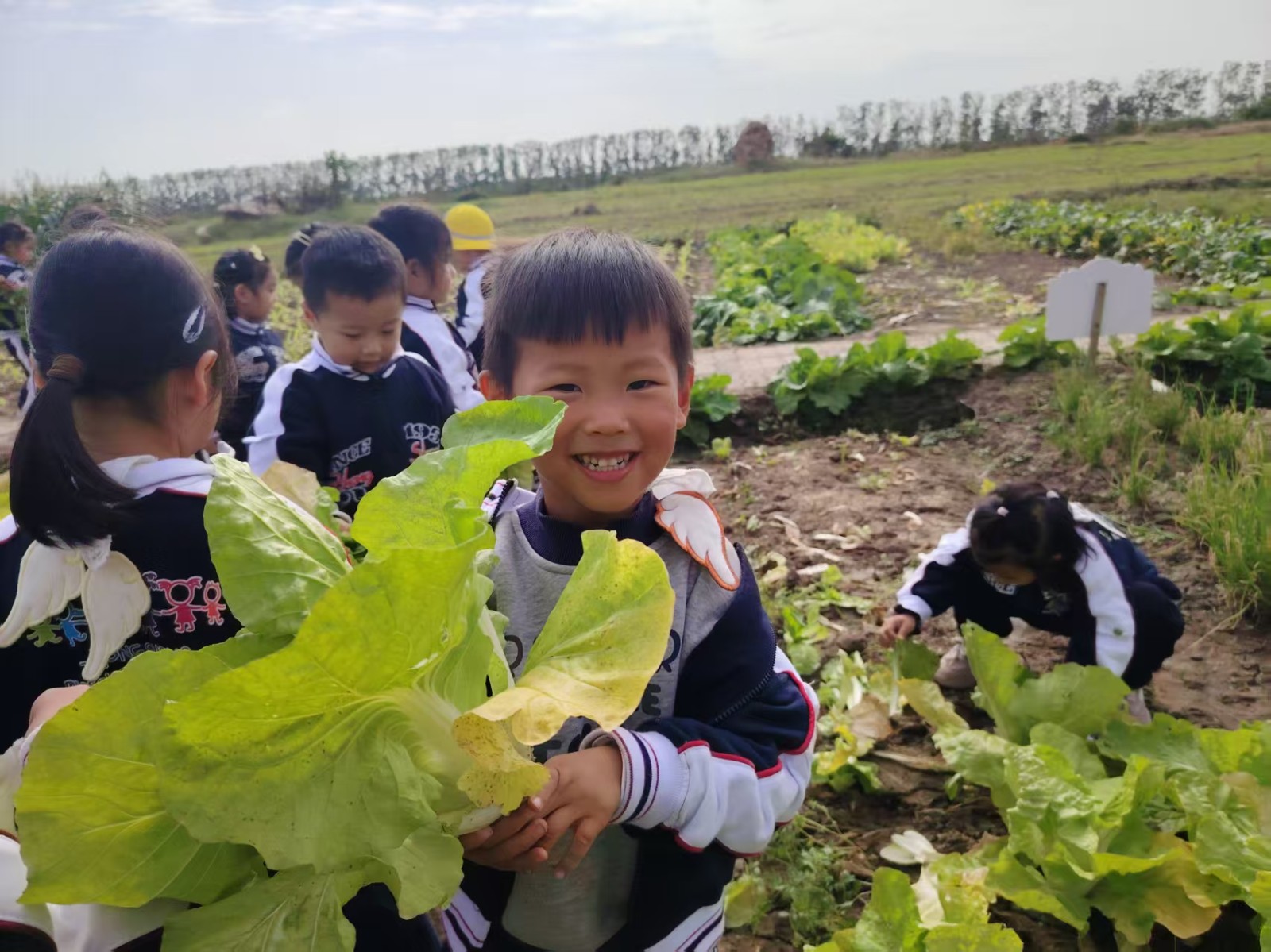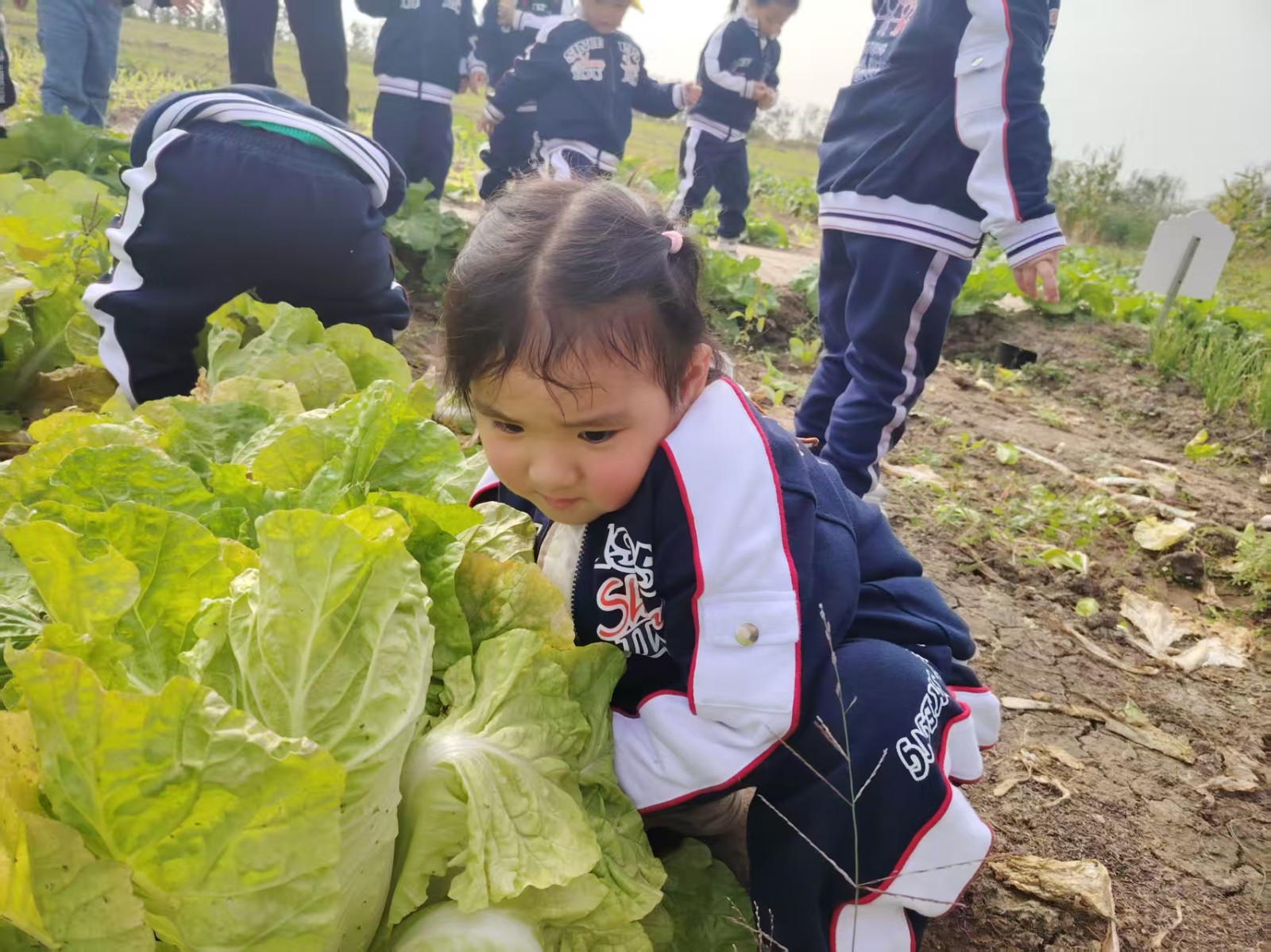 农场里,是他们探索自然的生动课堂。抱着大红萝卜的骄傲神情,蹲在白菜旁的专注模样,在玉米地边的好奇张望……每一株农作物都成了认识世界的鲜活教材,泥土的芬芳里,藏着劳动与收获的小秘密。