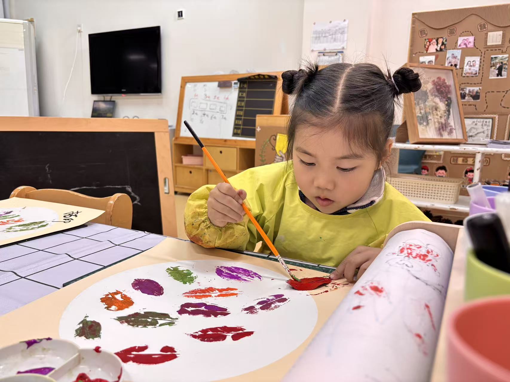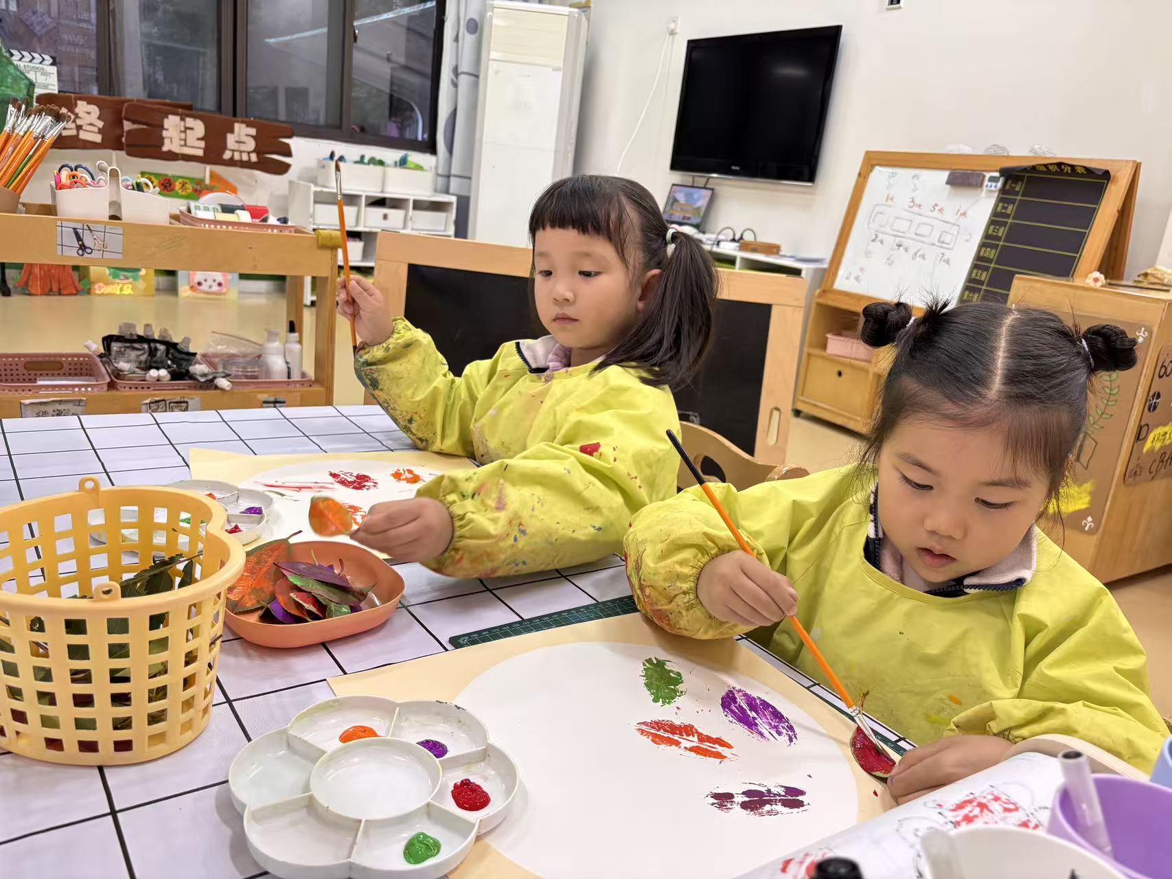 孩子们穿上小围裙,拿起画笔和树叶,在画纸上尽情创作。蘸取颜料,将树叶轻轻按压,红的、绿的、紫的……缤纷色彩在纸上绽放,每一幅作品都是独一无二的秋之印记。