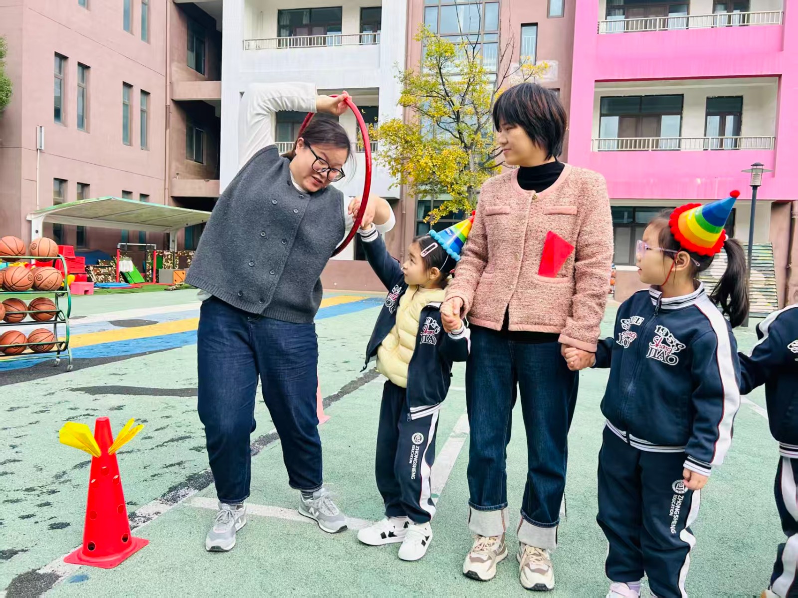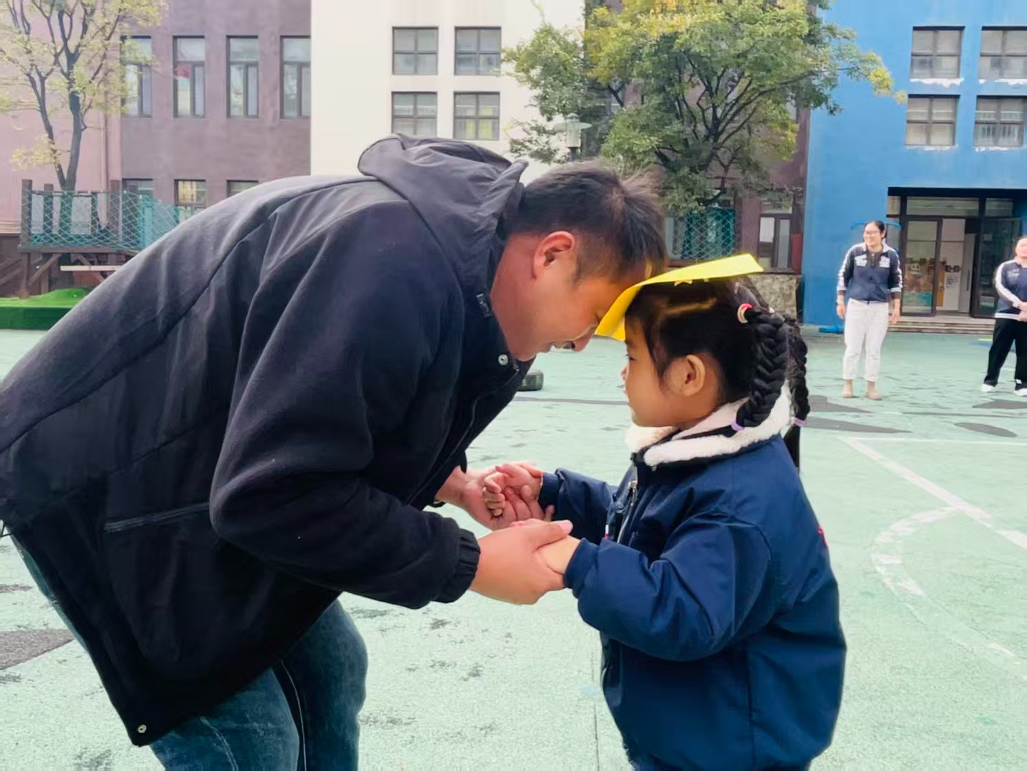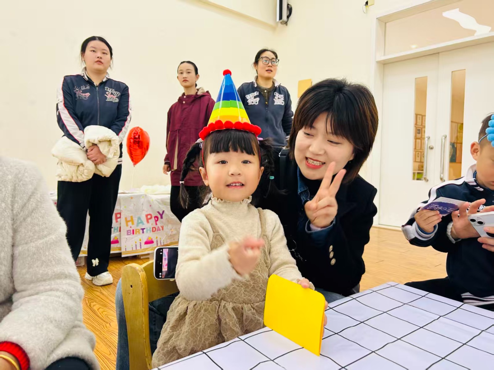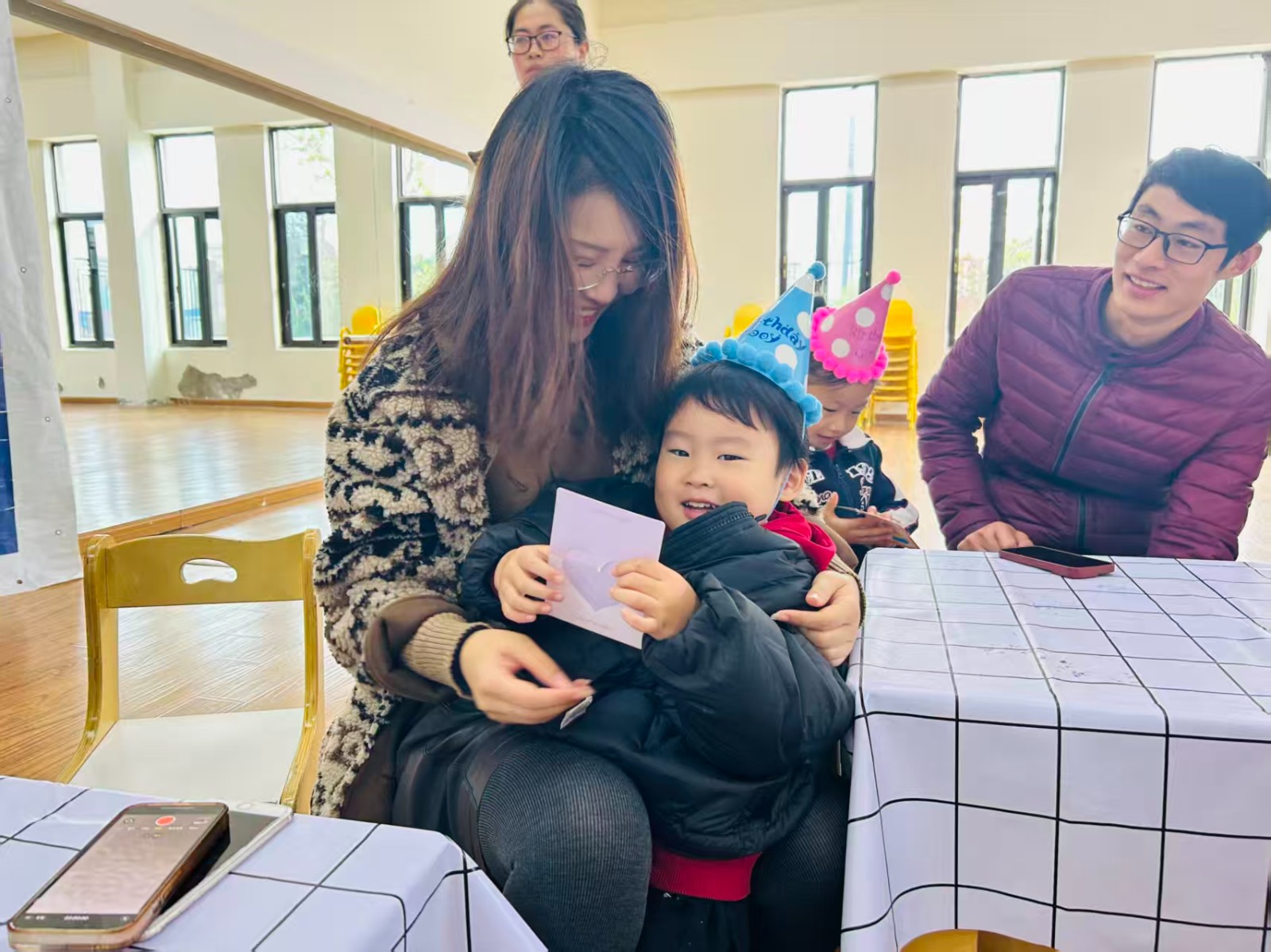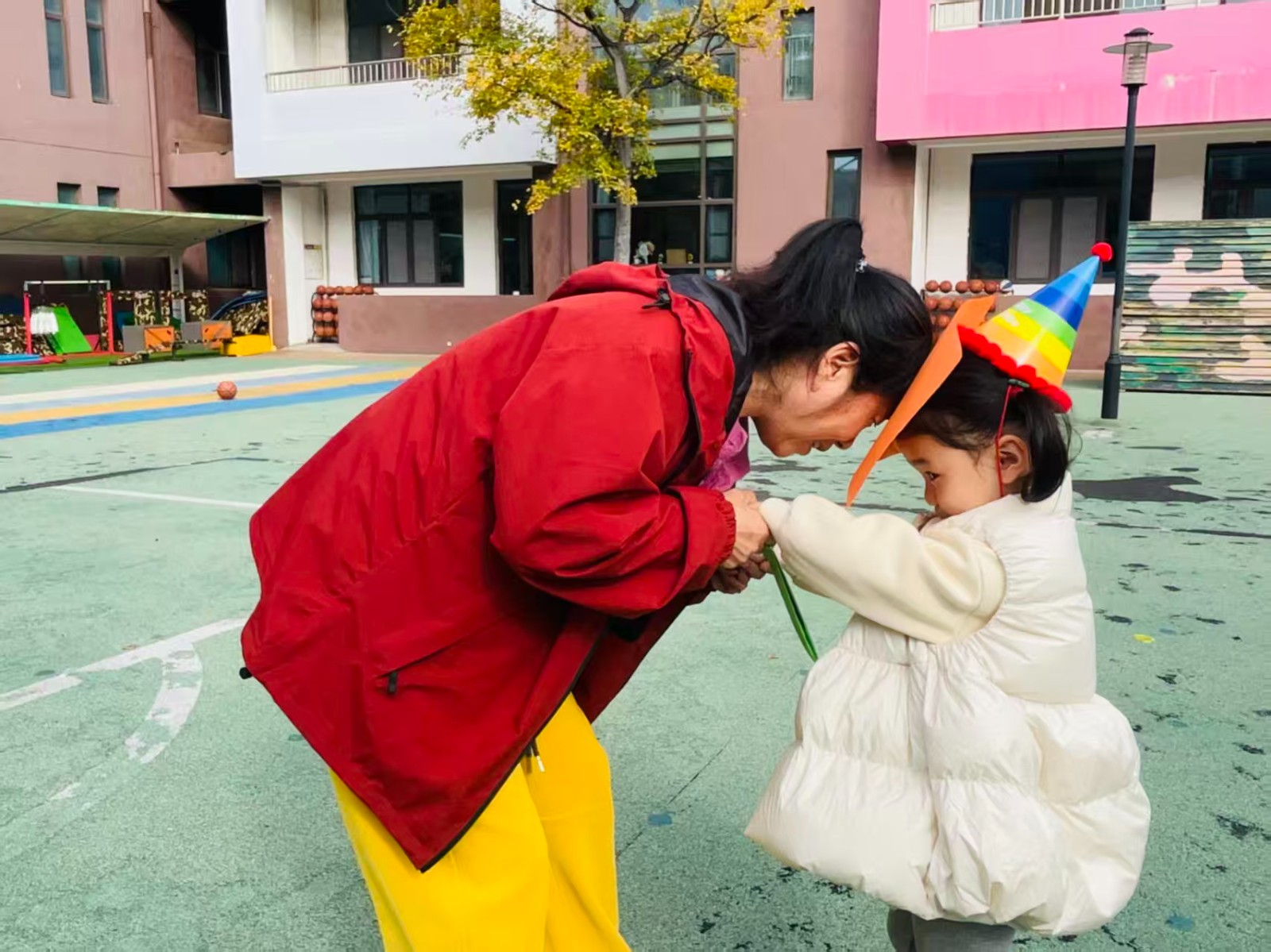 今天的幼儿园是被快乐填满的星球!小寿星们戴着彩虹生日帽,和爸爸妈妈贴贴抱抱~