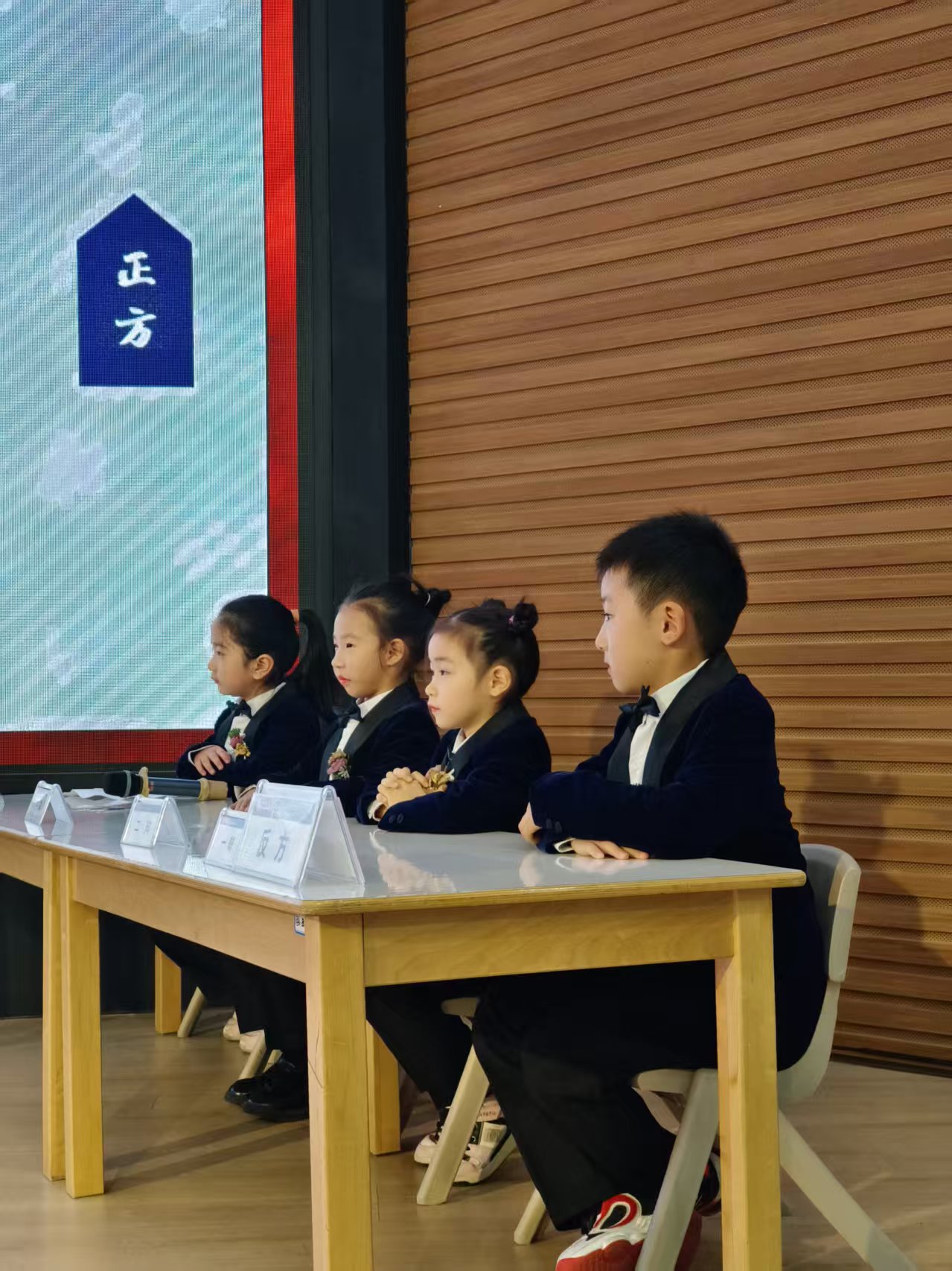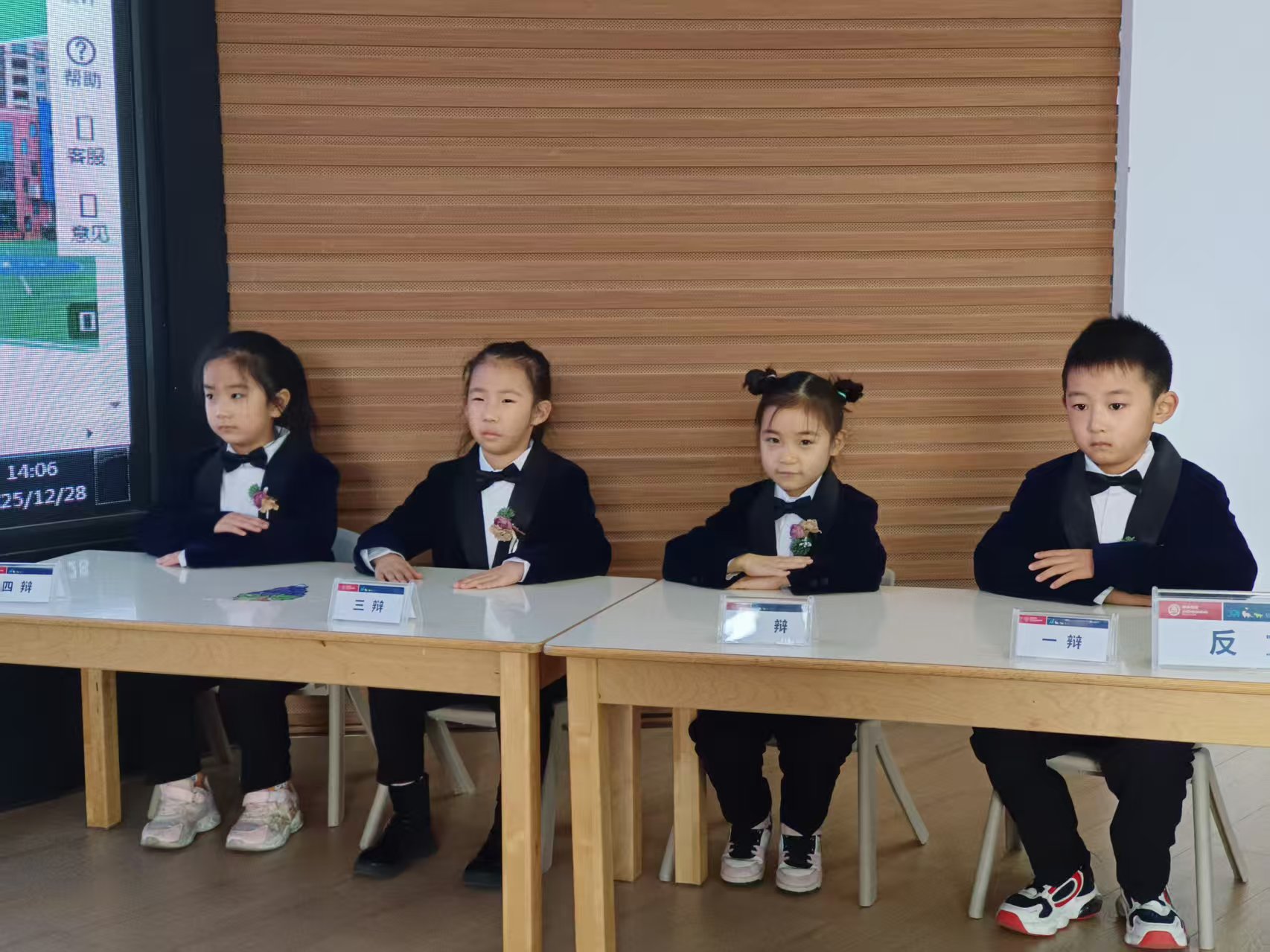 辩论赛现场,孩子们化身小小 “辩论家”:端坐桌前时,小手乖乖放好,眼神里满是认真与专注;讨论环节中,他们挺直小身板,仿佛下一秒就要亮出自己的观点,可爱又 “专业” 的模样,让人忍不住为这些迷你版 “思辨达人” 点赞~