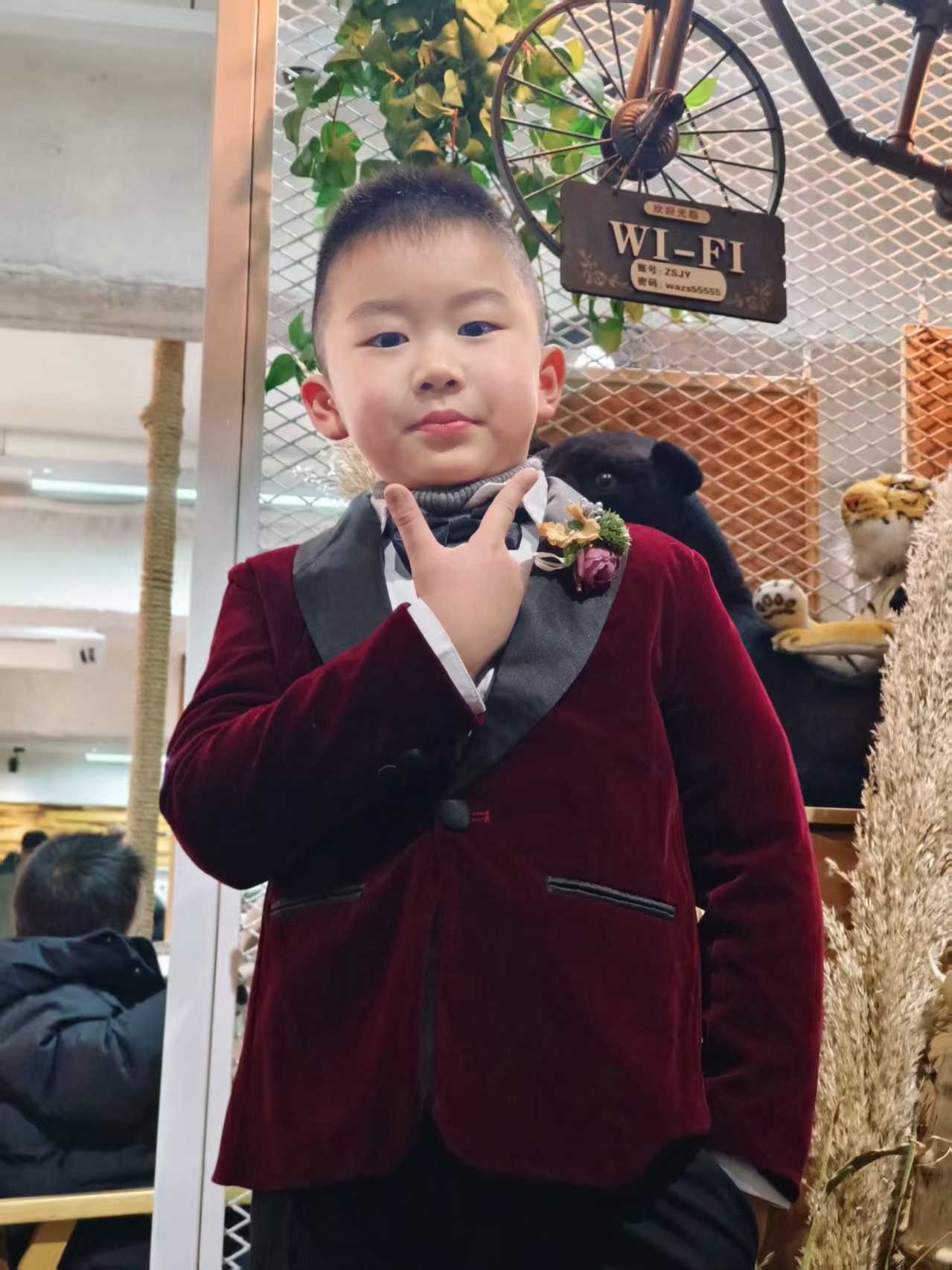 当软萌宝贝遇上笔挺的酒红丝绒小西装,一场充满仪式感的 “思辨之旅” 就此拉开序幕!