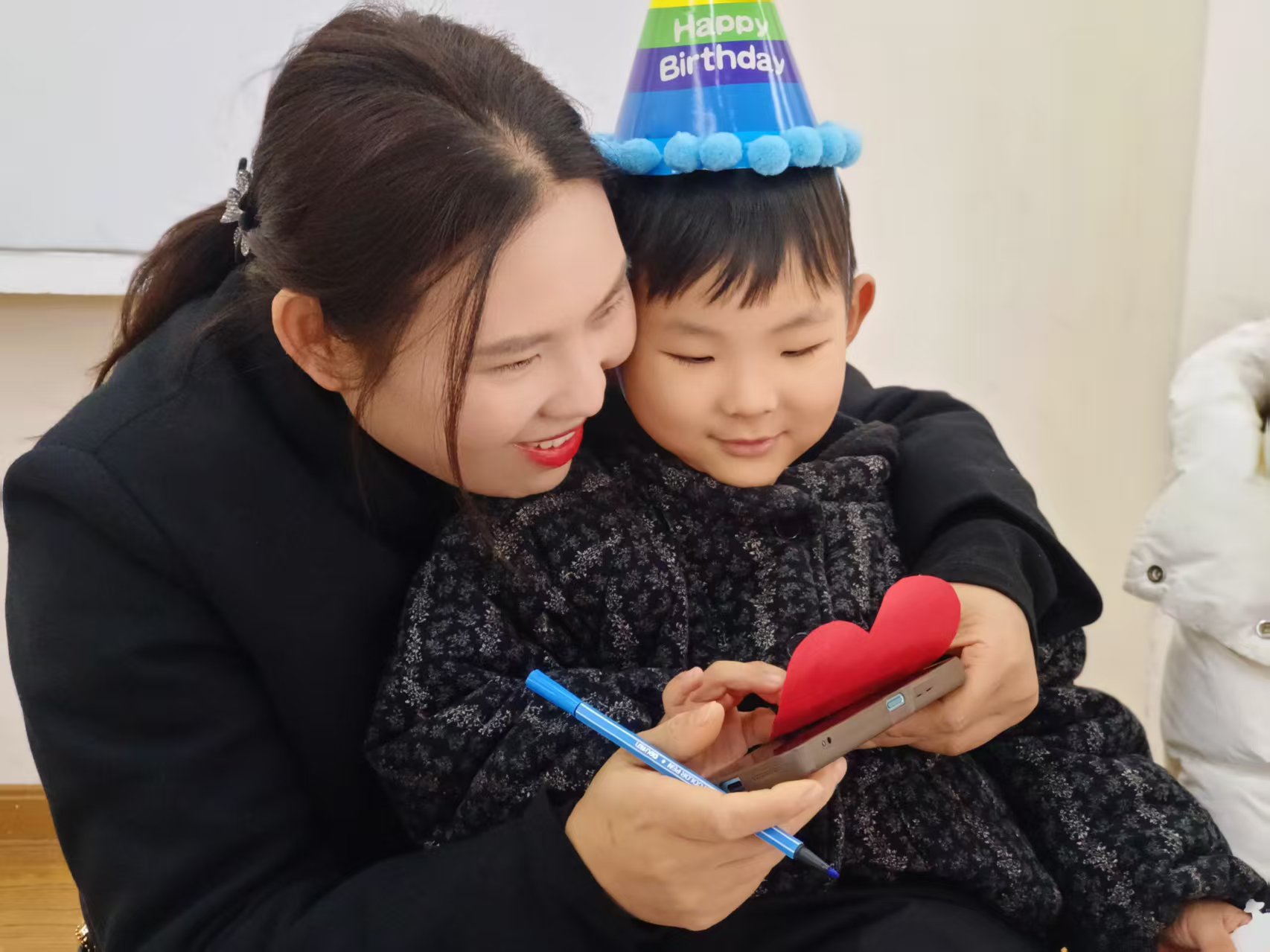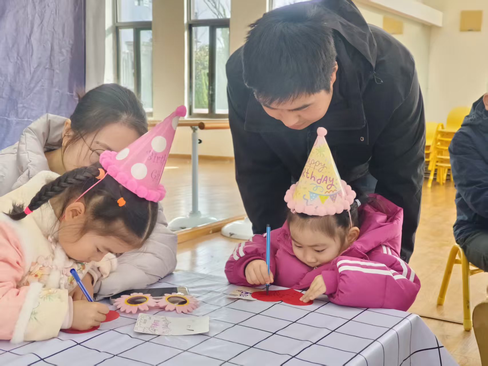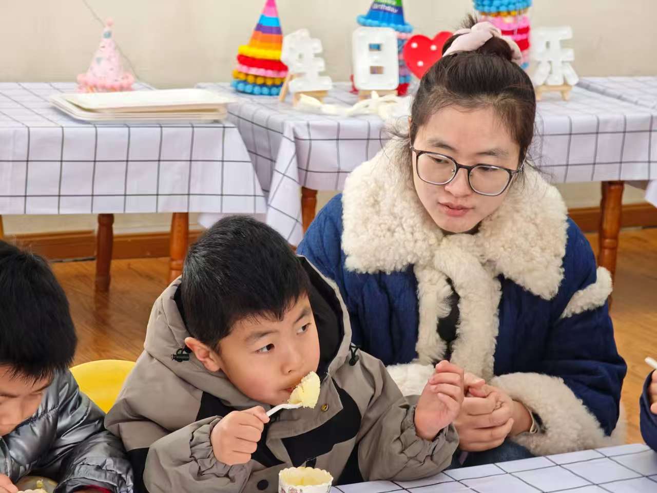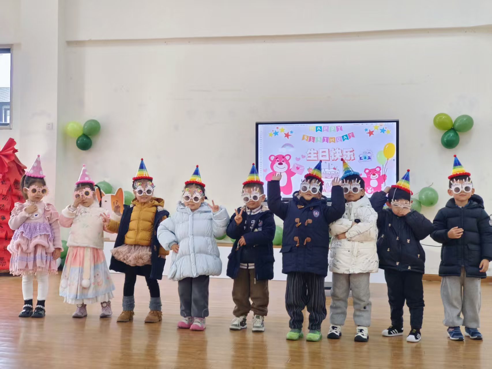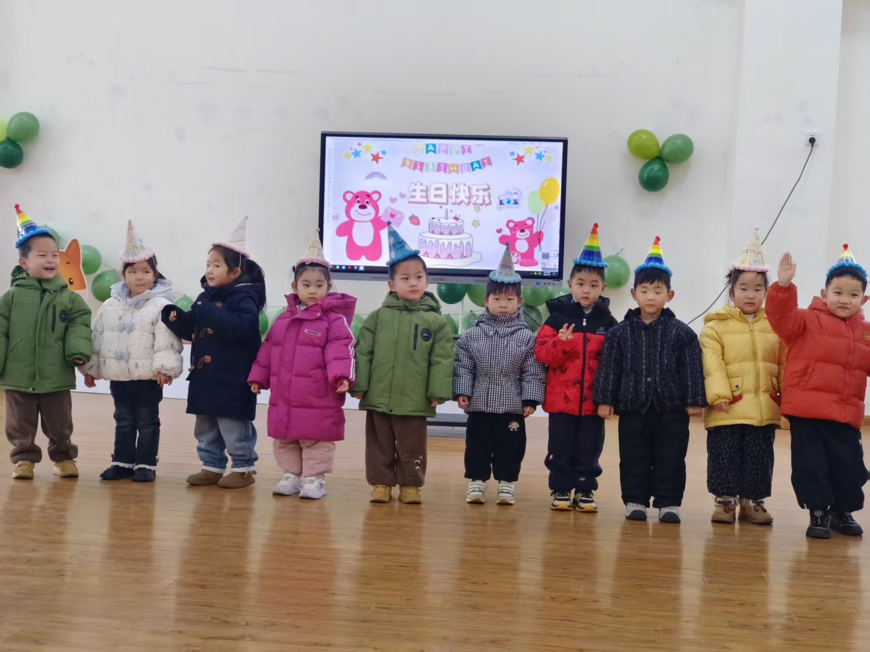 活动伊始,装点一新的活动室便洋溢着欢乐气息。闪烁的彩灯、缤纷的气球、可爱的生日主题屏显,瞬间点燃了孩子们的期待。小寿星们头戴精致的生日帽,脸上洋溢着幸福的笑容,在镜头前留下了一张张天真烂漫的合影,仪式感满满。