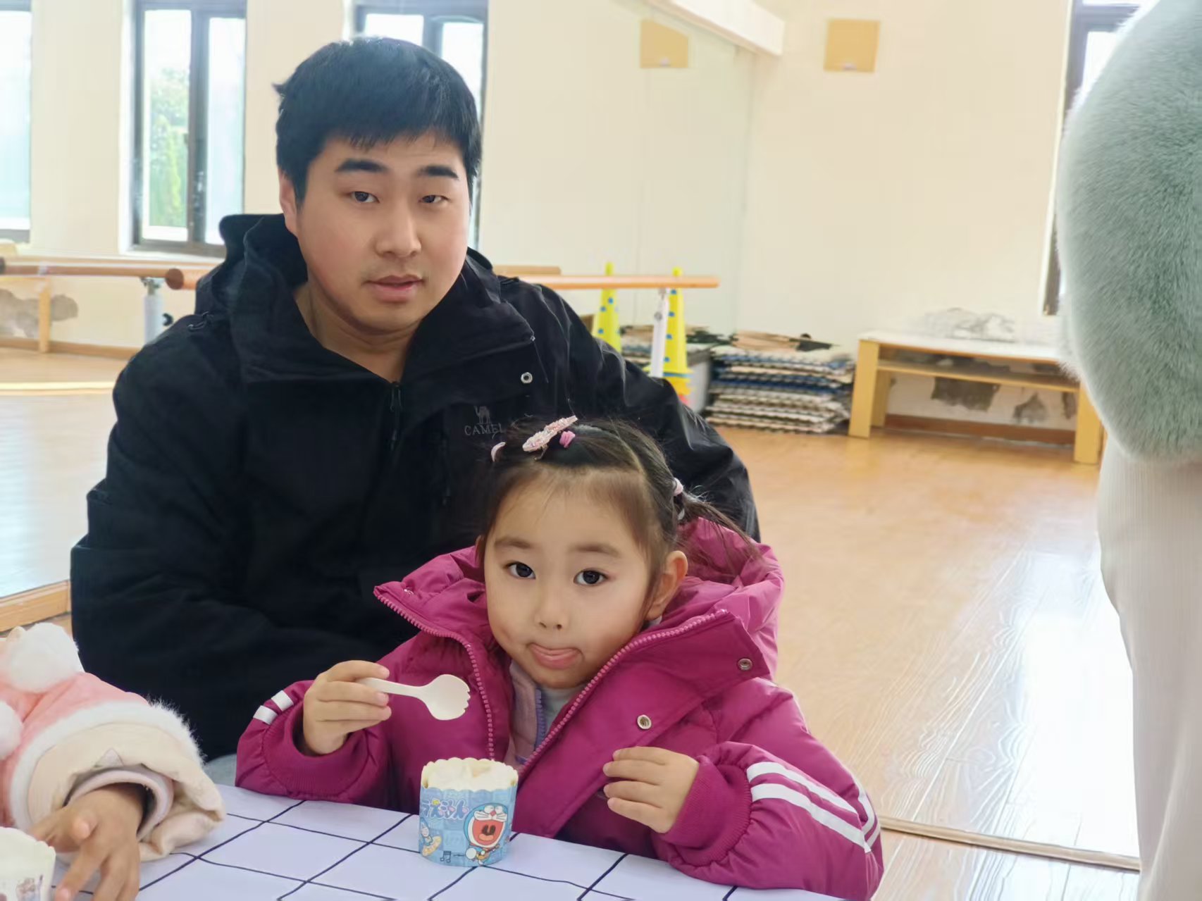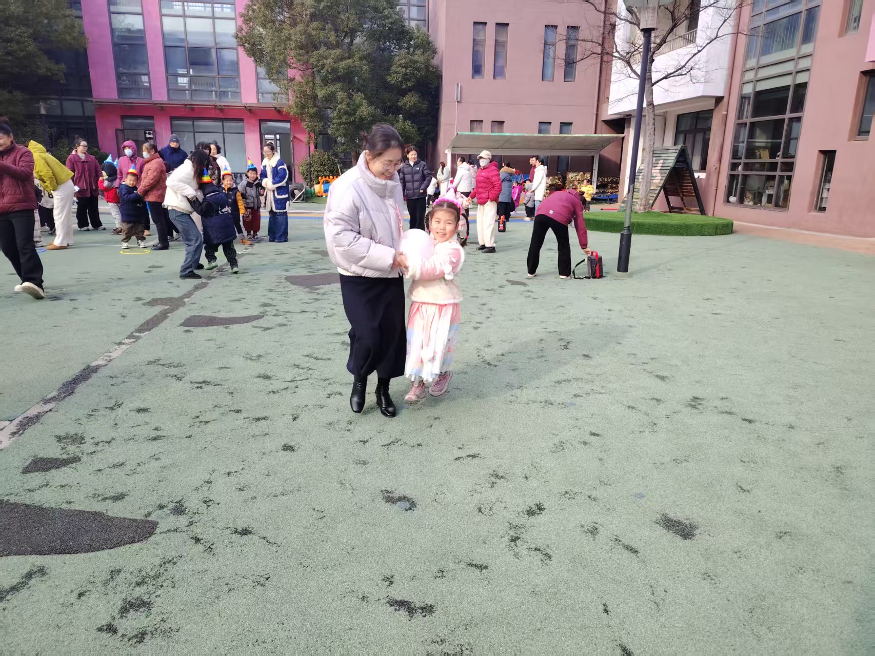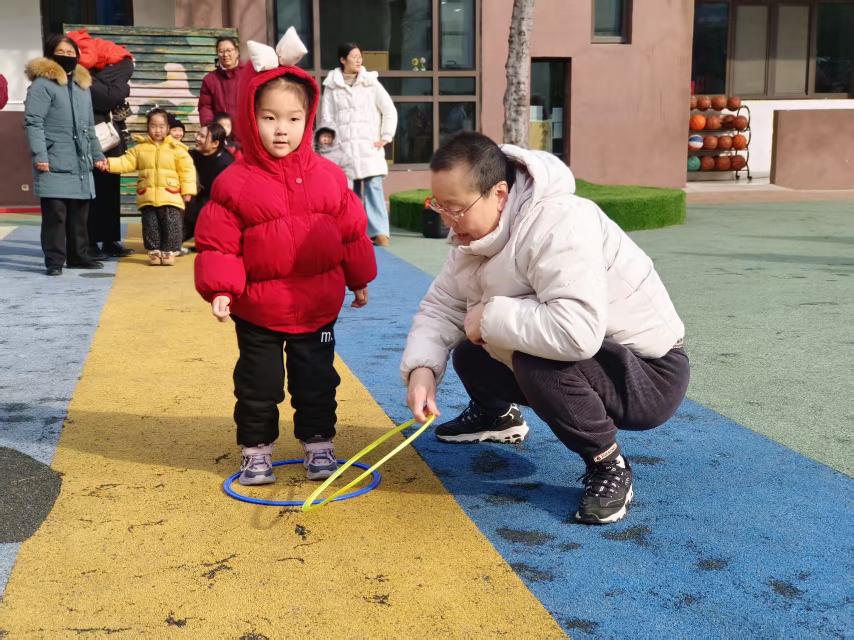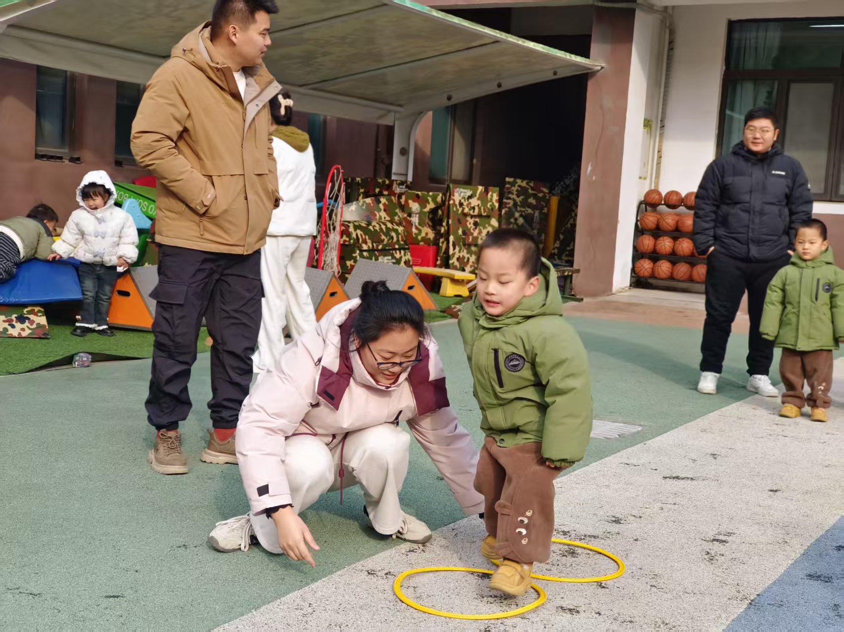 户外游戏场上,热闹同样不减。彩色的跳圈在阳光下格外亮眼,孩子们踩着圈圈蹦跳嬉戏,清脆的笑声回荡在园所的每一个角落。家长们则在一旁驻足观望,目光里满是宠溺与欣慰,亲子间的互动,让冬日的园所充满了暖意。