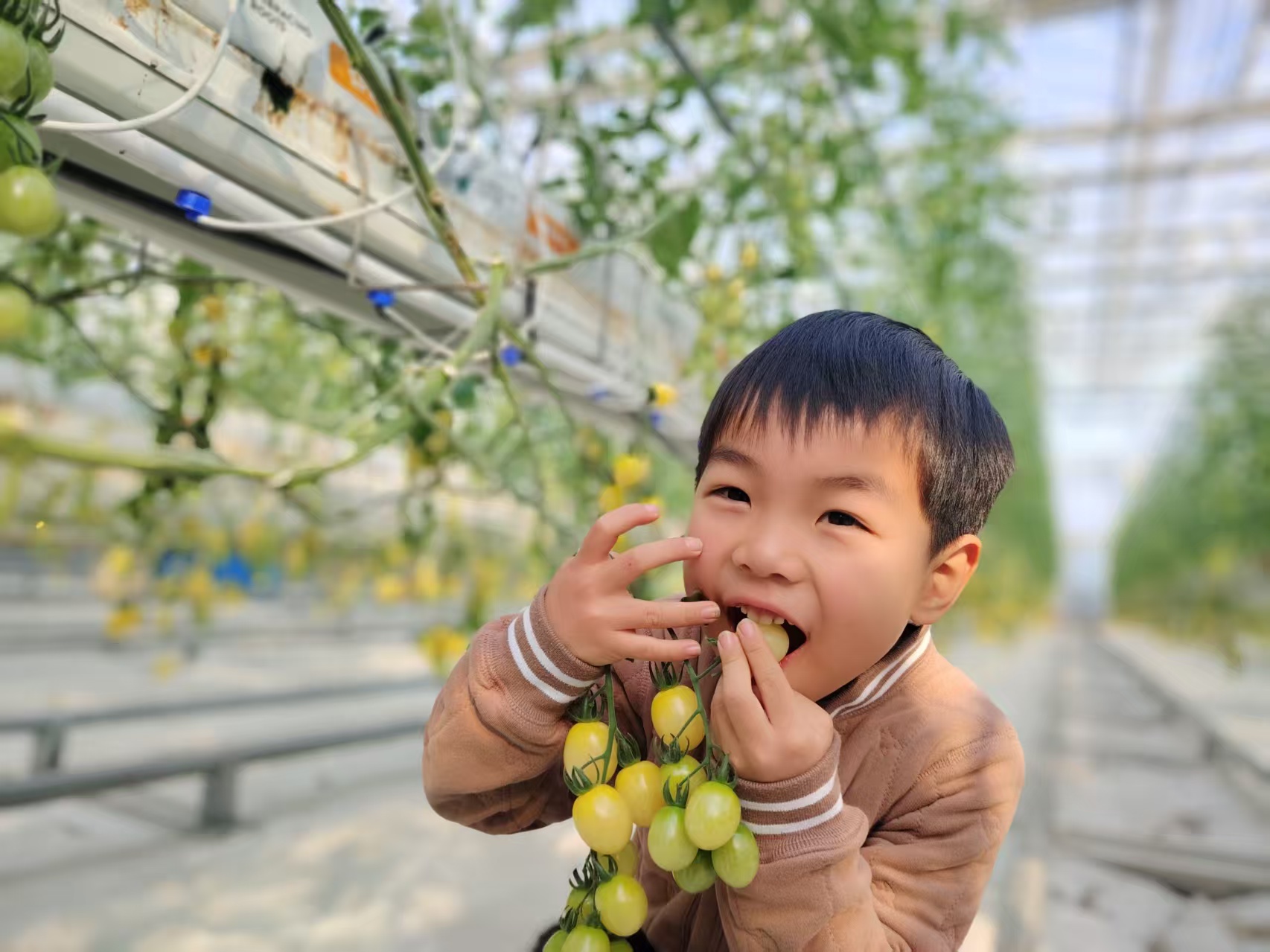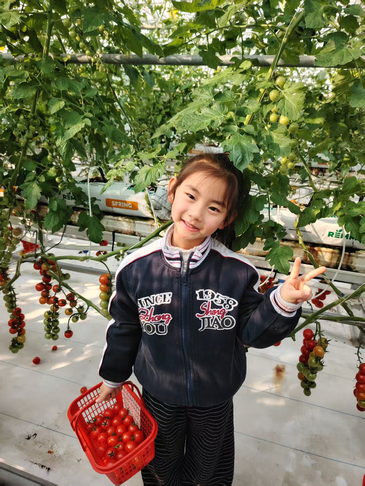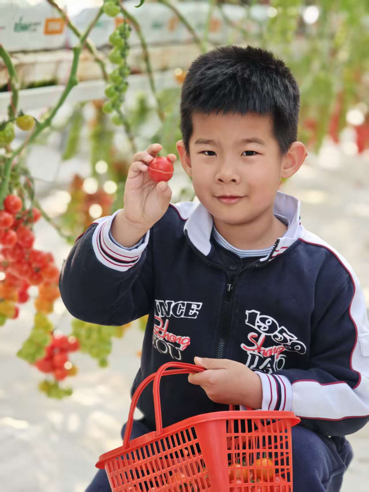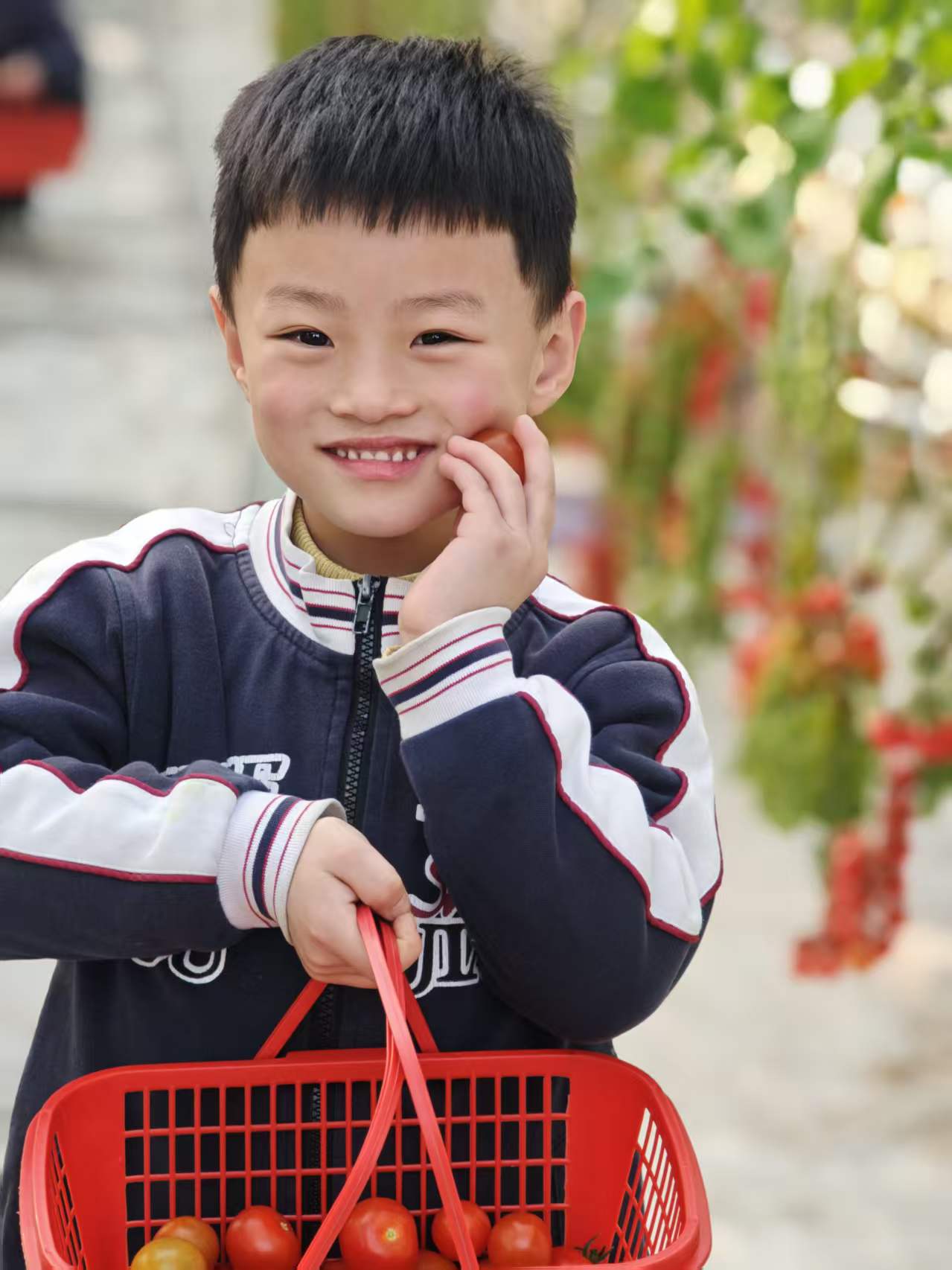一垄垄翠绿的藤蔓间,挂满了红的、黄的、绿的小番茄,像一颗颗小灯笼在绿叶间闪烁,孩子们提着小篮子,化身 “小小采摘家”,小心翼翼地摘下熟透的果实。他们有的捧起番茄和脸蛋比红,有的忍不住直接塞进嘴里,酸甜的汁水在舌尖炸开,瞬间笑开了花~