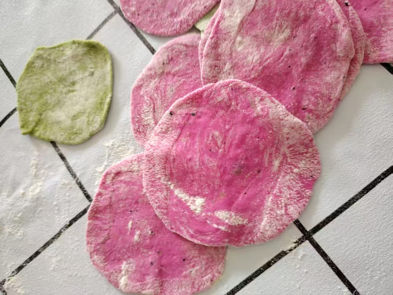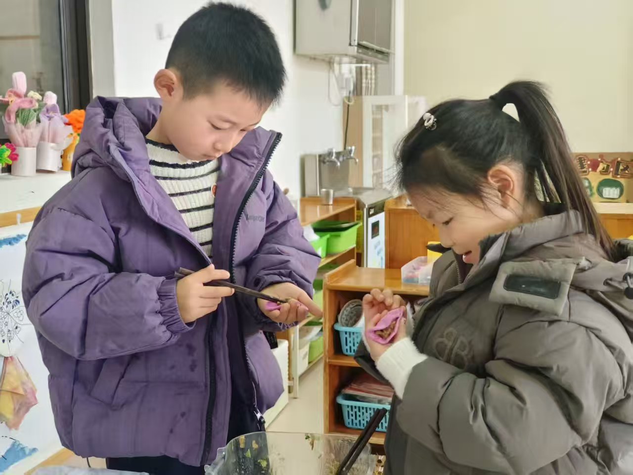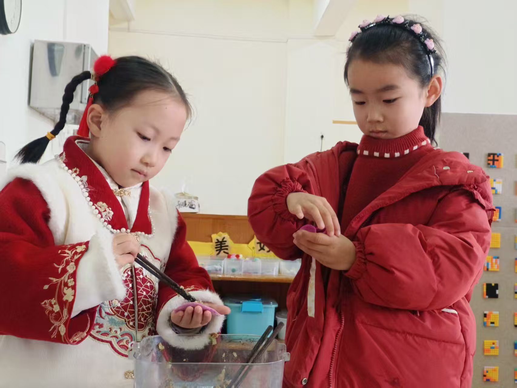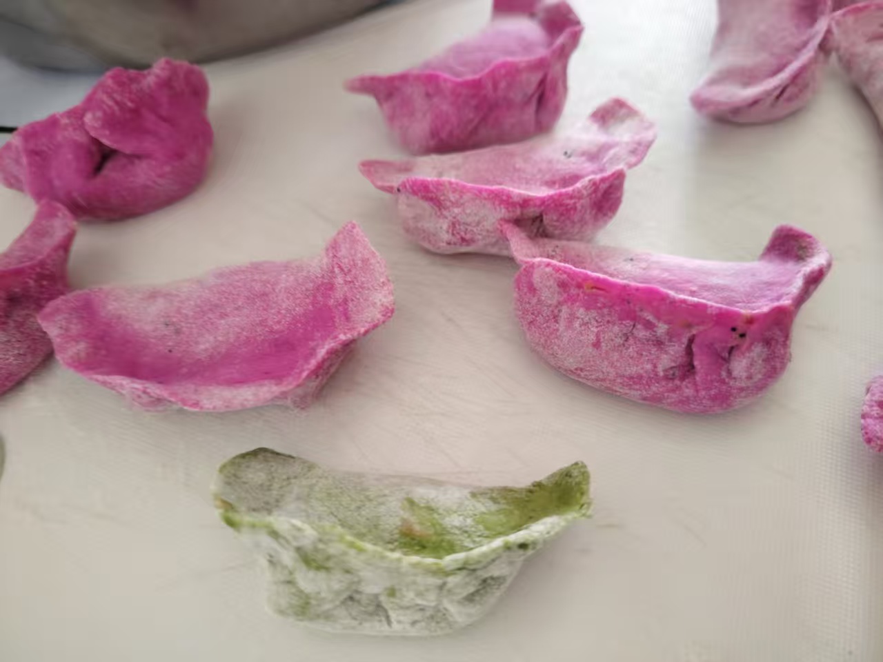 活动前,老师们用火龙果、菠菜汁调制出粉绿相间的果蔬面团,既健康又充满童趣。讲解完包饺子的步骤后,孩子们立刻化身 “小小面点师”,投入创作之中。有的专注擀皮,小手推着擀面杖来回滚动;有的细心填馅,小心翼翼捏合边缘;还有的两两协作,互相分享技巧。中式服饰与鲜艳棉衣的身影穿梭其间,稚嫩的脸庞上写满认真。
