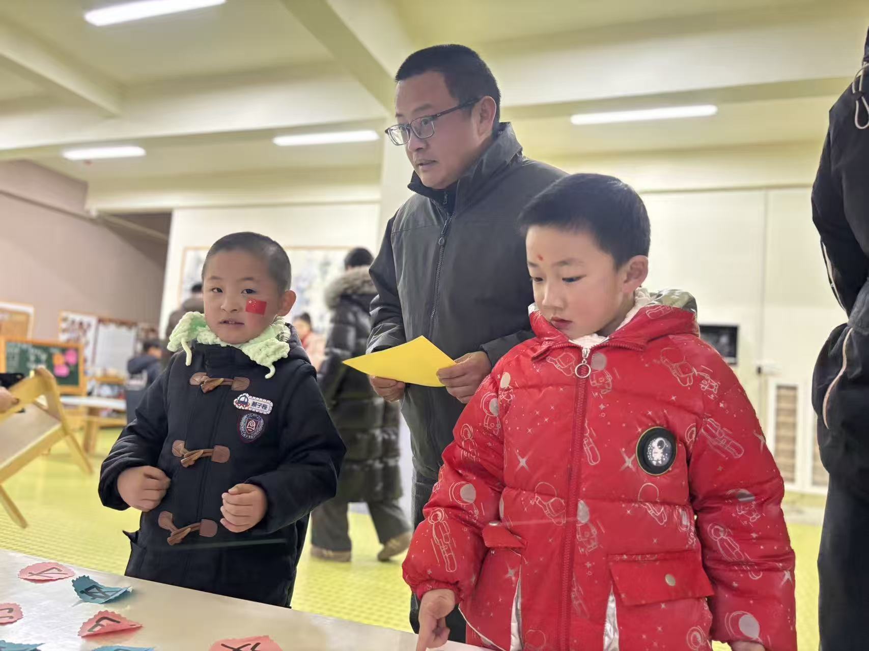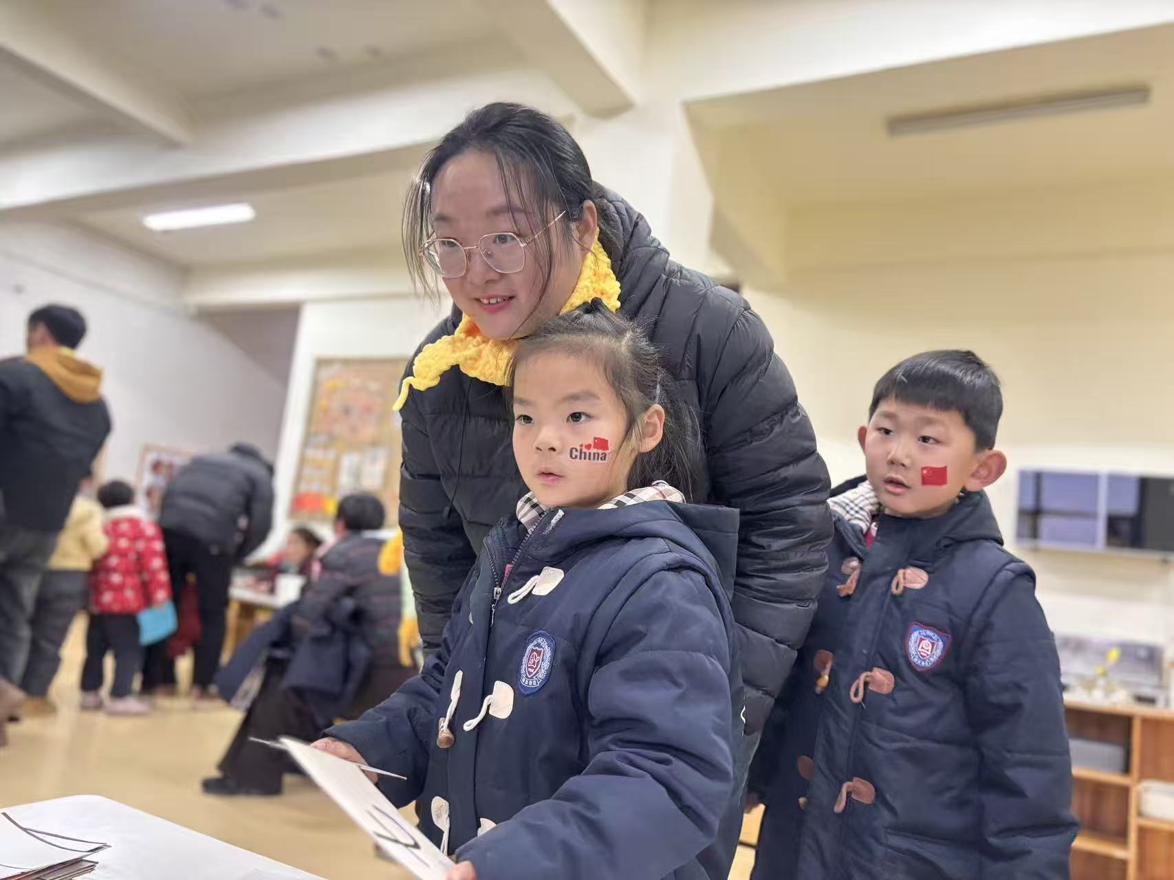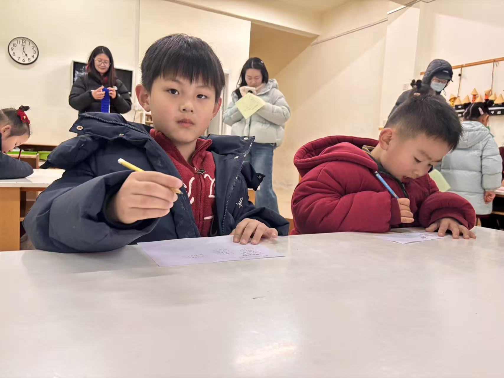 一张张稚嫩的脸庞洋溢着自信的光彩。在识字闯关区,孩子们专注地辨认卡片上的汉字与拼音,小手轻轻点指,准确读出每一个字符,认真的模样让家长们频频点头称赞;在生活技能展示环节,孩子们独立整理床铺,叠被子、铺床单,动作虽略显稚嫩却有条不紊,展现出良好的自理能力;在书写练习区,孩子们握笔书写,一笔一划间尽显成长的力量,老师与家长在旁耐心指导,温暖的陪伴让每一次尝试都充满力量。