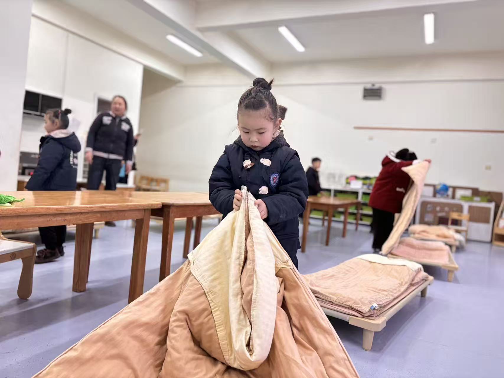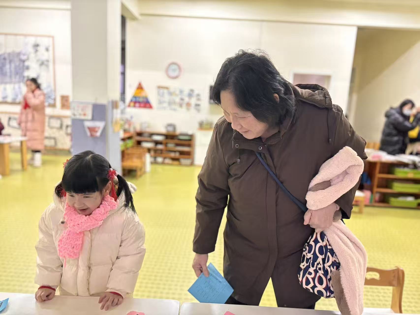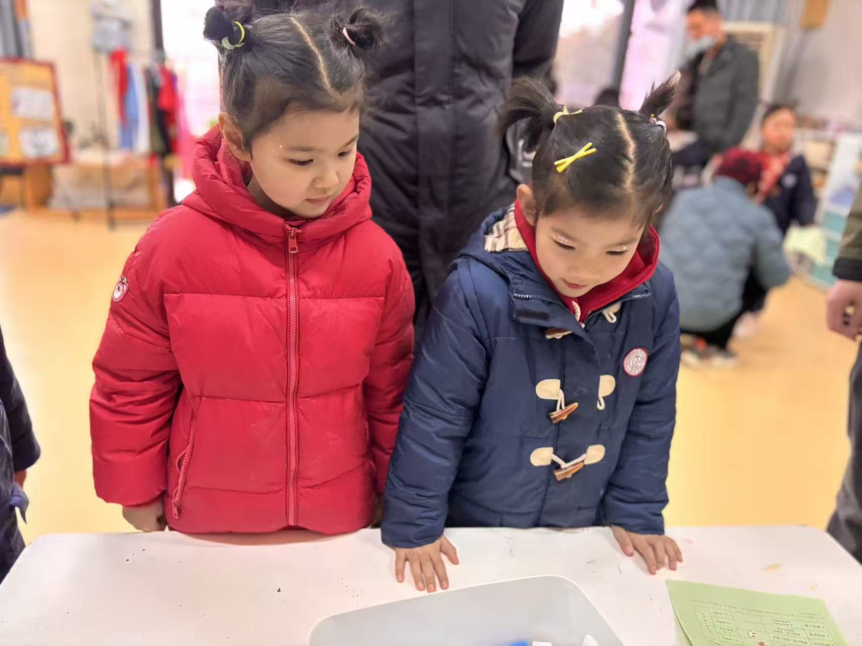 一张张稚嫩的脸庞洋溢着自信的光彩。在识字闯关区,孩子们专注地辨认卡片上的汉字与拼音,小手轻轻点指,准确读出每一个字符,认真的模样让家长们频频点头称赞;在生活技能展示环节,孩子们独立整理床铺,叠被子、铺床单,动作虽略显稚嫩却有条不紊,展现出良好的自理能力;在书写练习区,孩子们握笔书写,一笔一划间尽显成长的力量,老师与家长在旁耐心指导,温暖的陪伴让每一次尝试都充满力量。