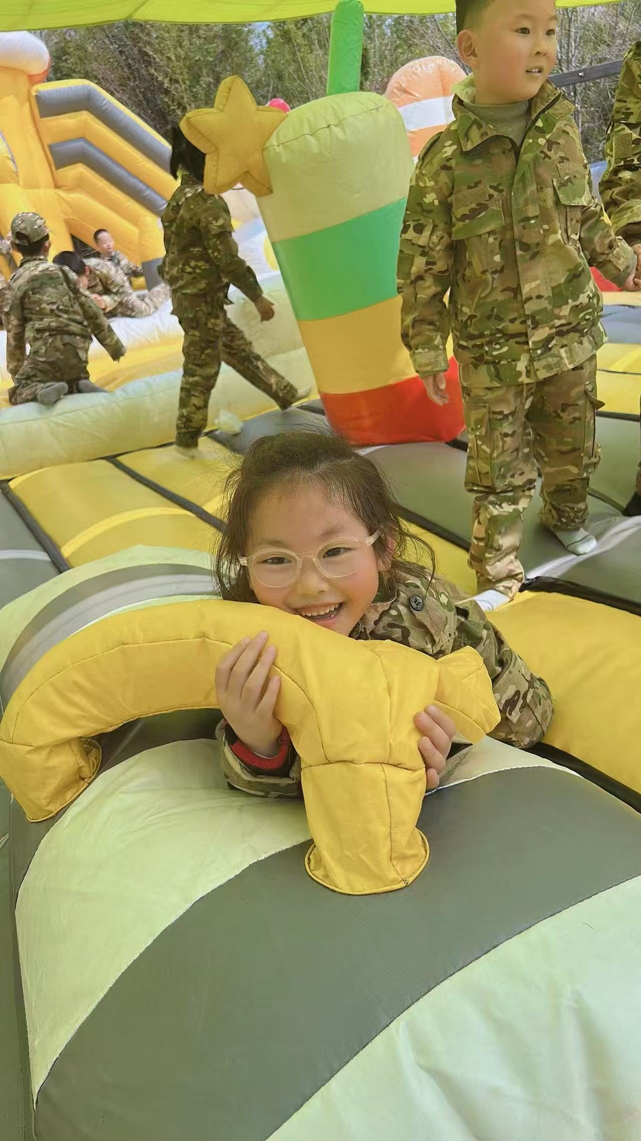 活动中,宝贝们化身小小特种兵,沉浸式体验军旅项目,锻炼勇气与毅力;漫步春日花海,与小伙伴合影留念,感受春日美好;参与花草拓印手工,用自然材料创作专属作品,激发创造力;畅玩充气游乐设施,尽情奔跑嬉戏,释放童年活力。本次春游不仅让宝贝们亲近了自然、收获了快乐,更在集体活动中学会了分享与合作,培养了规则意识与团队精神。