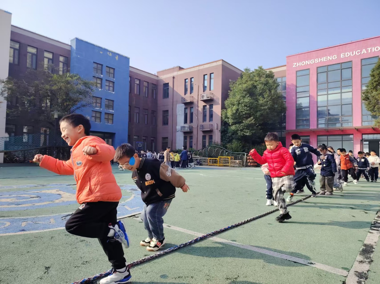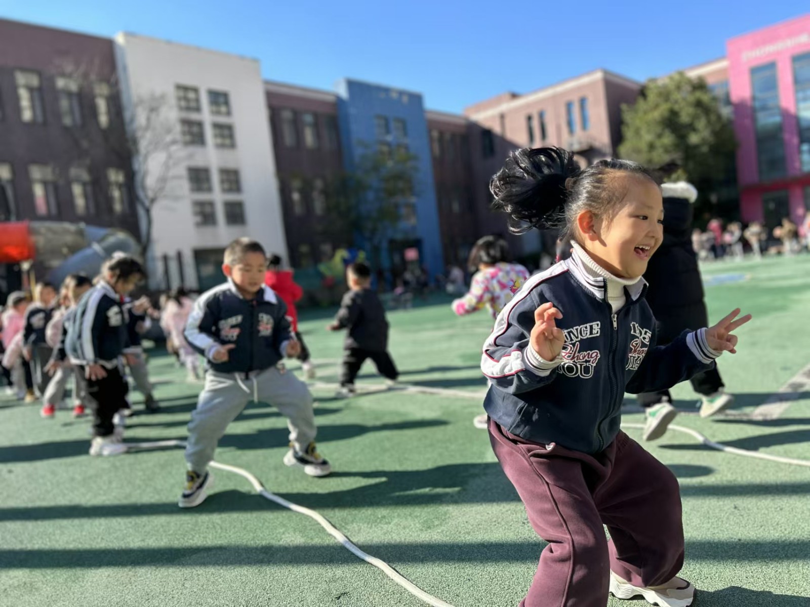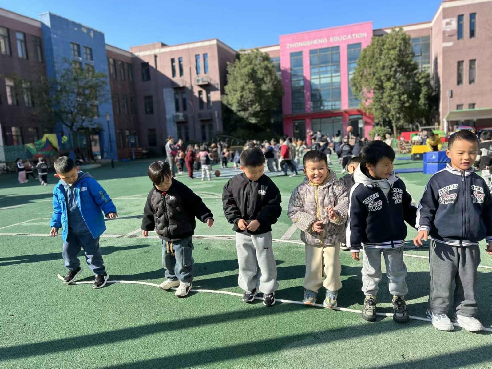 运动使人愉悦,运动使人强健。钟声红色园一直重视幼儿体能发展,在丰富多彩的晨间户外活动中不断增强体质,培养幼儿的耐力和韧性,促进幼儿体智能全面发展。