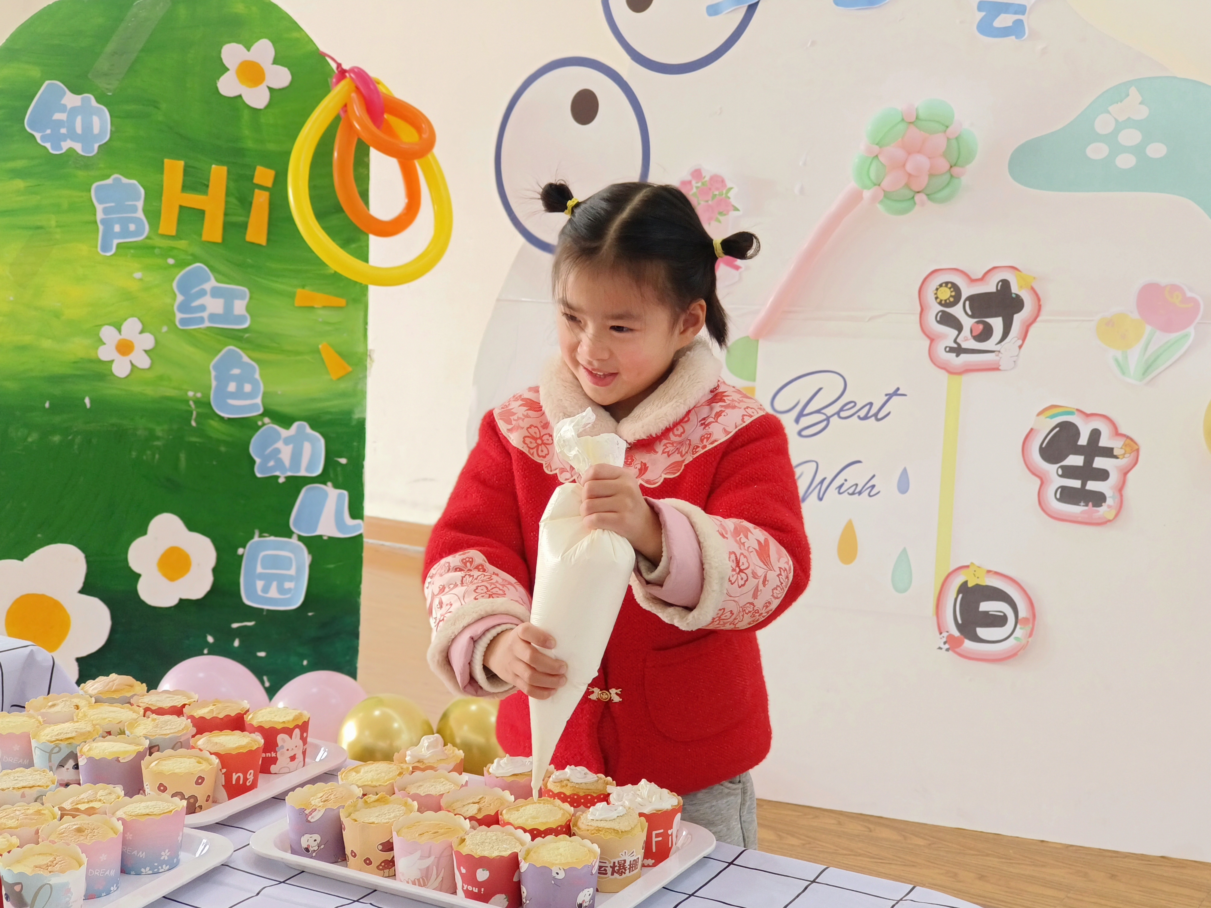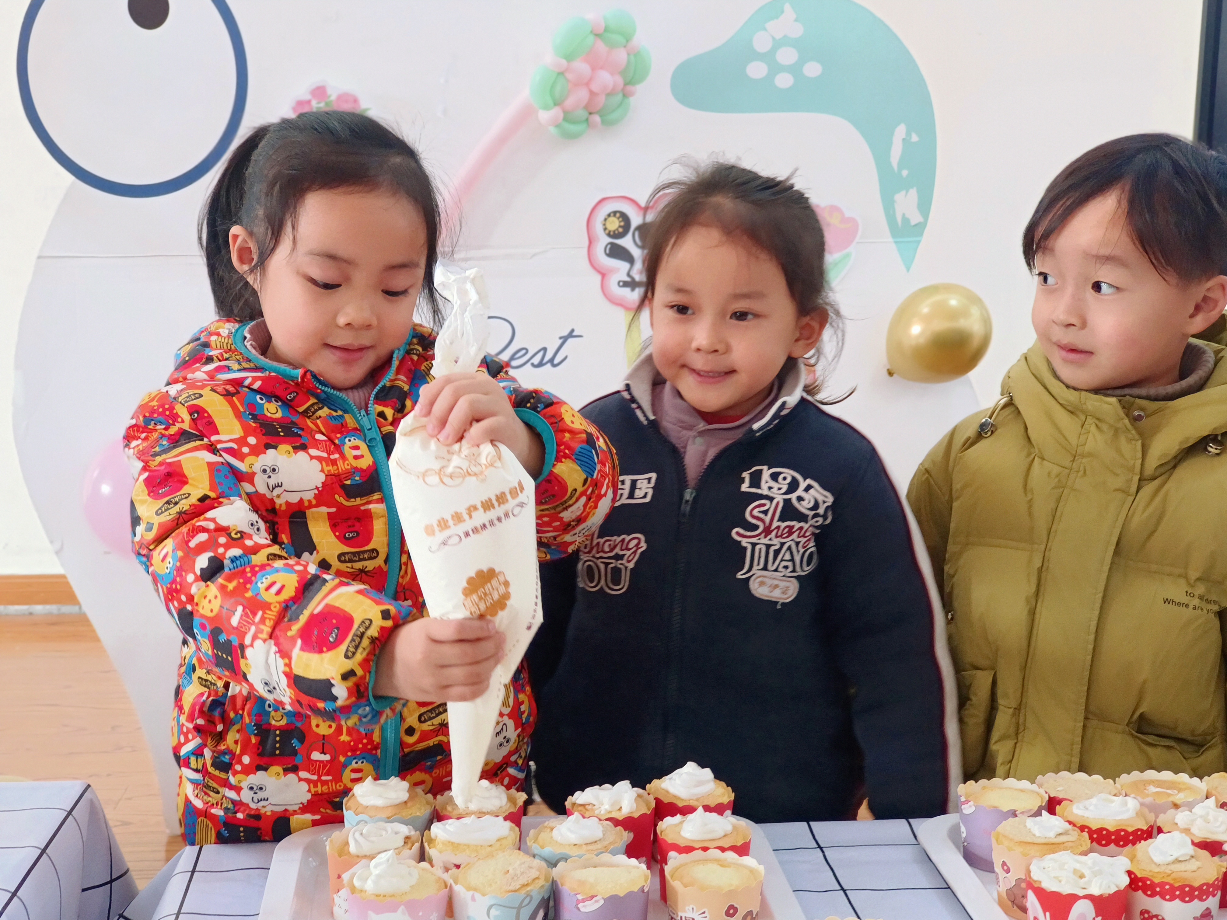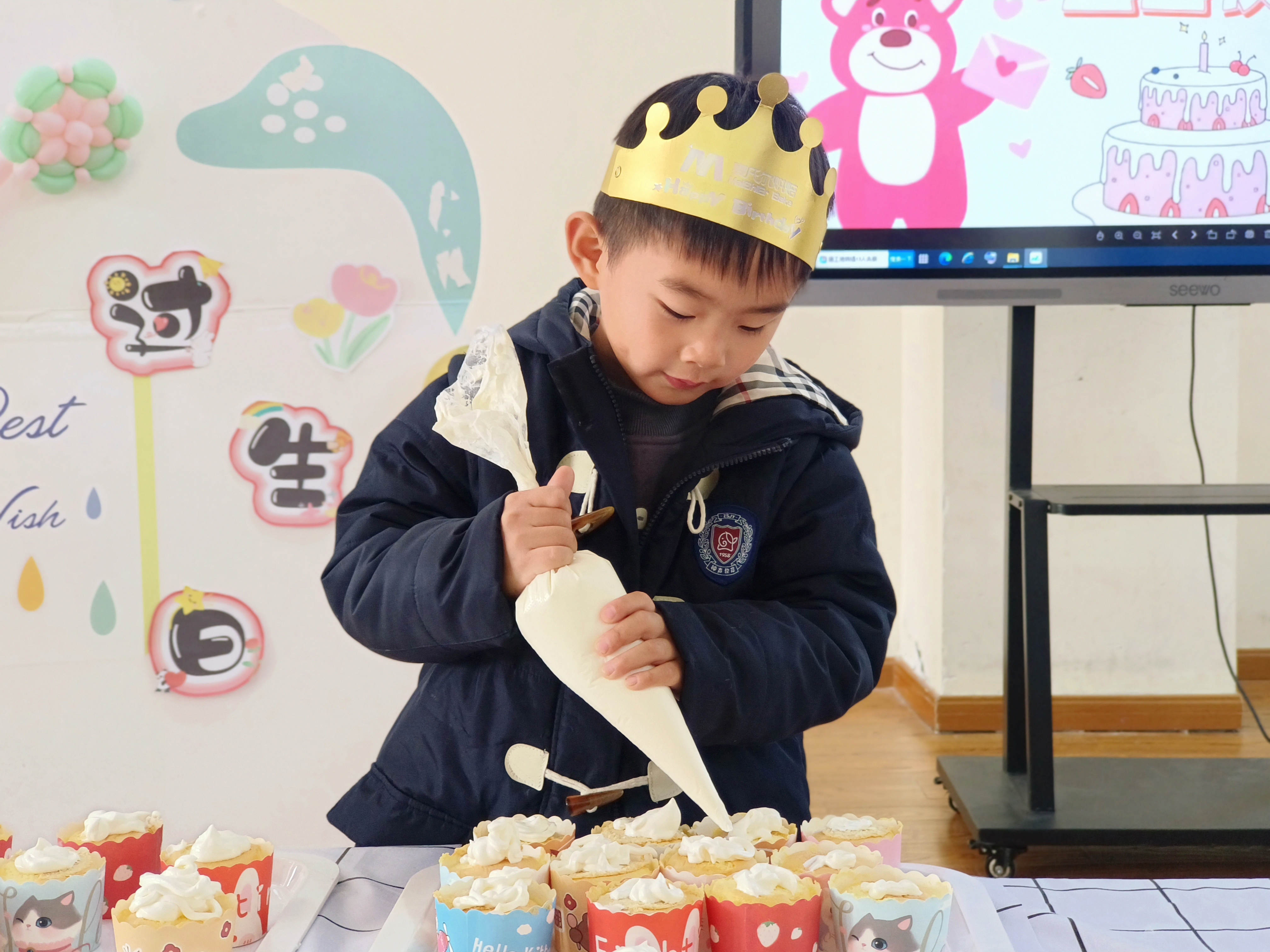 一场温馨的集体生日会正在进行。小朋友们亲自动手制作蛋糕,小脸上沾满了奶油,却满脸洋溢着幸福的笑容。他们互相协作,创造出一个个造型各异的蛋糕作品。