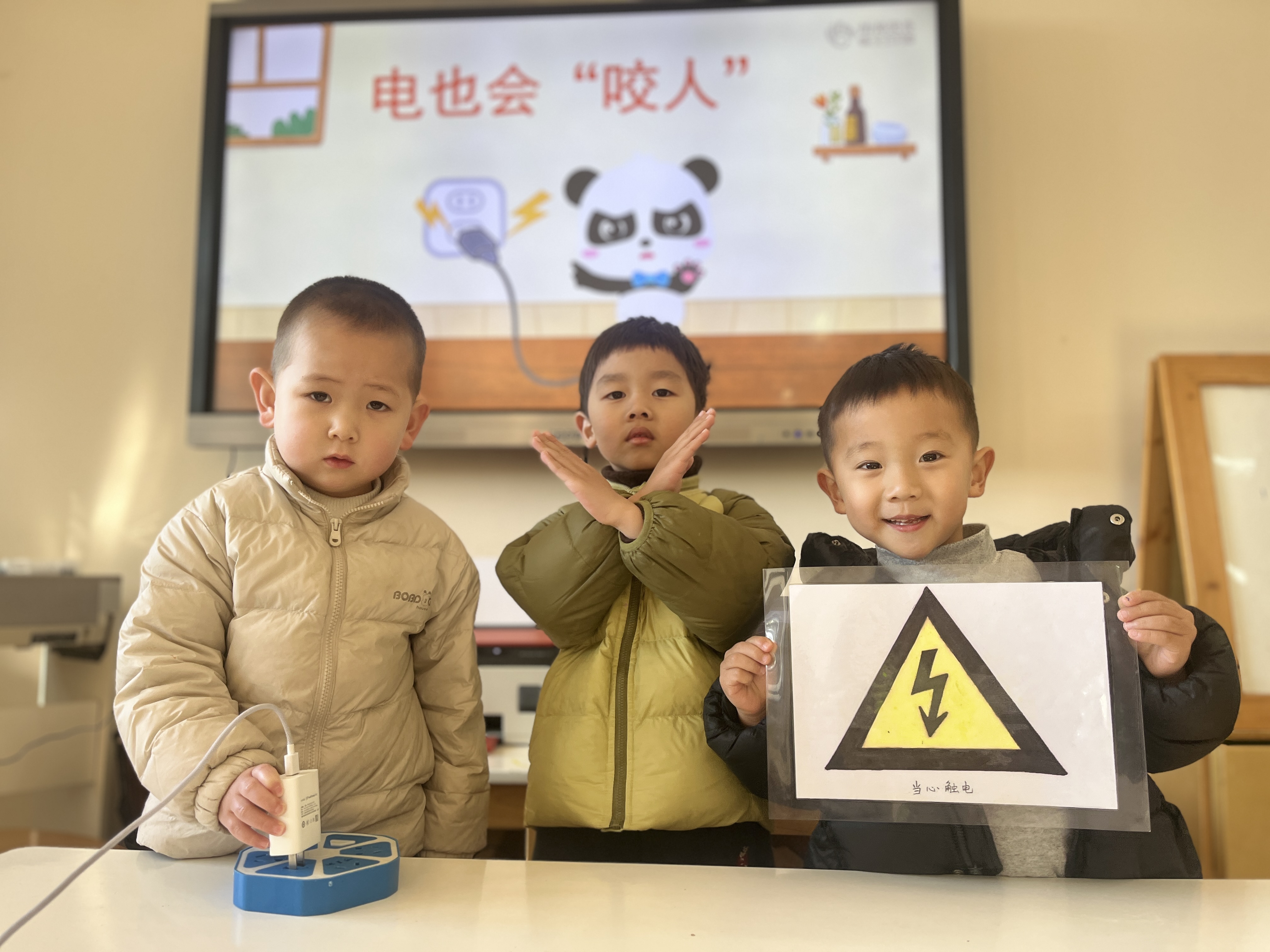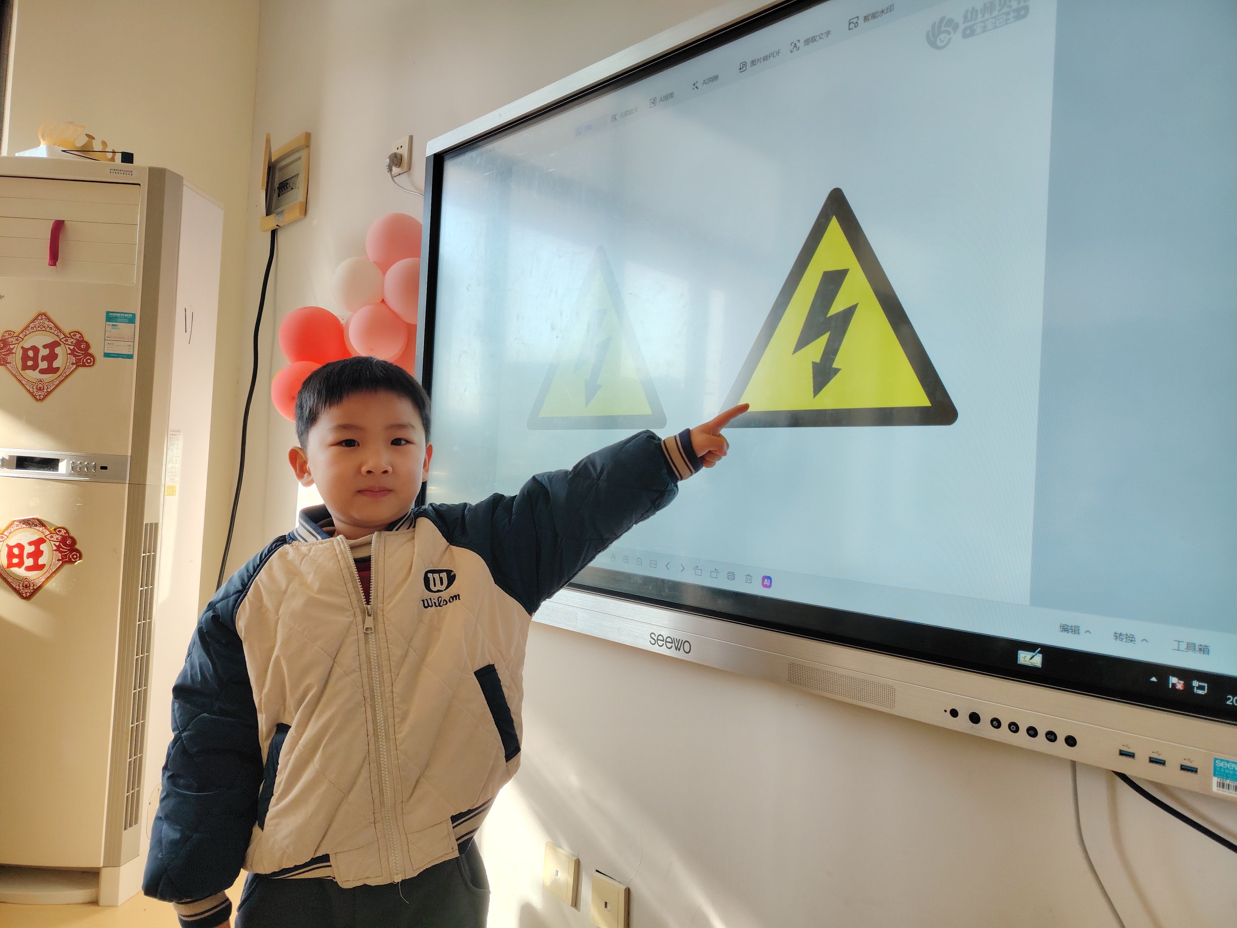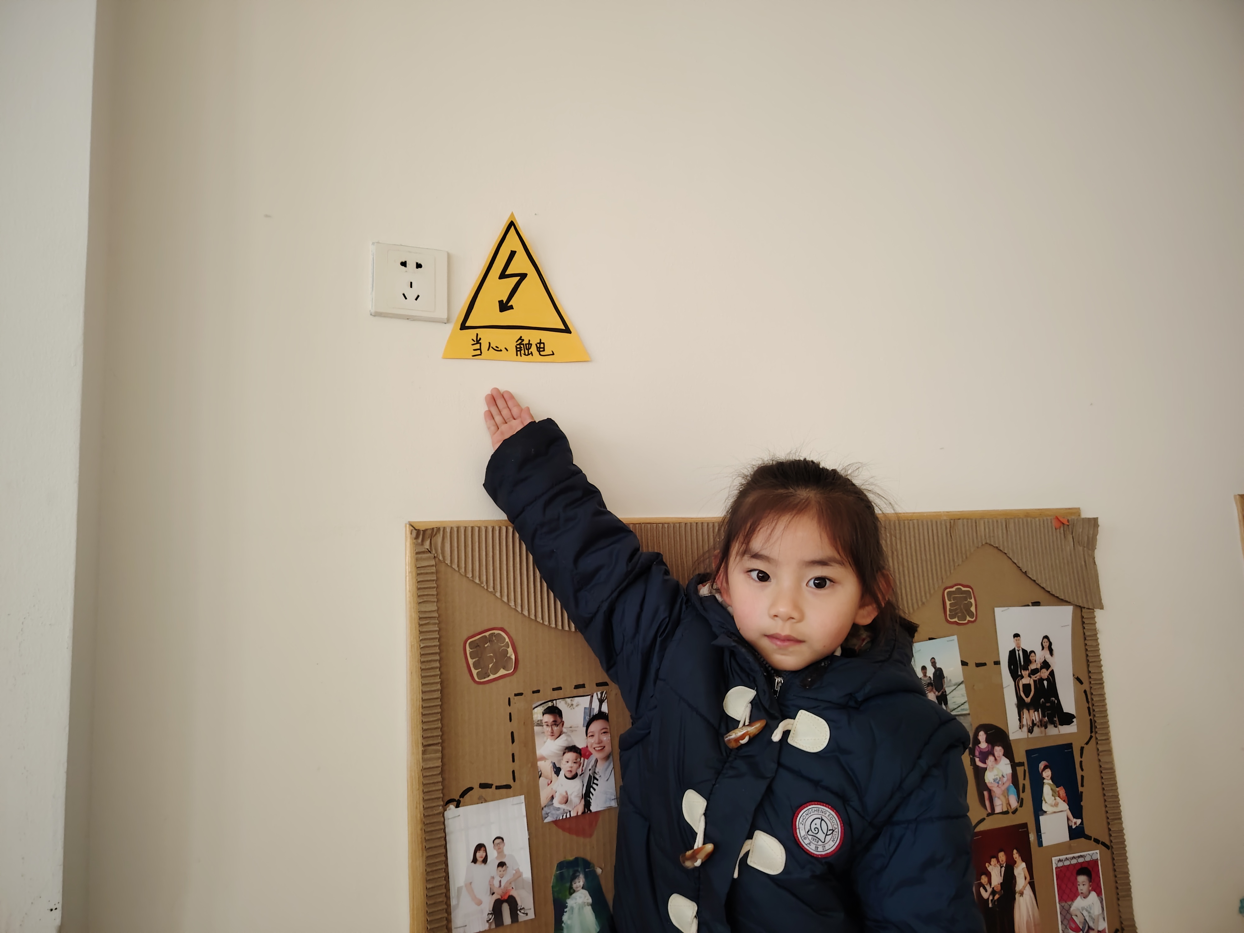 老师还展示了“当心触电”的小标志,小朋友们拿着“当心触电”的标志贴在用电危险的地方,这样就能告知其他小朋友要远离它,保护自己不受伤害。