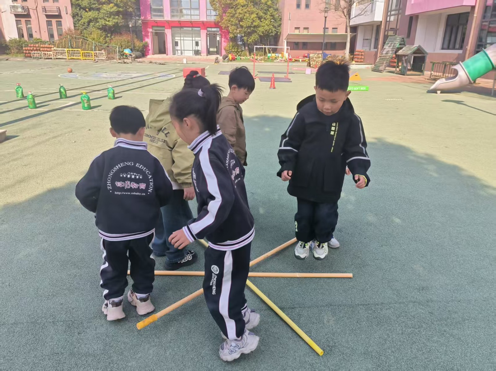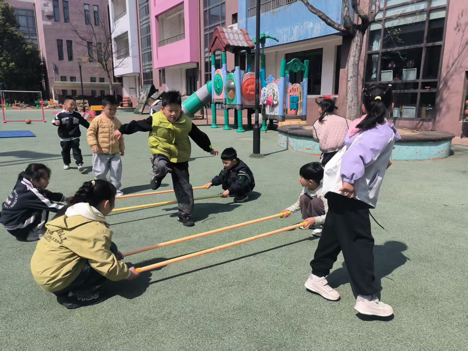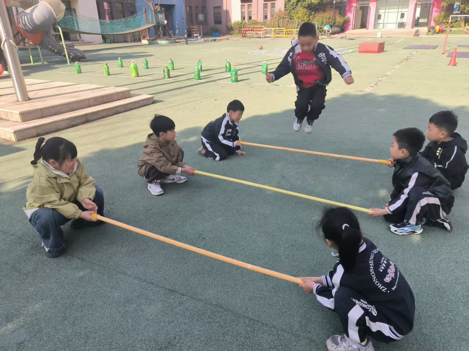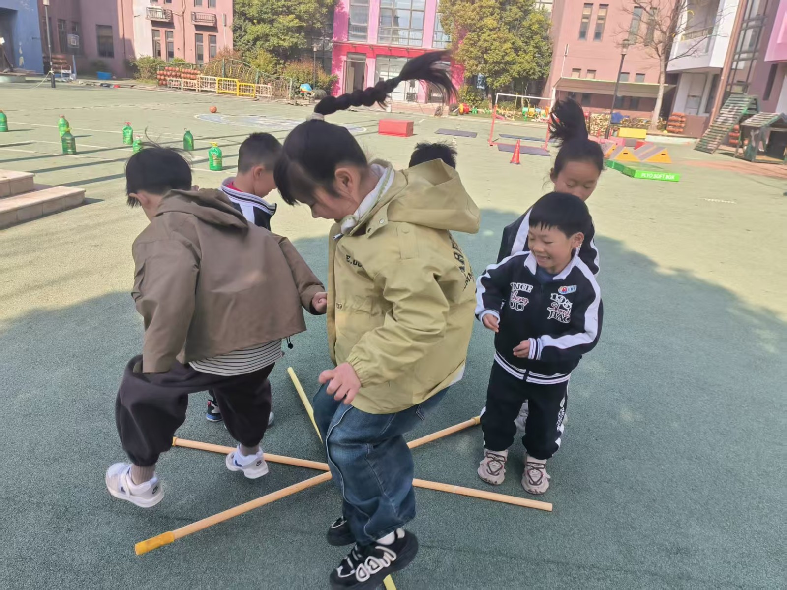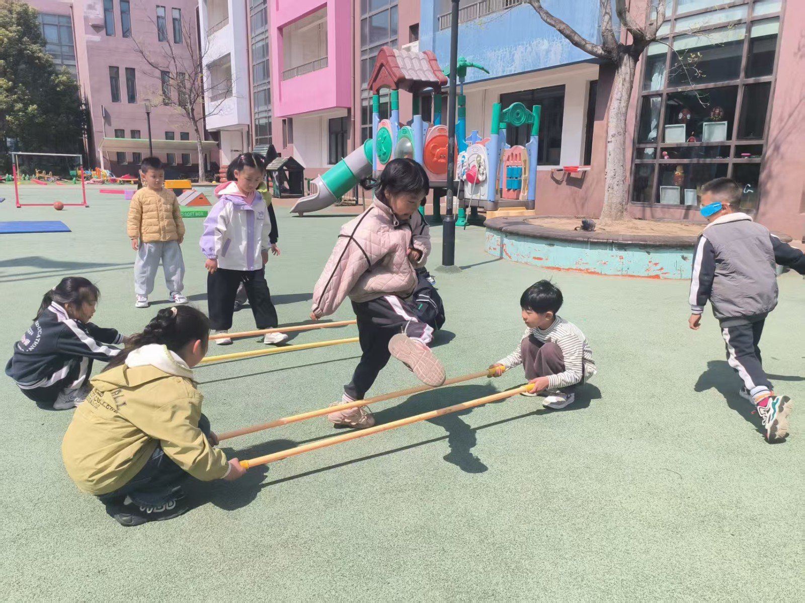 跳米字杆,将三根竹竿米字交叉放在地上,每根竹竿旁边站一个幼儿,游戏开始,幼儿有序地转圈跑或跳竹竿。