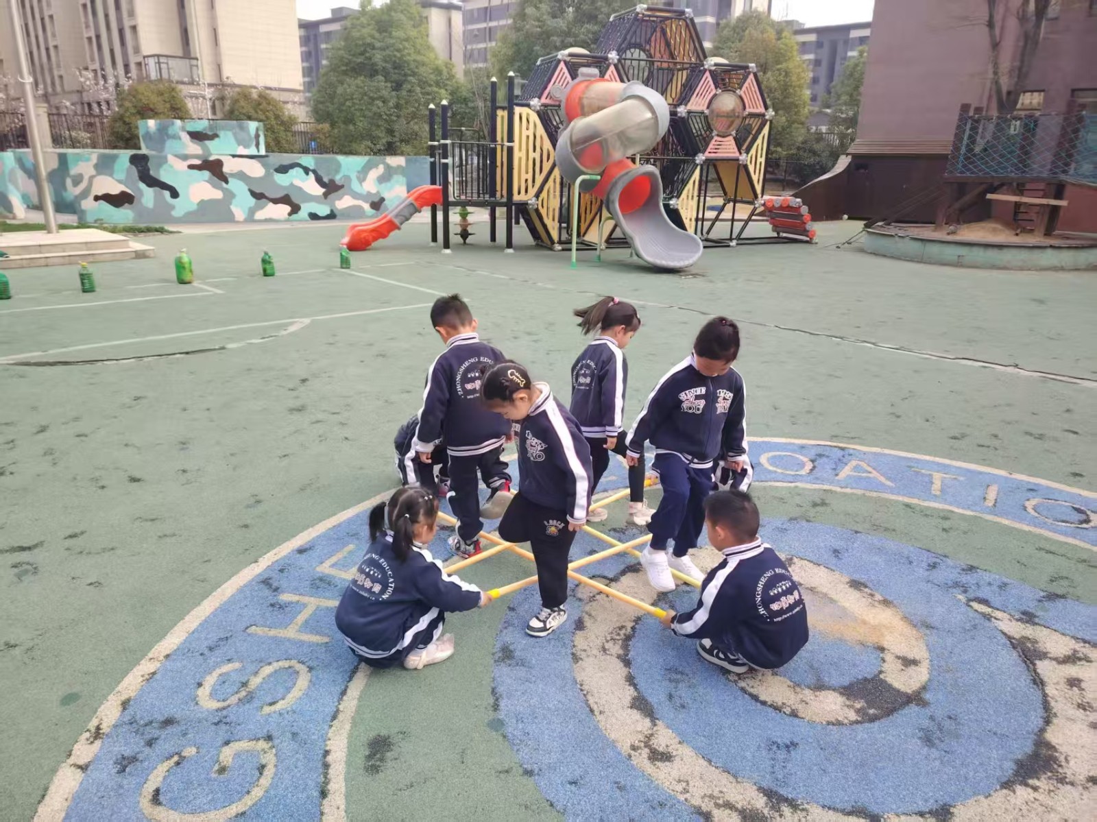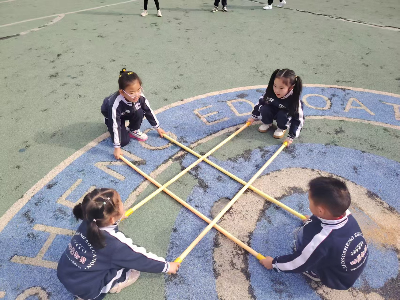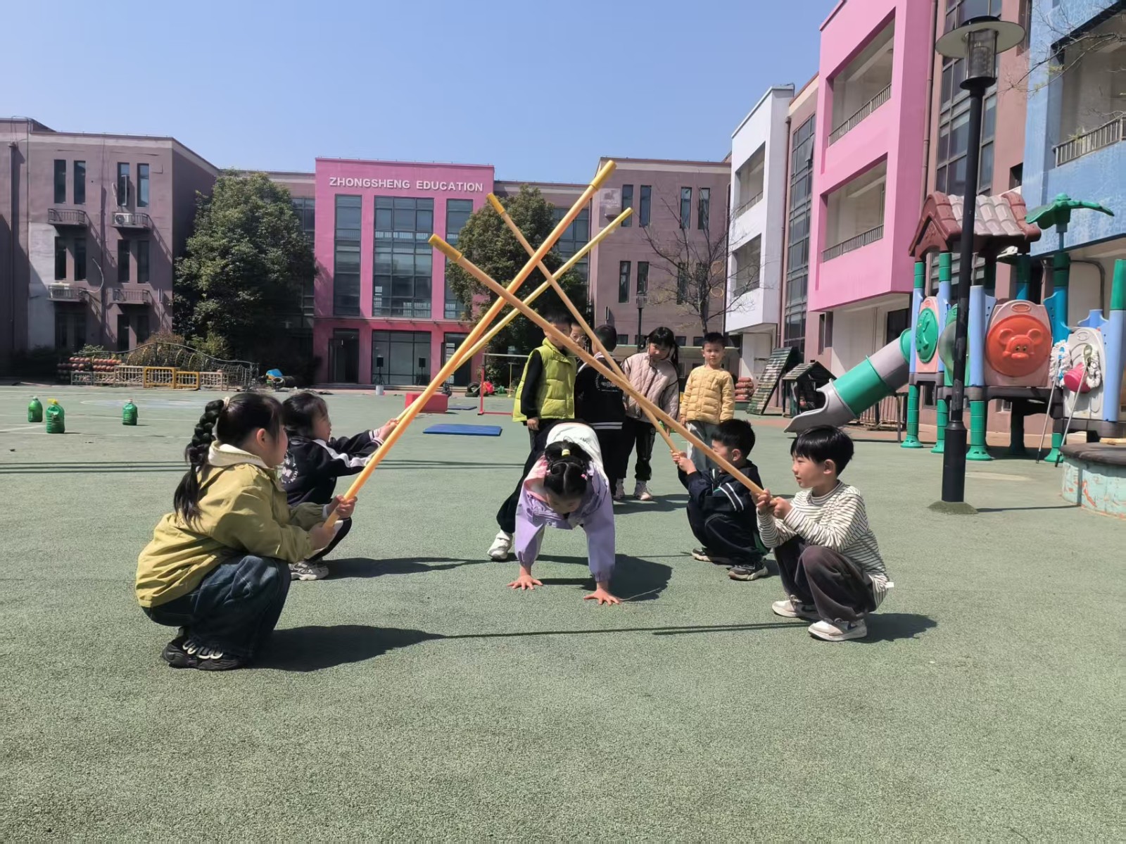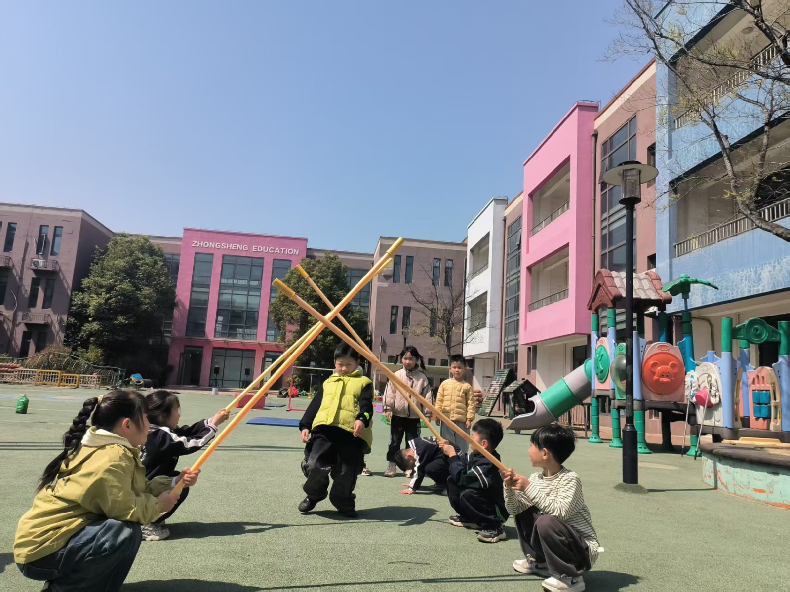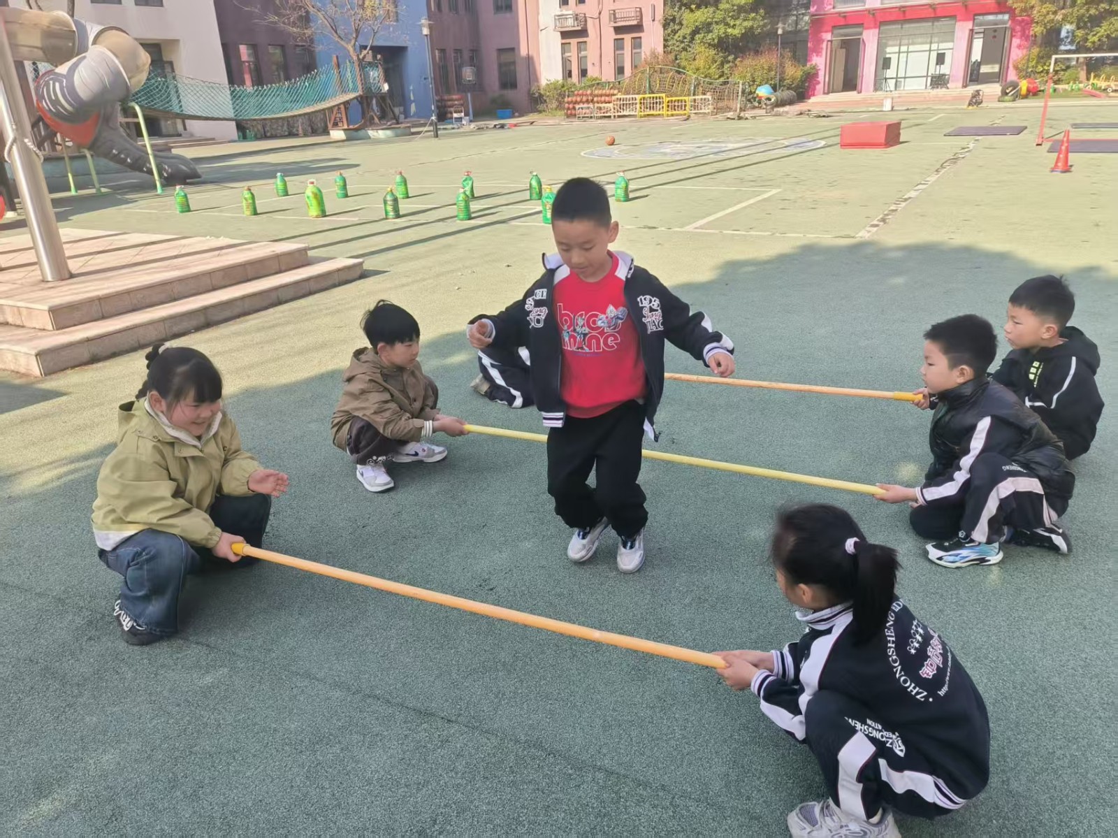 跳米字杆,将三根竹竿米字交叉放在地上,每根竹竿旁边站一个幼儿,游戏开始,幼儿有序地转圈跑或跳竹竿。