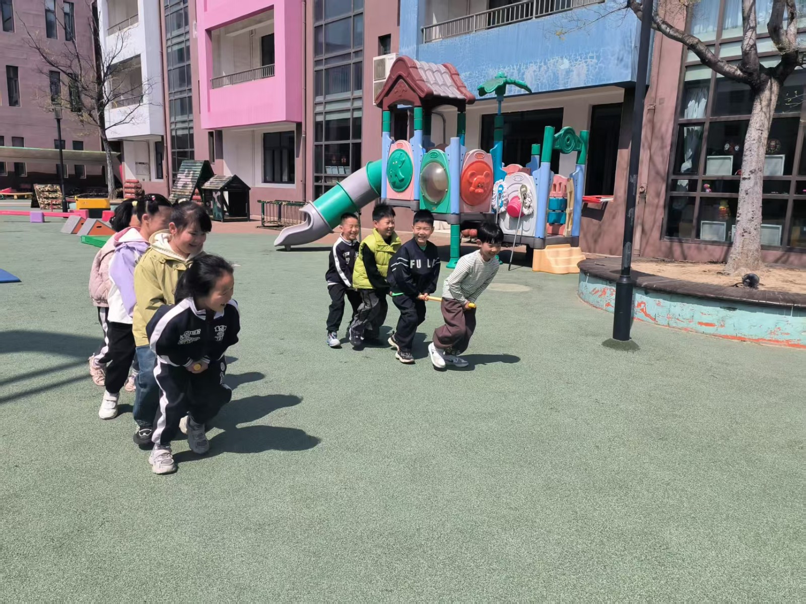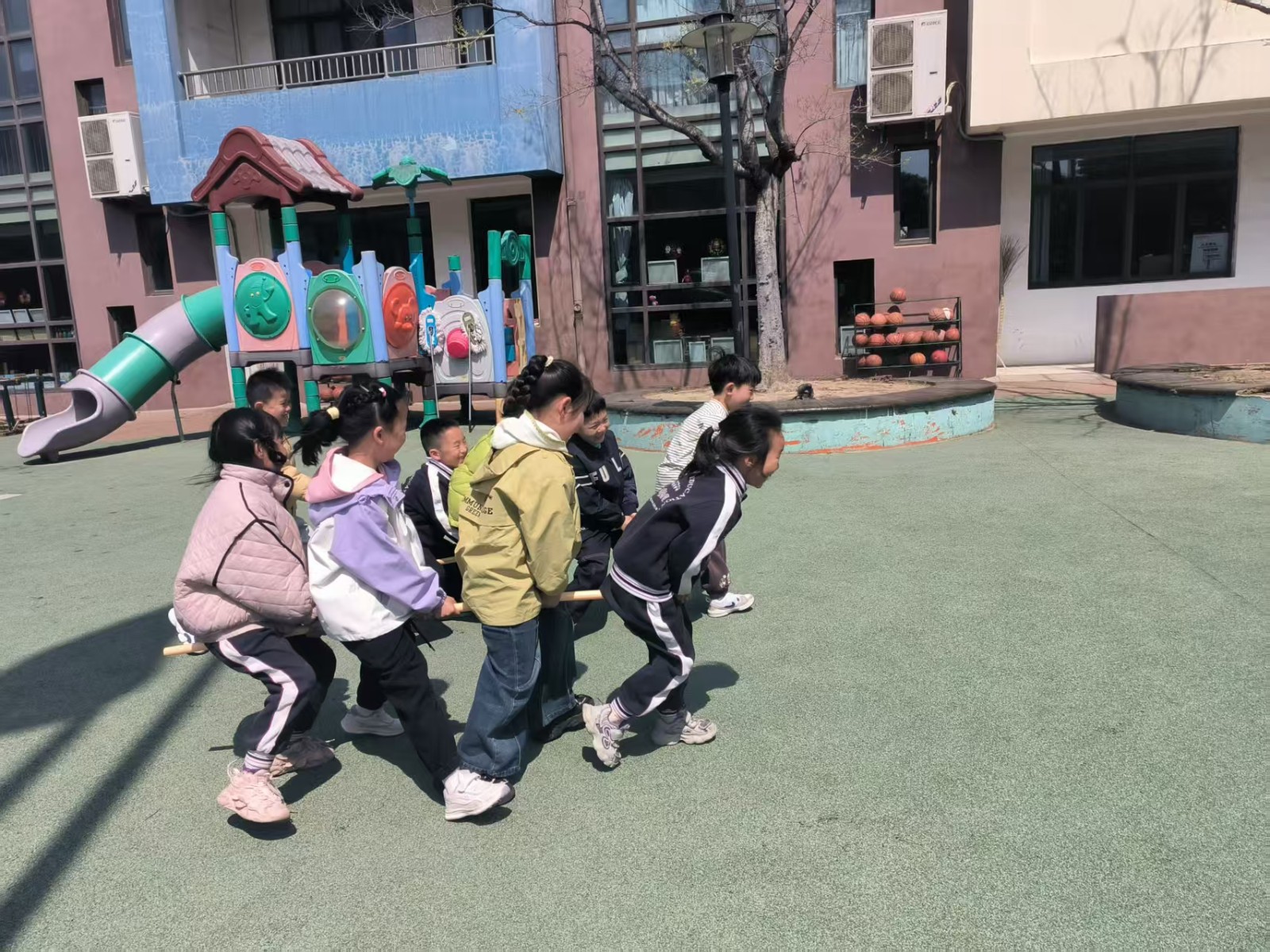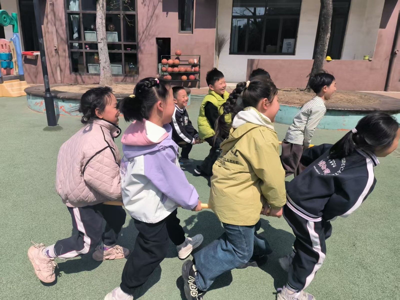 小小竹竿变竹马,一根竹子上骑着几个幼儿,大家一起协作使竹马快速前进或者移动。