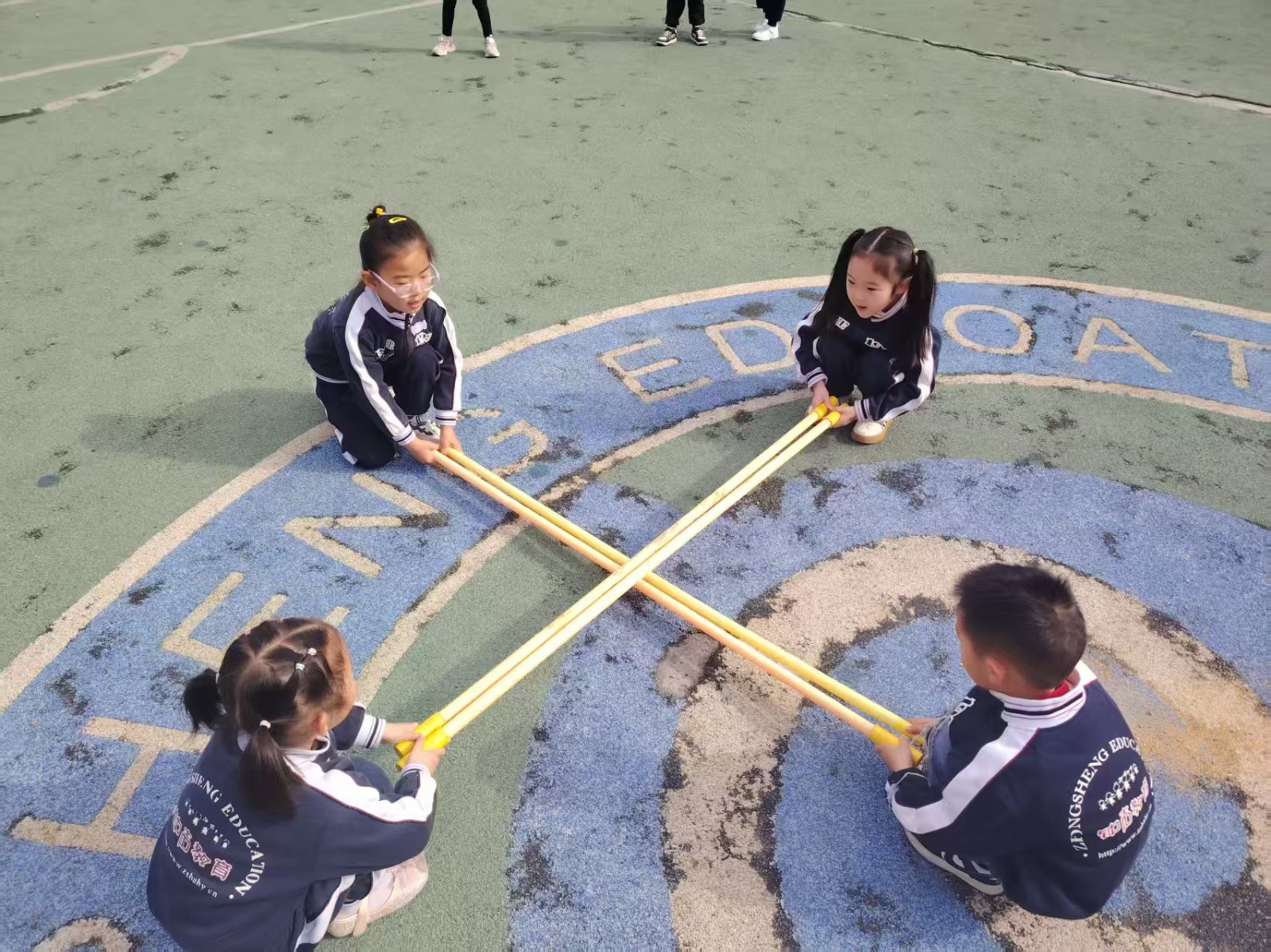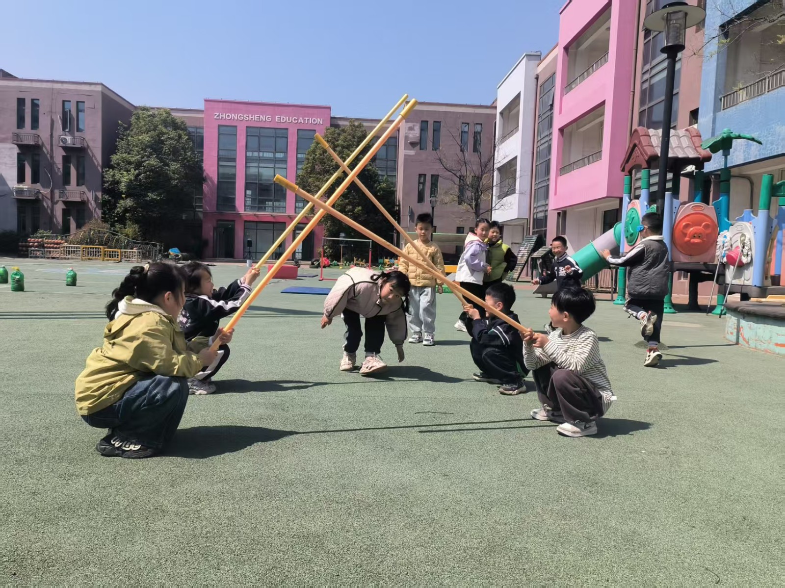 两根竹竿相距3米左右平行放好,四名幼儿两两相对,相对的两名幼儿双手各拿一根竹竿架在平行摆放的竹竿上,原地蹲下,按照“开合、开合,开开合合”的节奏左右移动竹竿并敲打下面的竹竿,其余幼儿根据竹竿的移动变化,在竹竿中来回有节奏地跳跃,避免踩到竹竿或夹住脚。