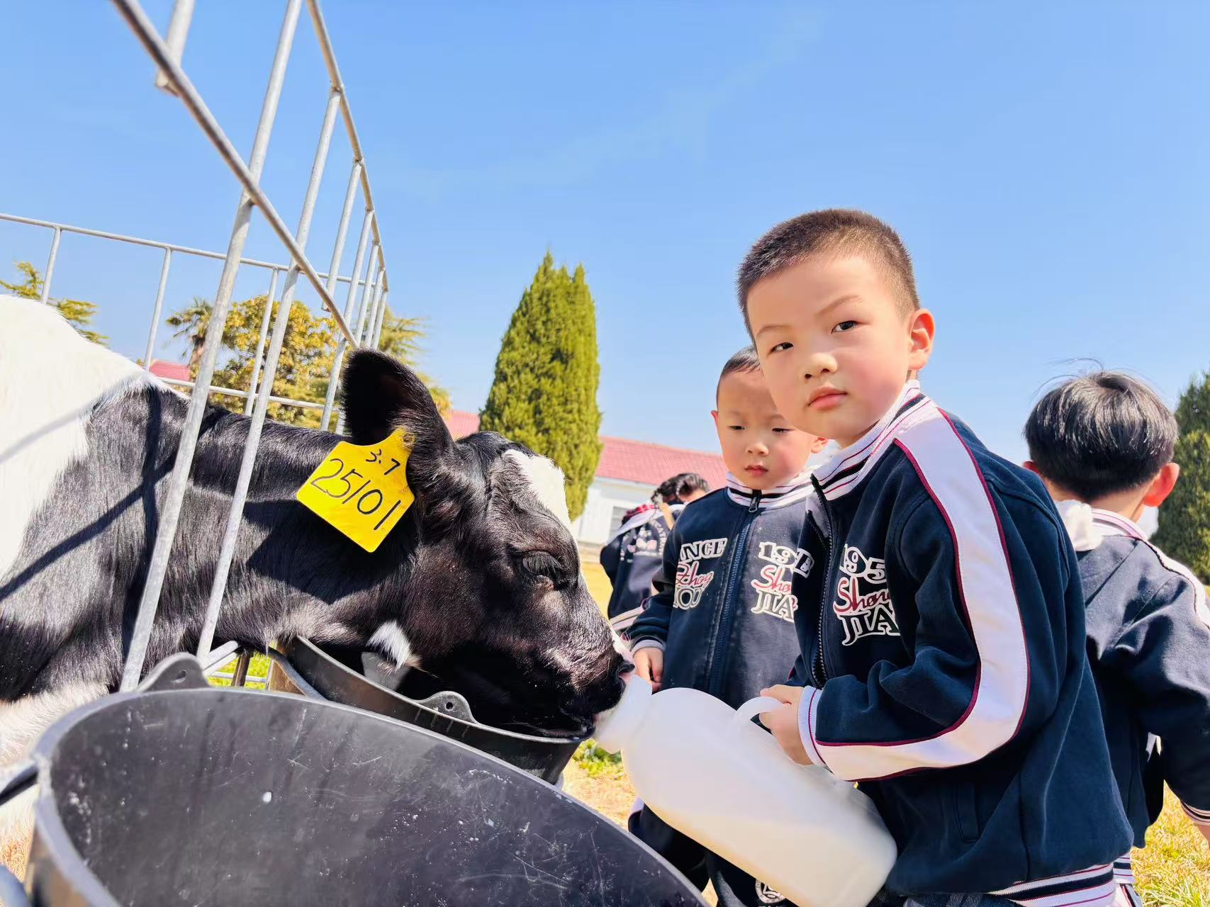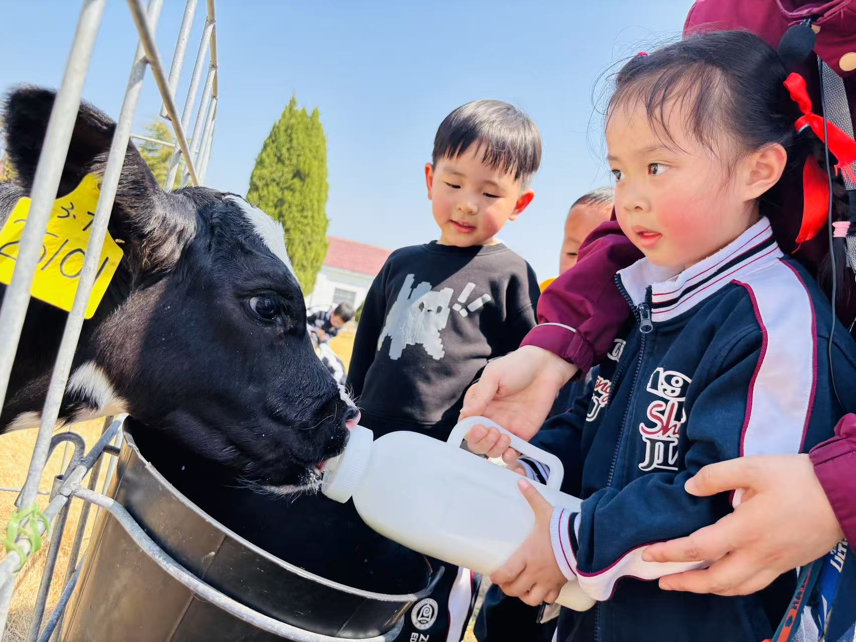 与此同时,小班宝贝在奶牛场里,面对庞大的奶牛,既好奇又害怕。在工作人员引导下,他们慢慢伸出小手,触摸奶牛。投喂时,看到奶牛大口咀嚼,孩子们拍着手欢呼雀跃。