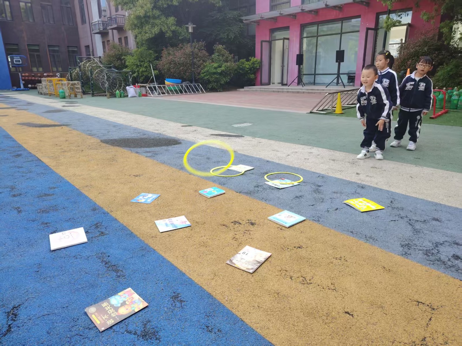 玩家站在投掷线后,手持彩圈,通过手臂力量将彩圈抛出,尝试套中地上的书籍。每人初始获得3个彩圈,不可越线投掷,违规则该次投掷无效。