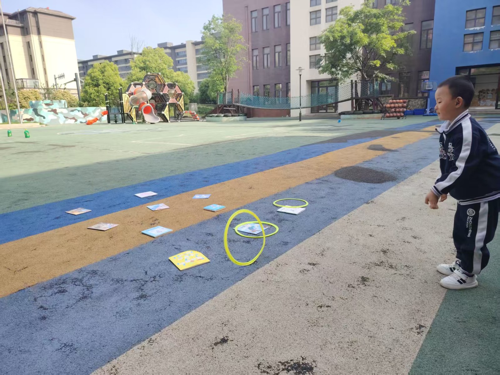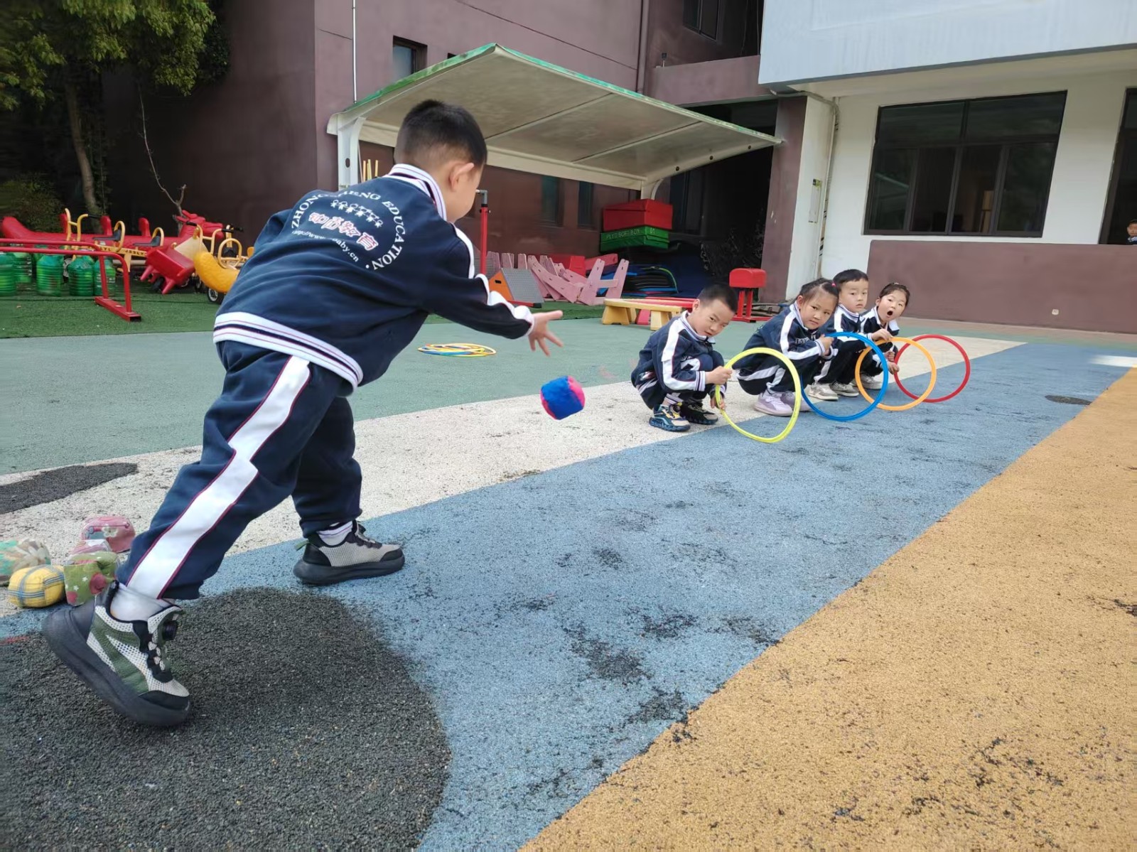 以彩色体能圈为投掷靶,幼儿用软球或沙包投圈得分,锻炼手眼协调能力与专注力,同时强化颜色与数字认知。