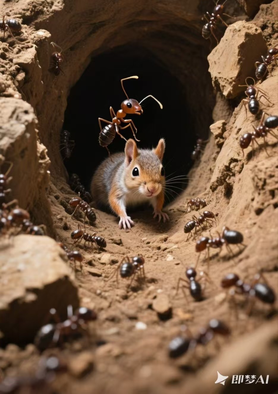 依依小心翼翼地穿过洞穴,在黑暗曲折的洞穴中,它的眼睛逐渐适应了黑暗,依依利用蚂蚁特有的感官和智慧,成功找到了小松鼠,并成功地帮助它爬出了洞穴。获救的小松鼠特别感谢蚂蚁依依,夸它是蚂蚁家族的英雄。