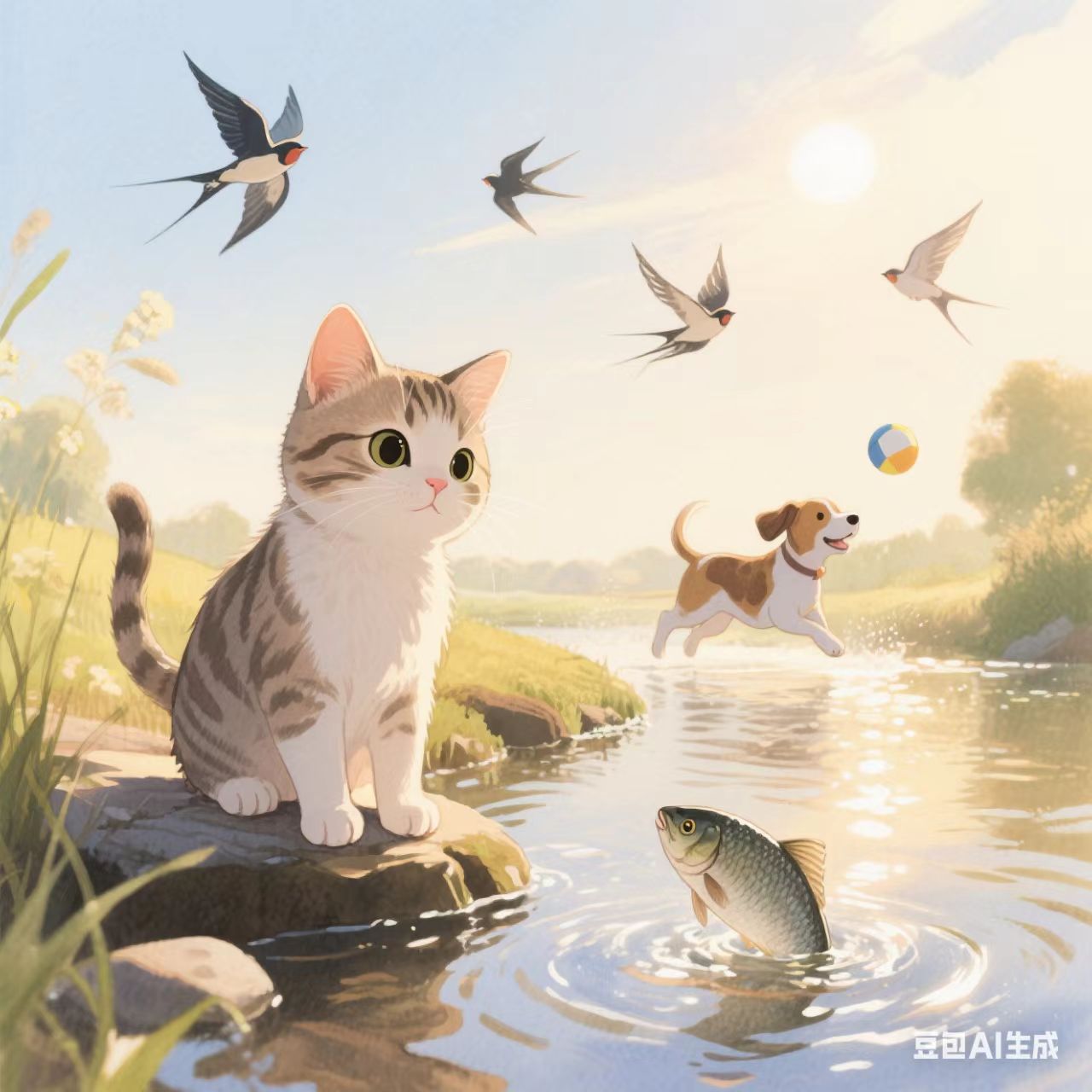 直到有一天,咪咪在河边看到鱼儿在水中欢快地游来游去,它突然灵机一动,决定学习捕鱼。咪咪开始观察鱼儿的游动模式,学习如何潜入水中,如何快速而准确地捕捉到鱼。它每天练习,不断地调整自己的技巧。