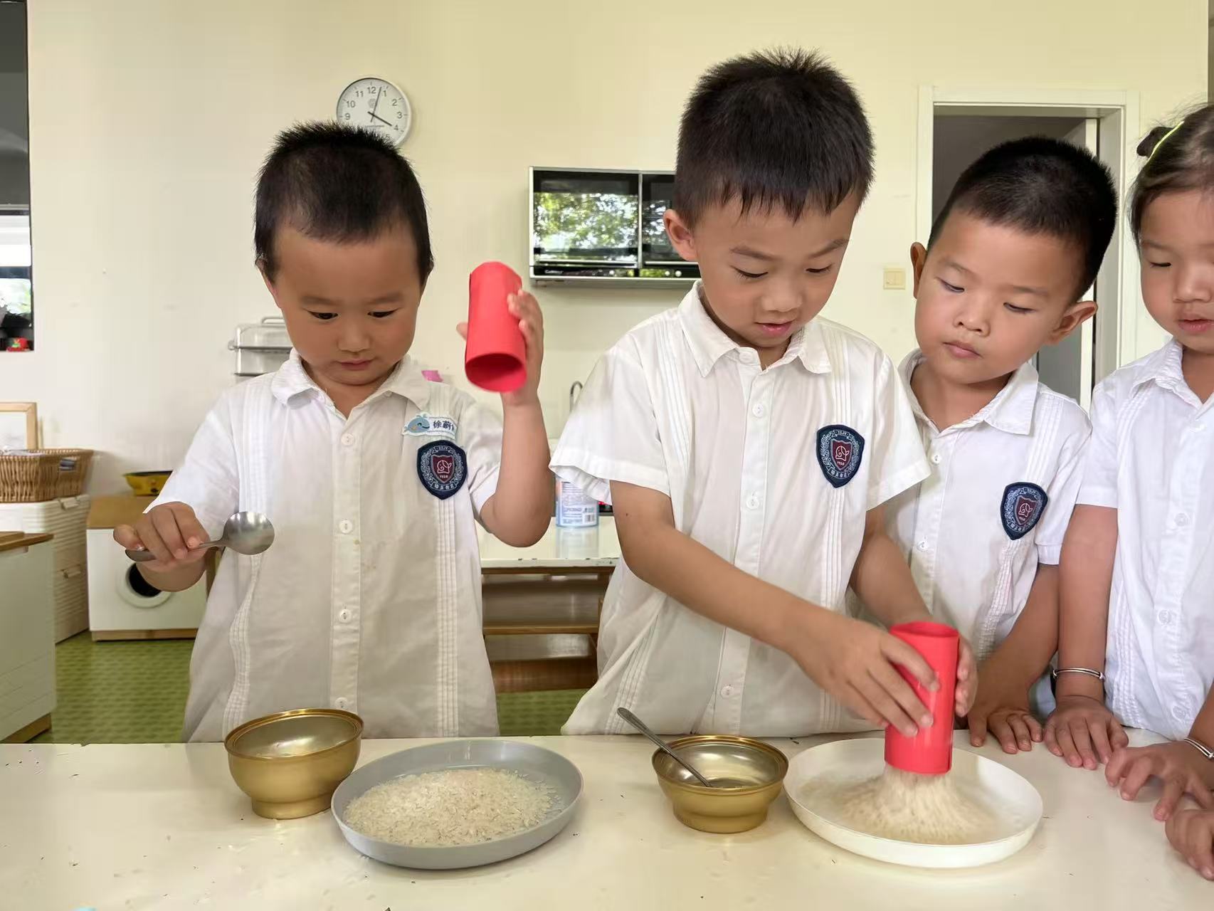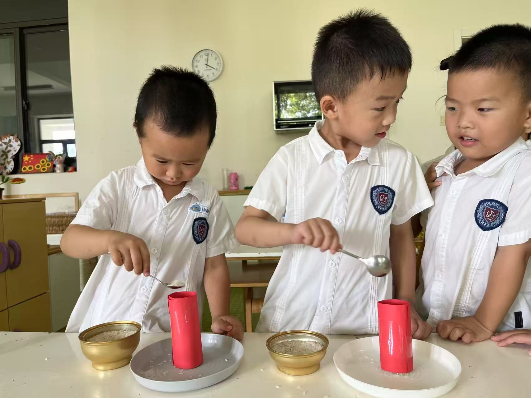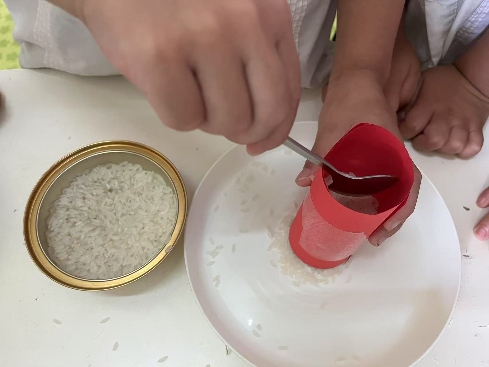 把纸卷成桶,用胶带固定好形状立在盆里,假装这个纸筒是粮仓,然后和孩子一起用杯子,把大米、绿豆之类粮食到入粮仓,等粮仓满了,让孩子抽出纸筒,这时候你的粮食就会哗啦啦的散落到盆里,这能给孩子带来丰富的视听刺激。